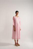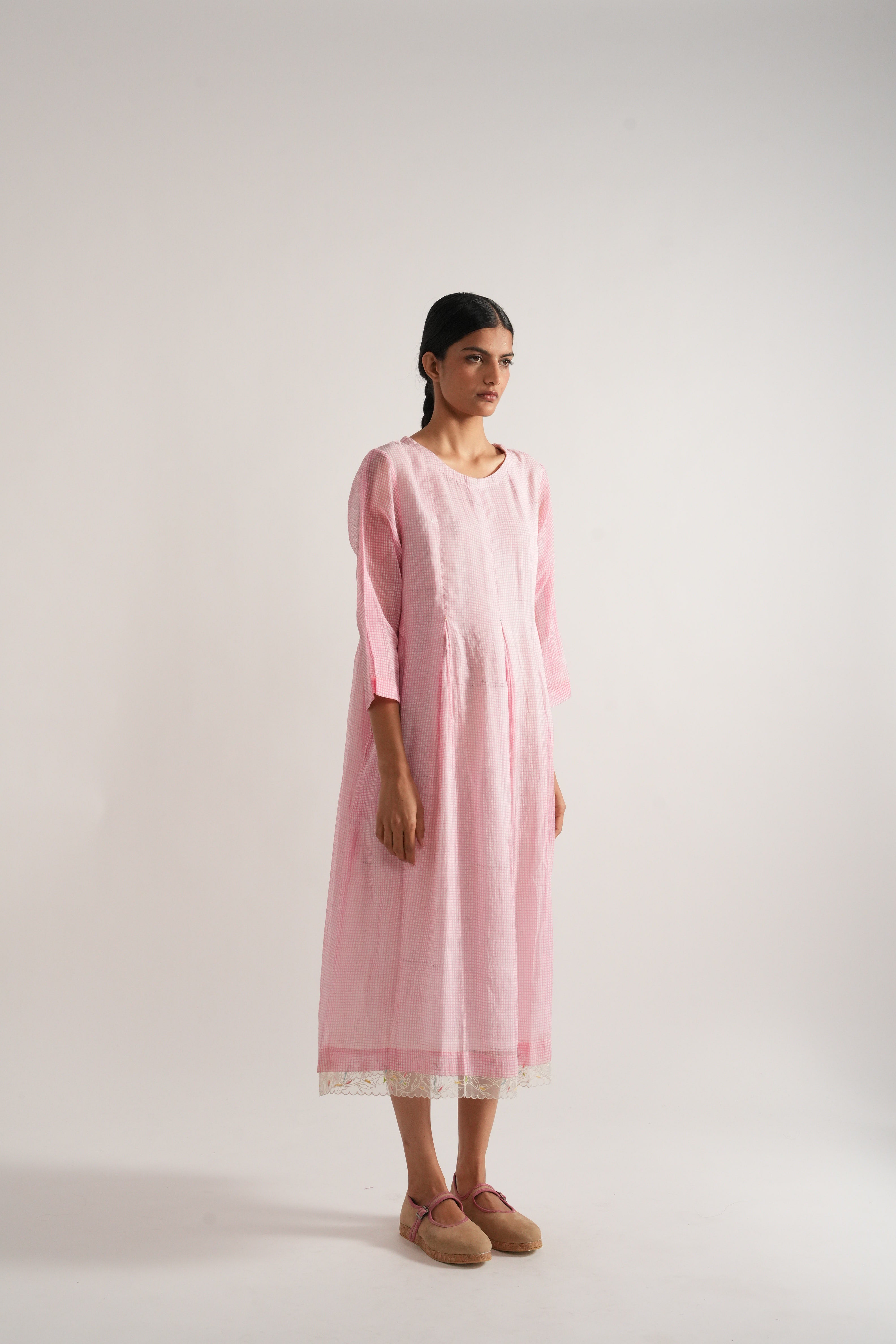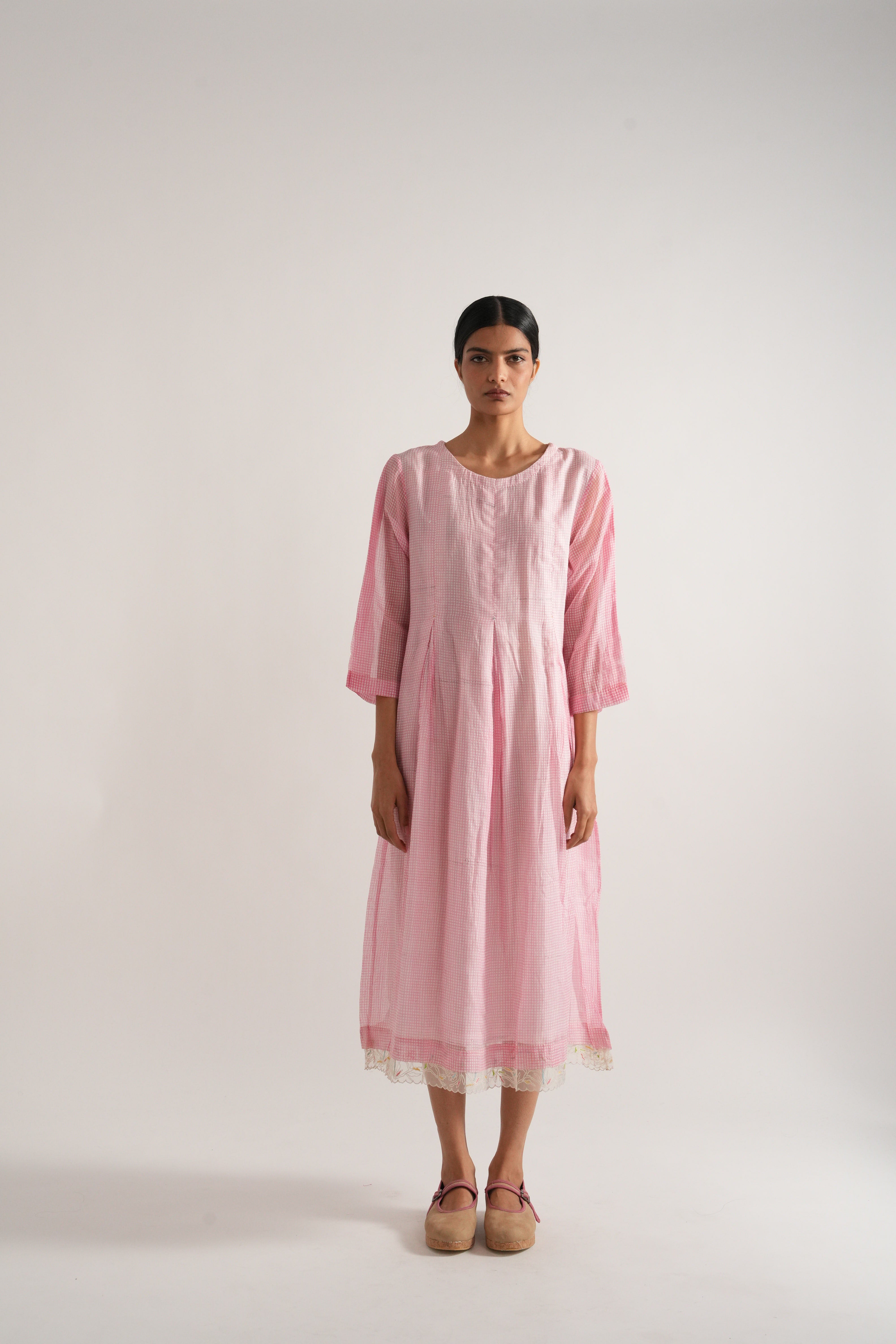 Flared relaxed fit kurta dress with inverted pleats in hand block printed fine checks on handwoven kota