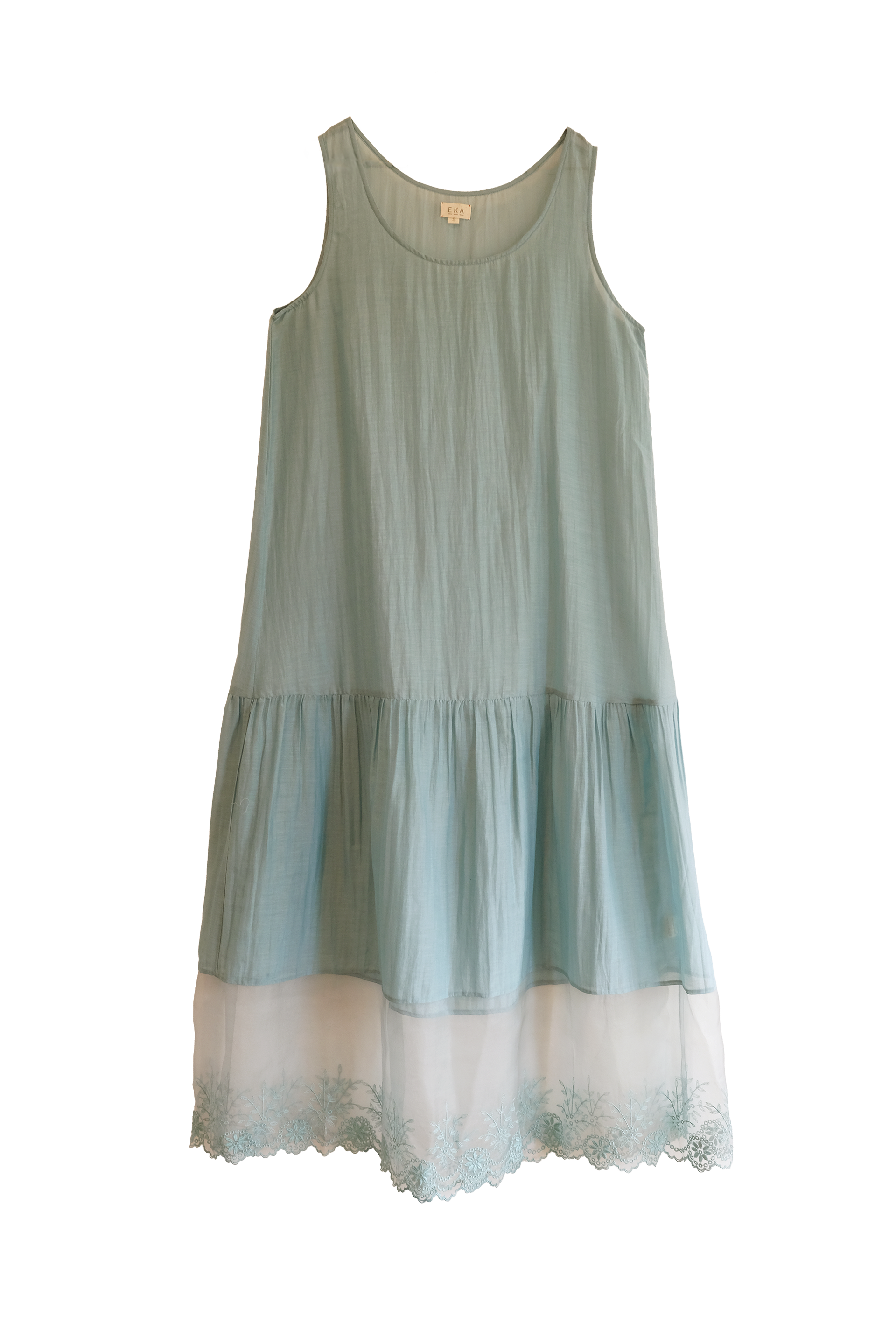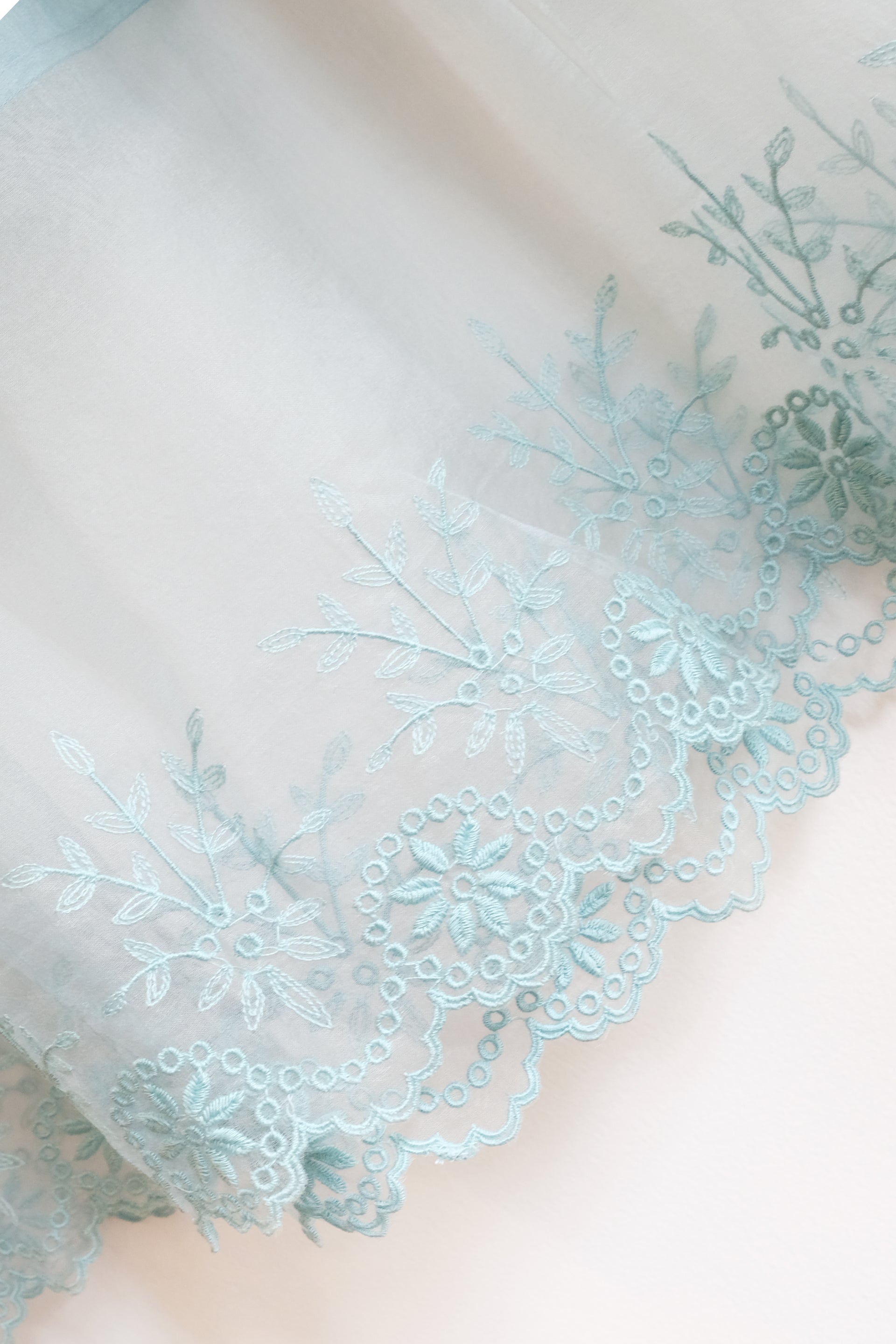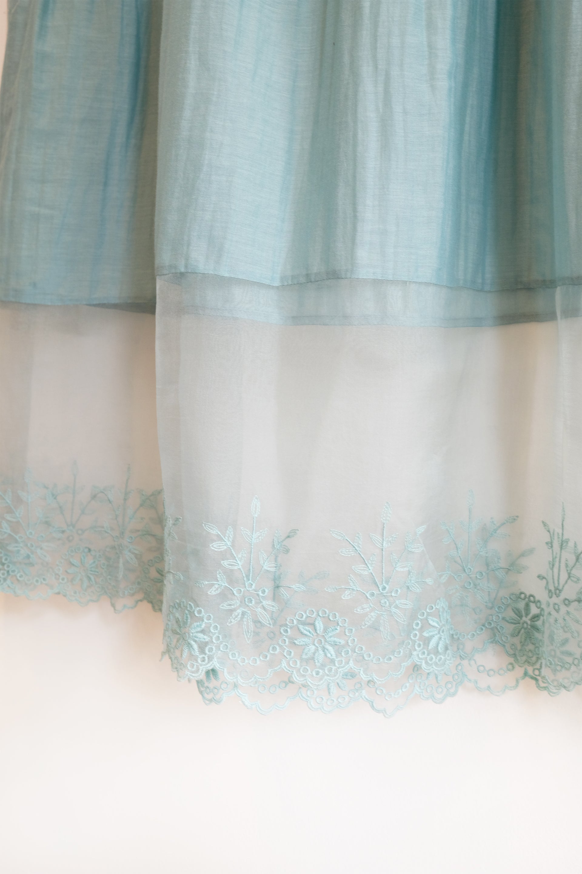 A tiered lining in cotton silk, adorned with an embroidered organza trim along the hem, beautifully highlighted by intricate thread and zari work throughout.