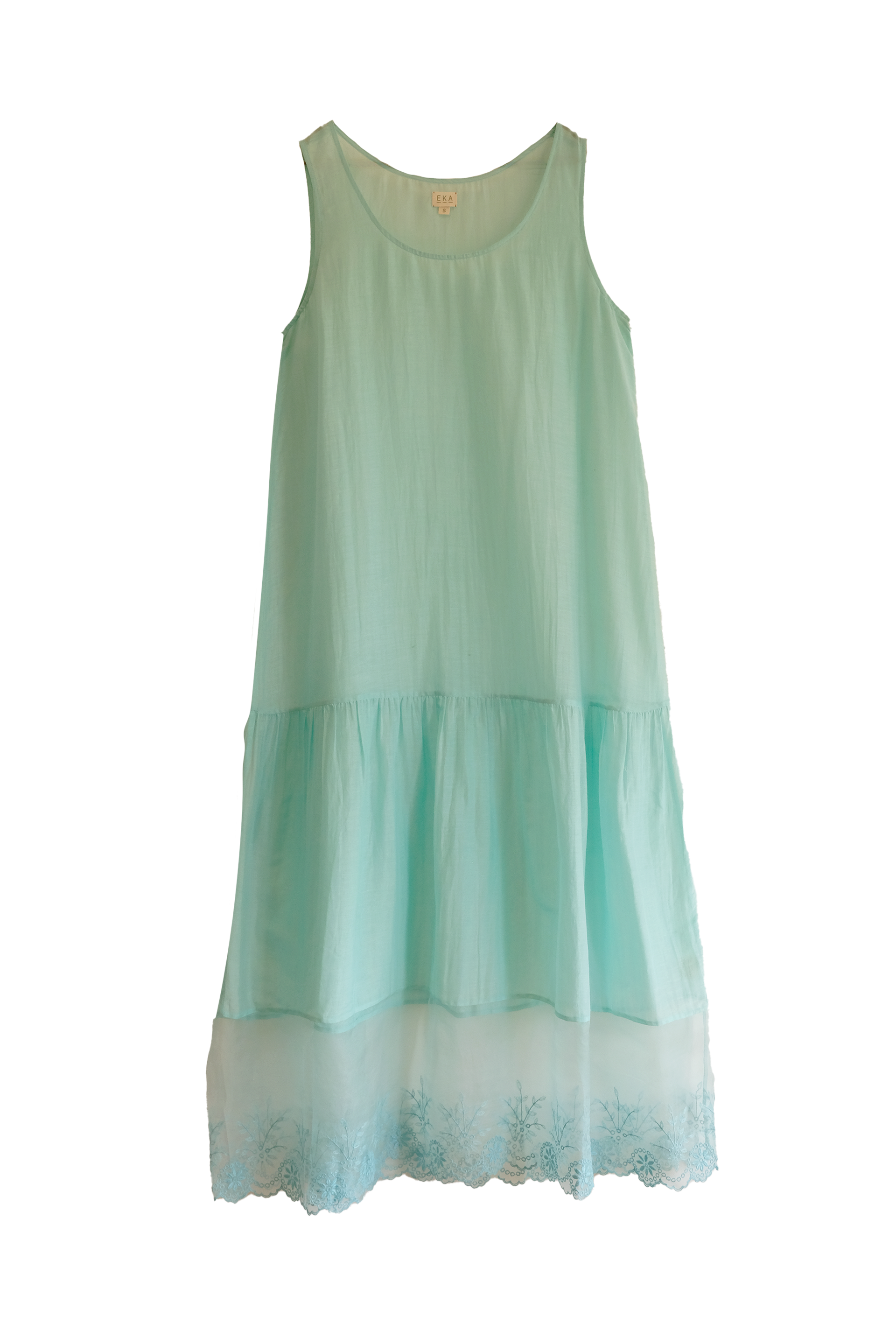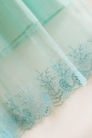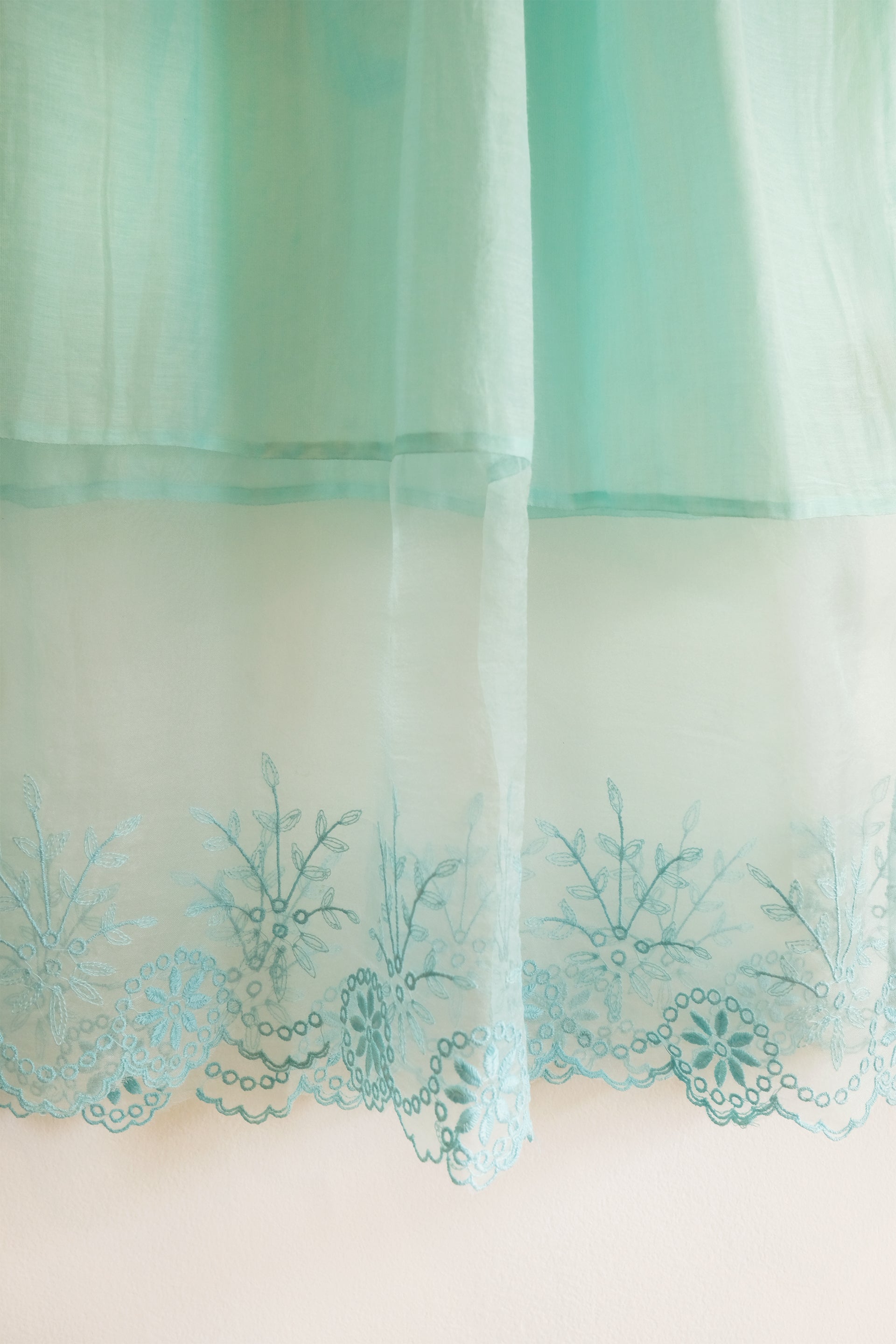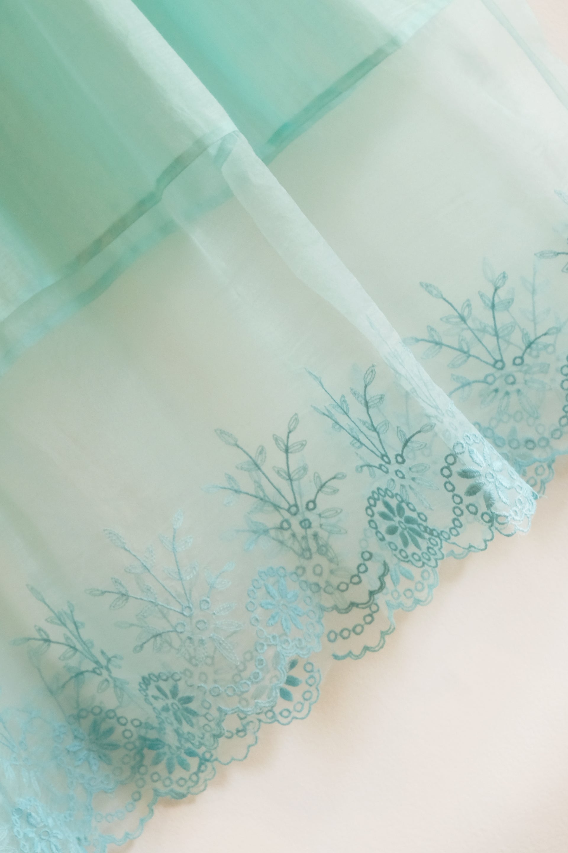 A tiered lining in cotton silk, adorned with an embroidered organza trim along the hem, beautifully highlighted by intricate thread and zari work throughout.