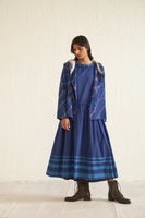 Blue short jacket in pure merino wool with diagonal floral jacquard design. Comes with attached blue abstract striper printed pure silk lining