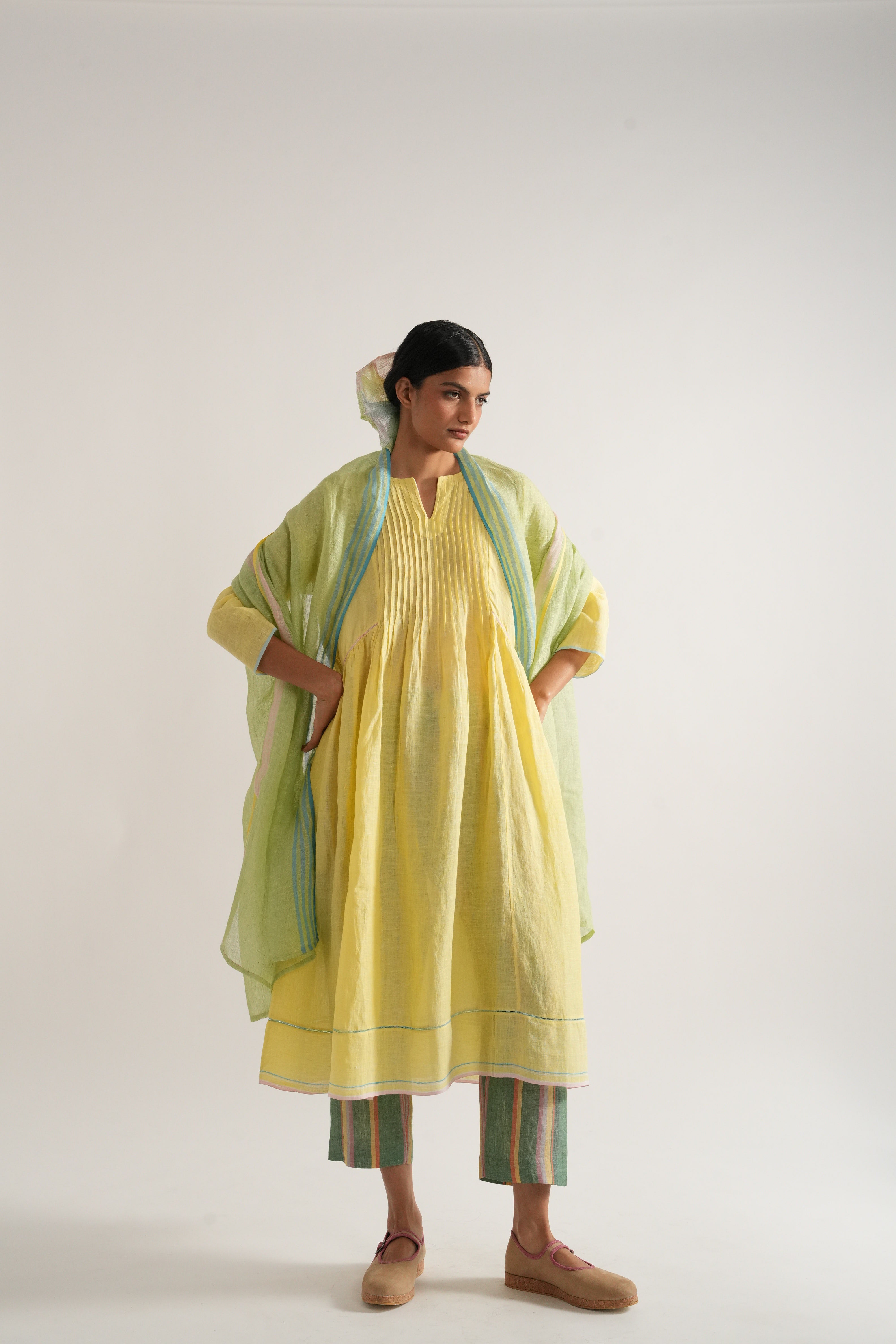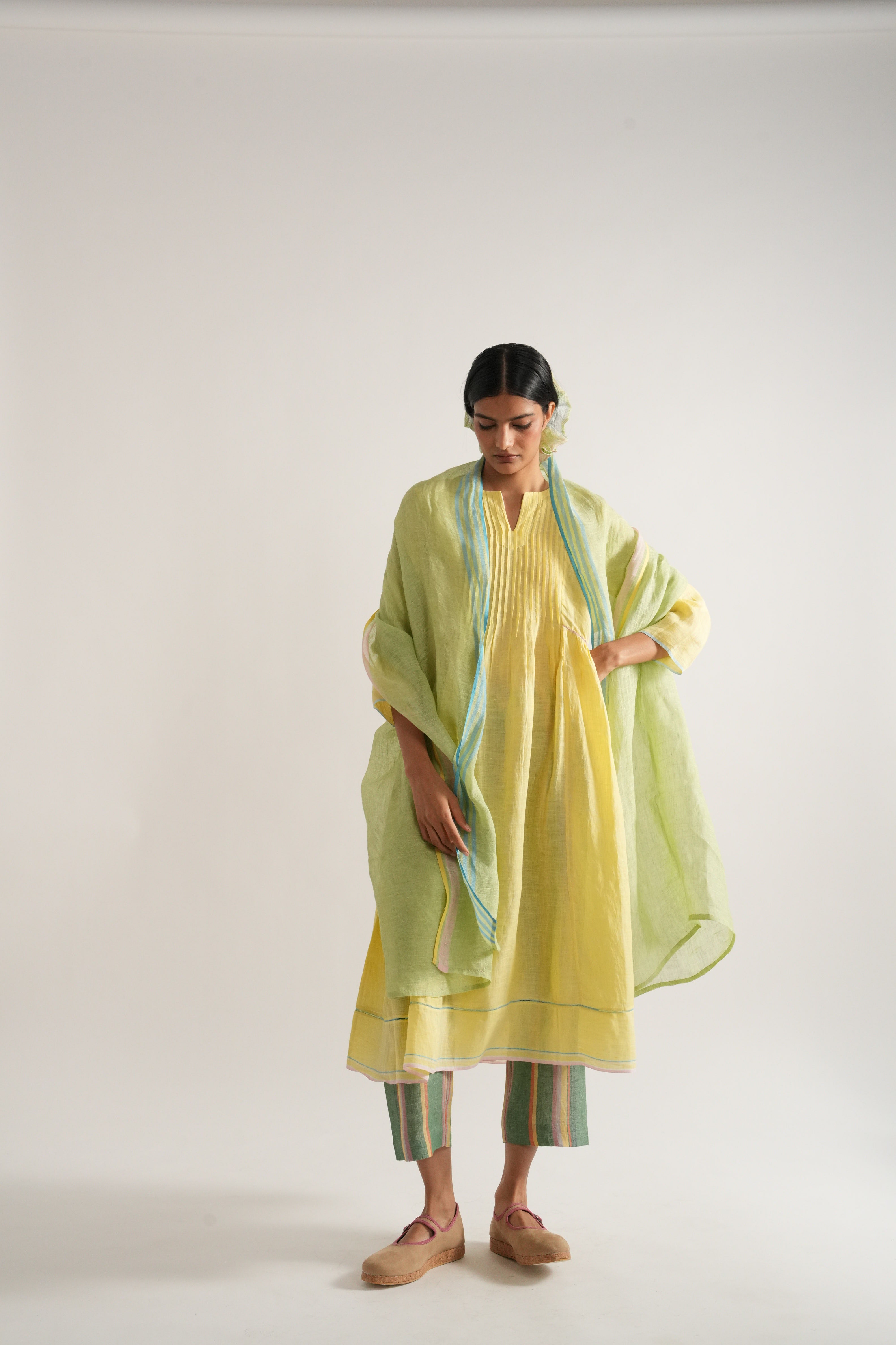 Stole in solid handwoven linen gauze with contrast yarn dyed stripes border and selvages