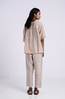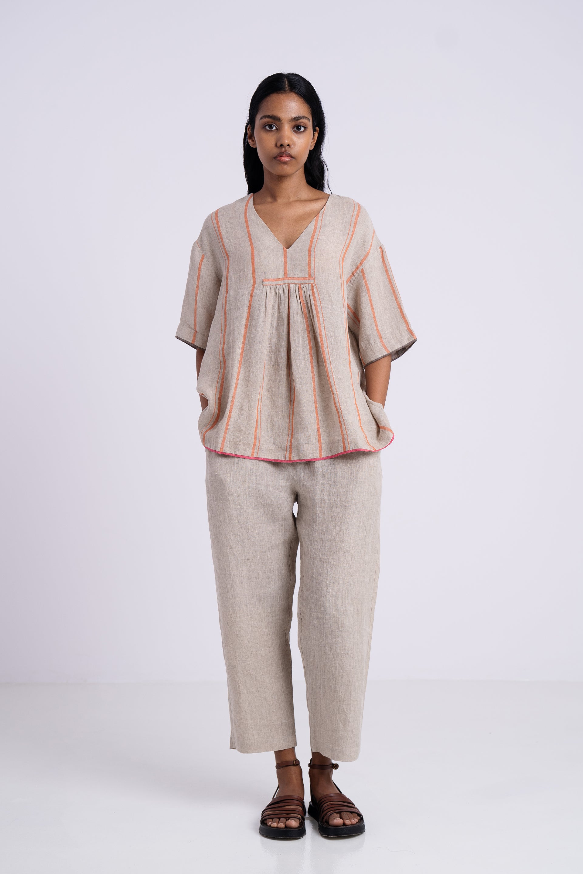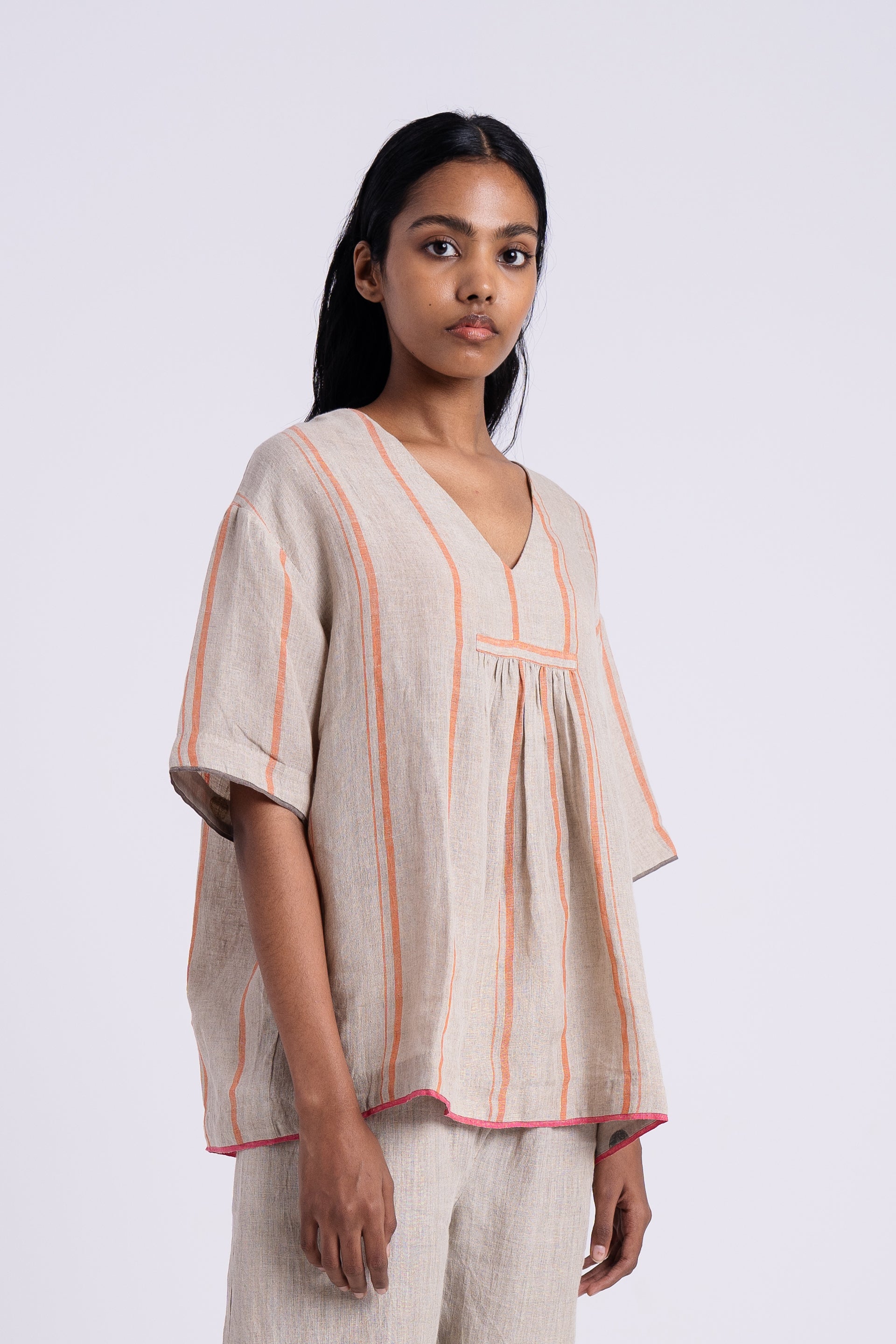 V-neckline short sleeve straight fit top with light gather detail on the center front and contrast selvedge detail on hem and sleeve. Constructed in self striper 100% linen fabric.
