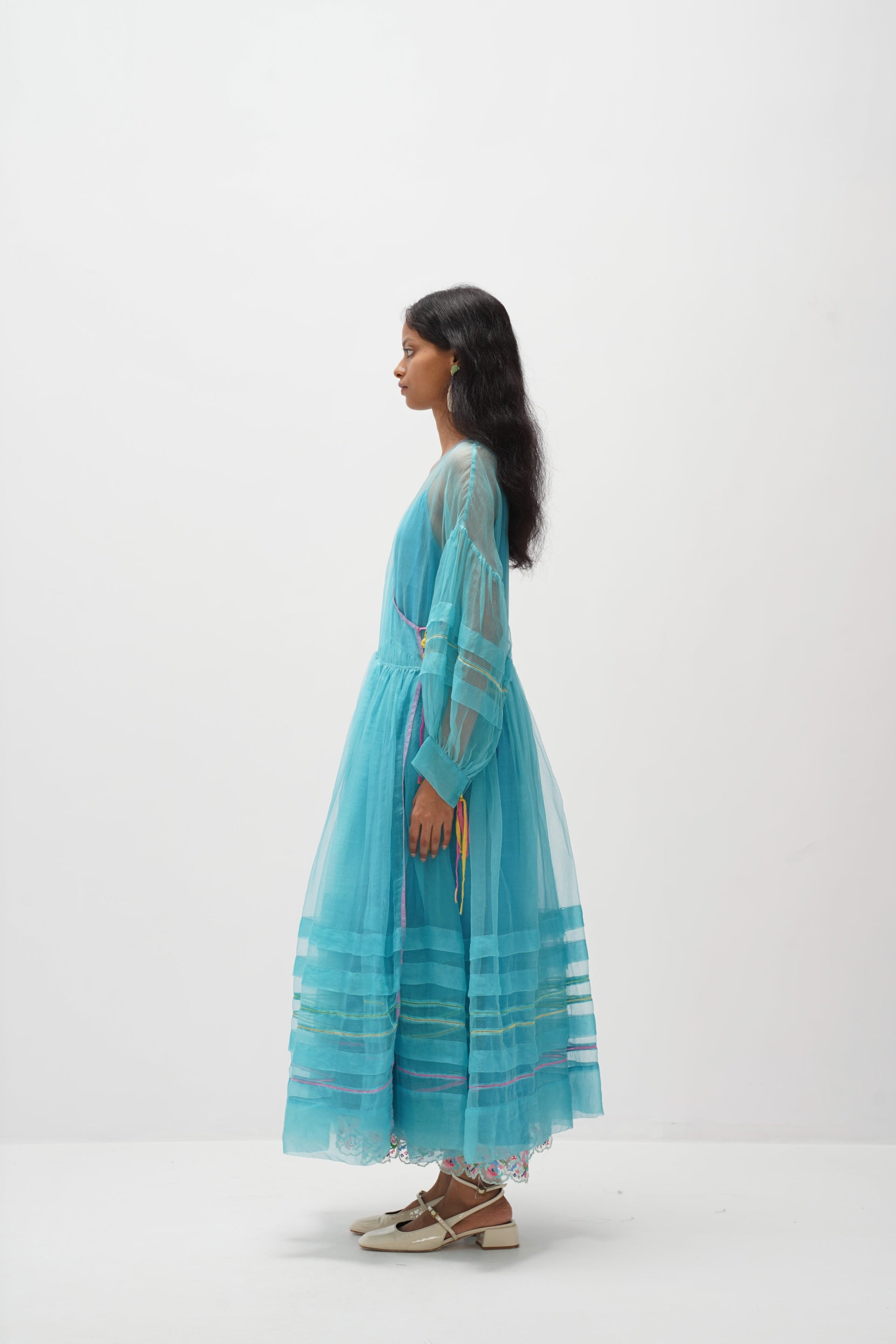 Pleat detail wrap dress withcontrasting colour piping tye ups and ladder lace inserts. Comes with a solid blue cotton silk lining along with a multicolor embroidered trim at the hem.