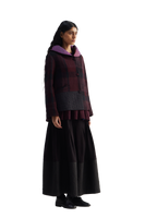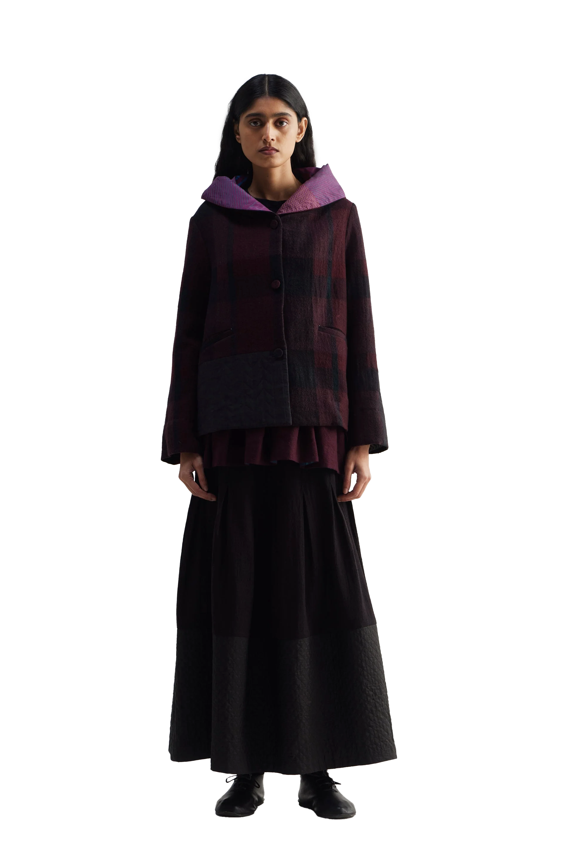 High waist inverted box pleat maxi length skirt. Constructed in patchwork of solid 100% wool silk linen and quilted 100% silk fabric. Finished with 100% solid silk lining.