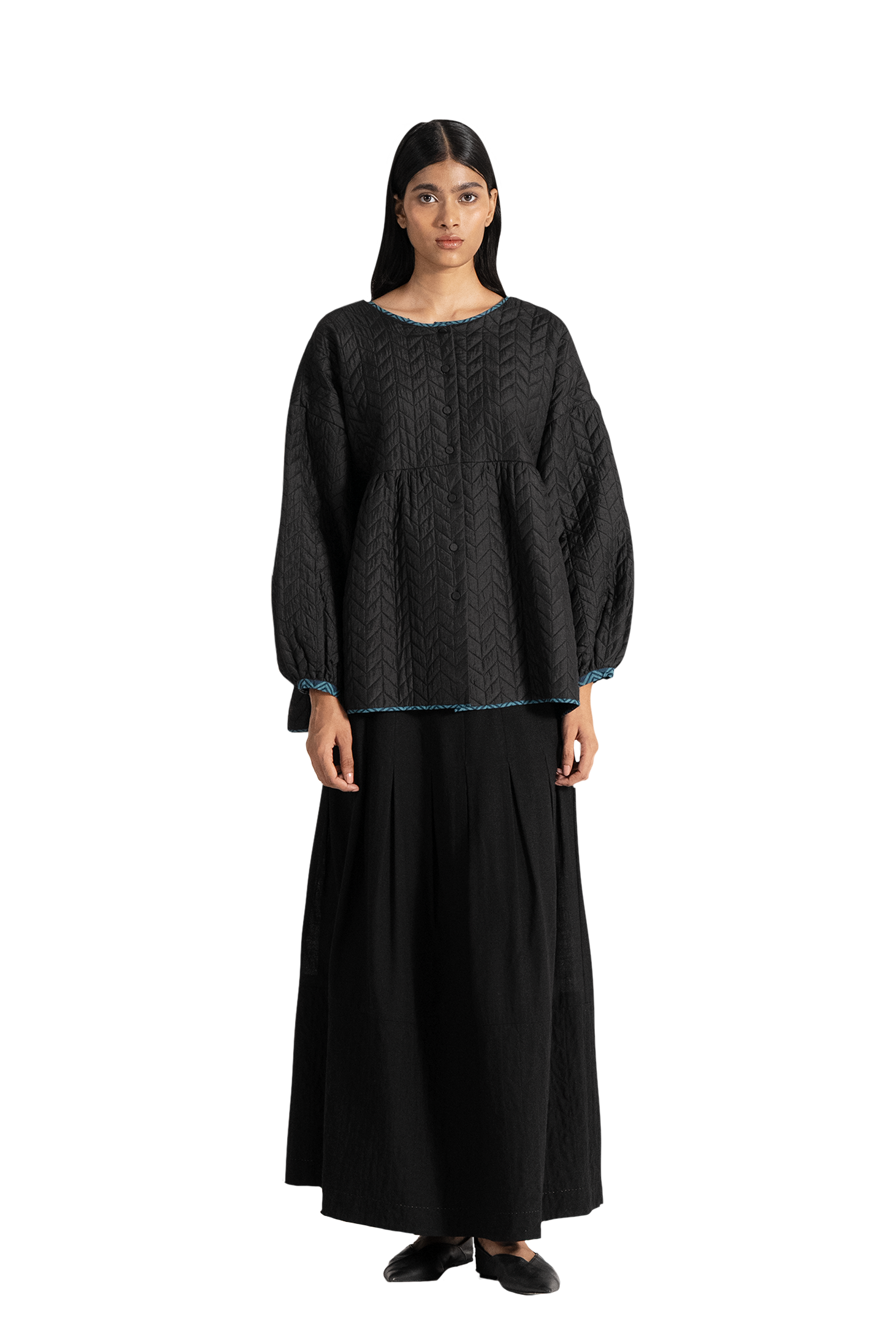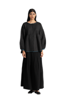 High waist maxi length skirt with inverted box pleat in wool silk linen and quilted 100% silk on hem. Lined with 100% silk lining.