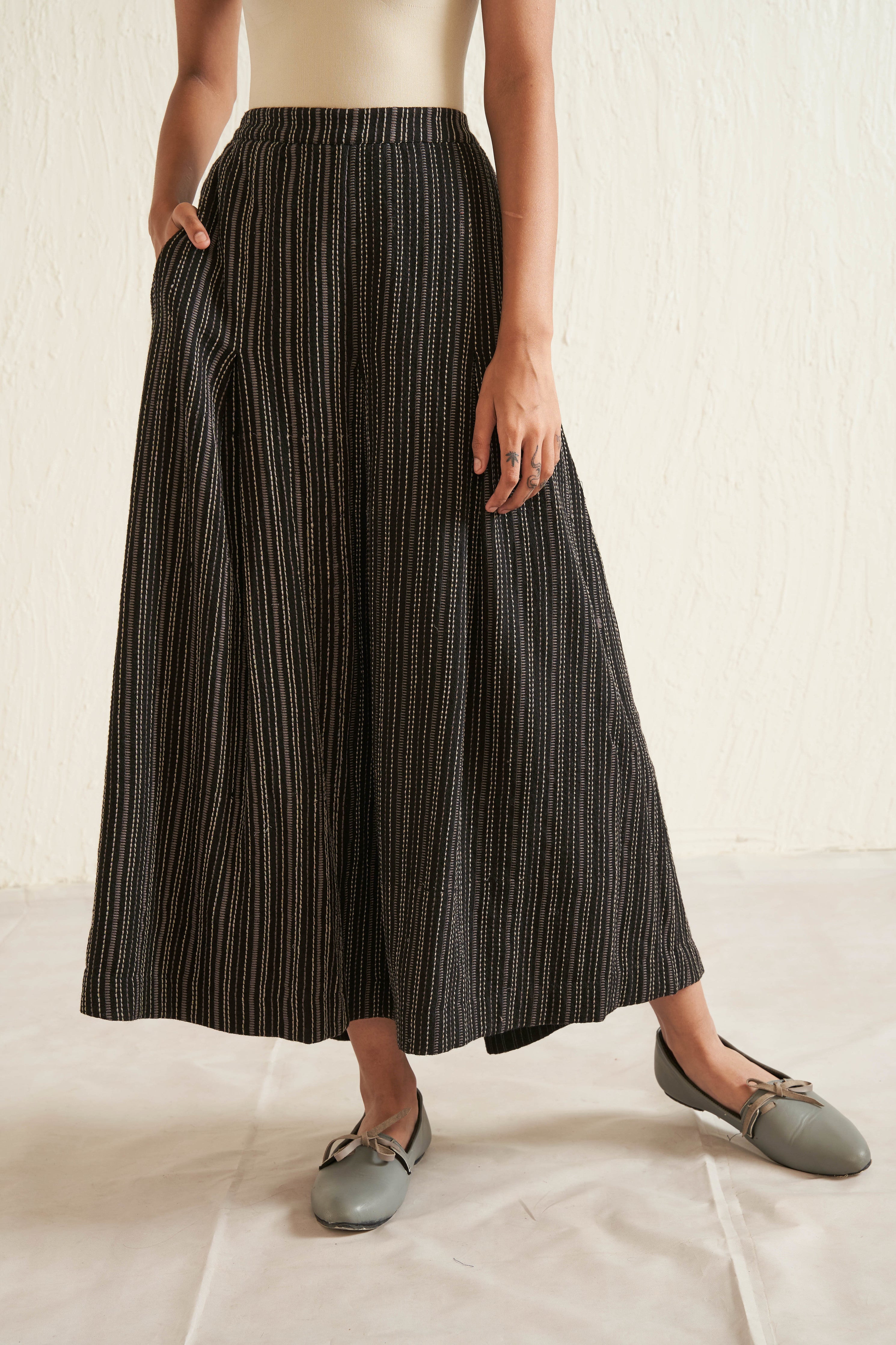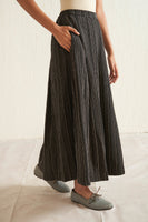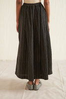 Black all over embroidered striper skirt in pure merino wool. Comes with attached abstract striper printed pure silk lining