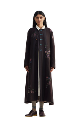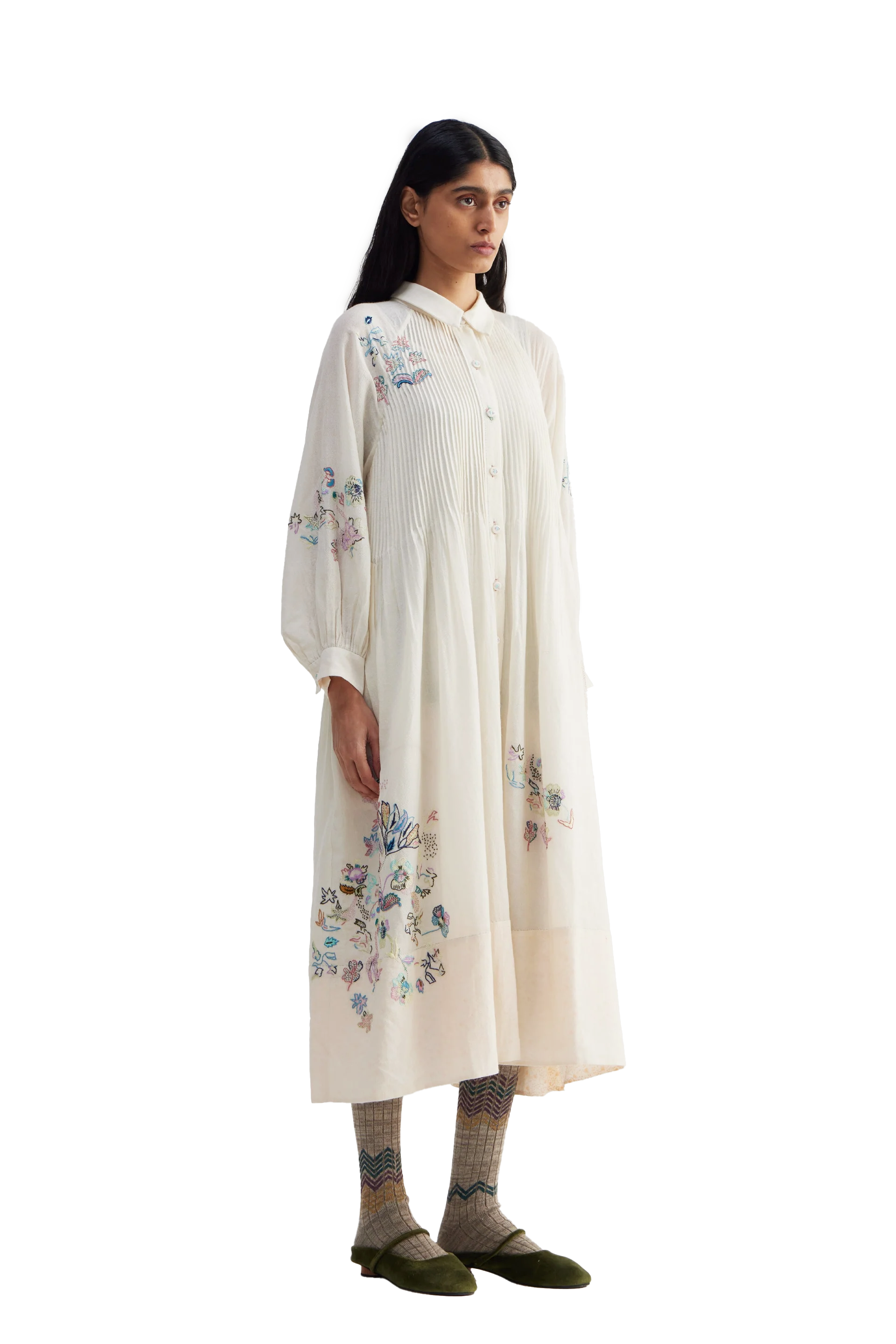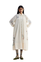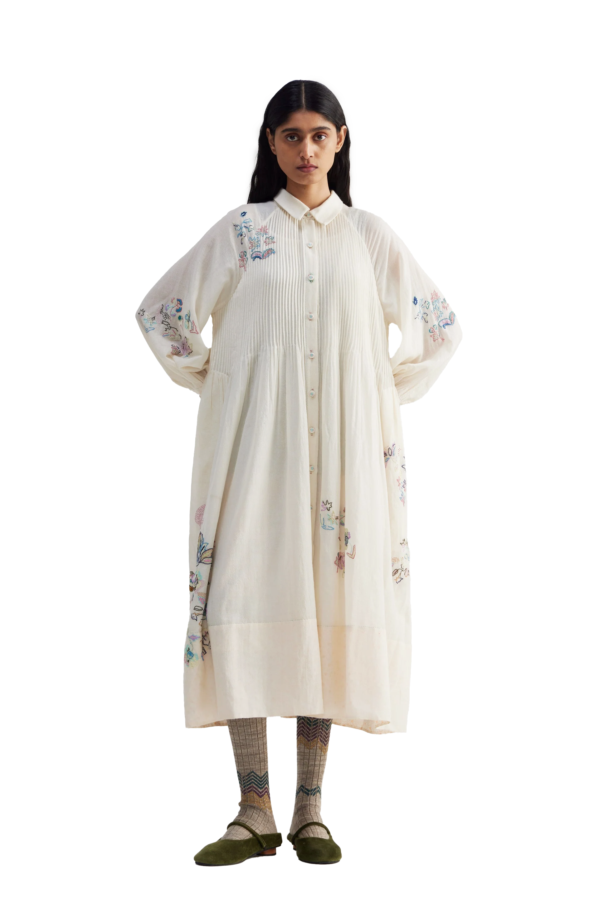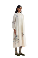 Relaxed fit front open button down collar midi dress with full puff raglan sleeves, pintucks allover the bodice and finished with handblock print 100% silk fabric facing detail at hem. Constructed in solid 100% merino wool with placement intricate sozni hand embroidery. Finished with contrast handblock print 100% silk fabric piping and facing detail.