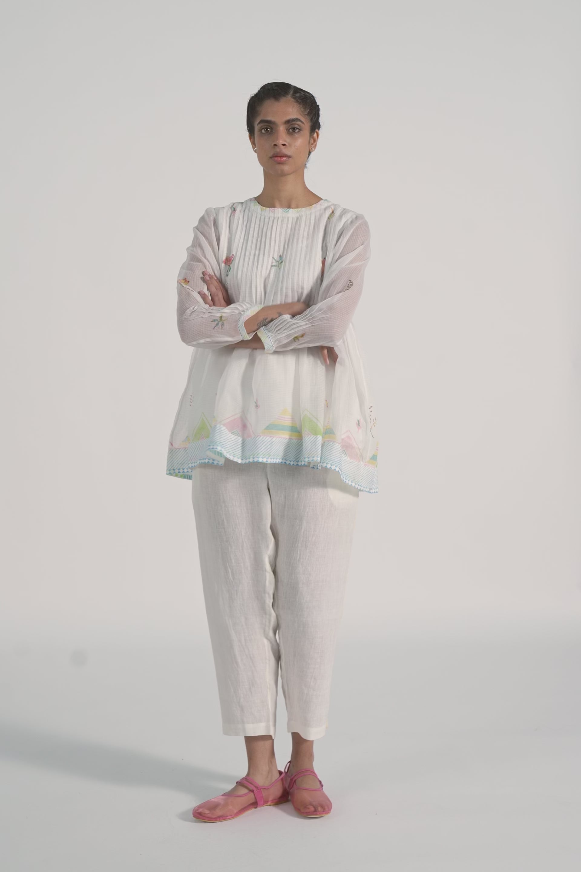 Relaxed fit all over pintuck top with chevron hand block printed border and all over placement print . Lined with co silk.