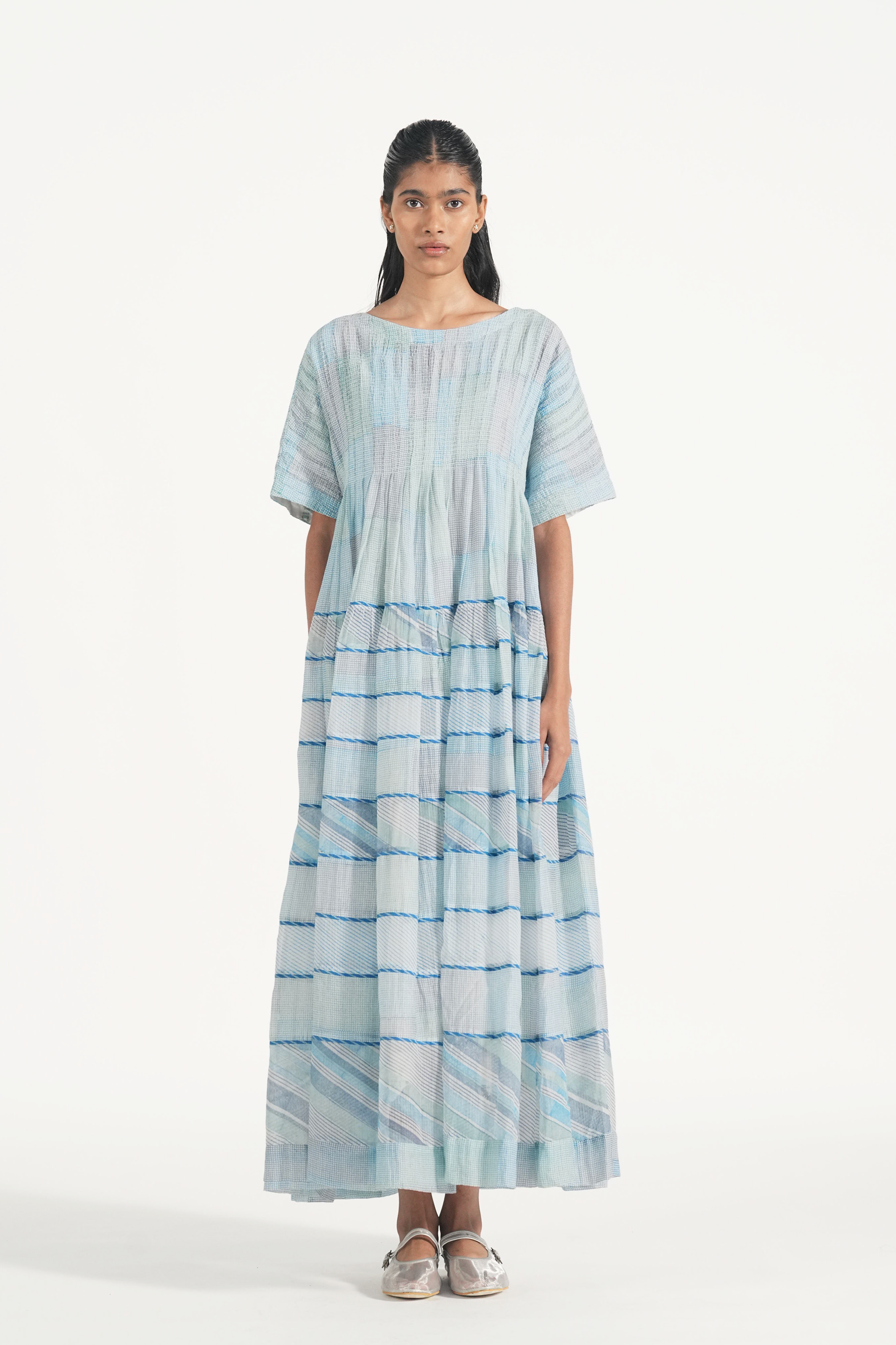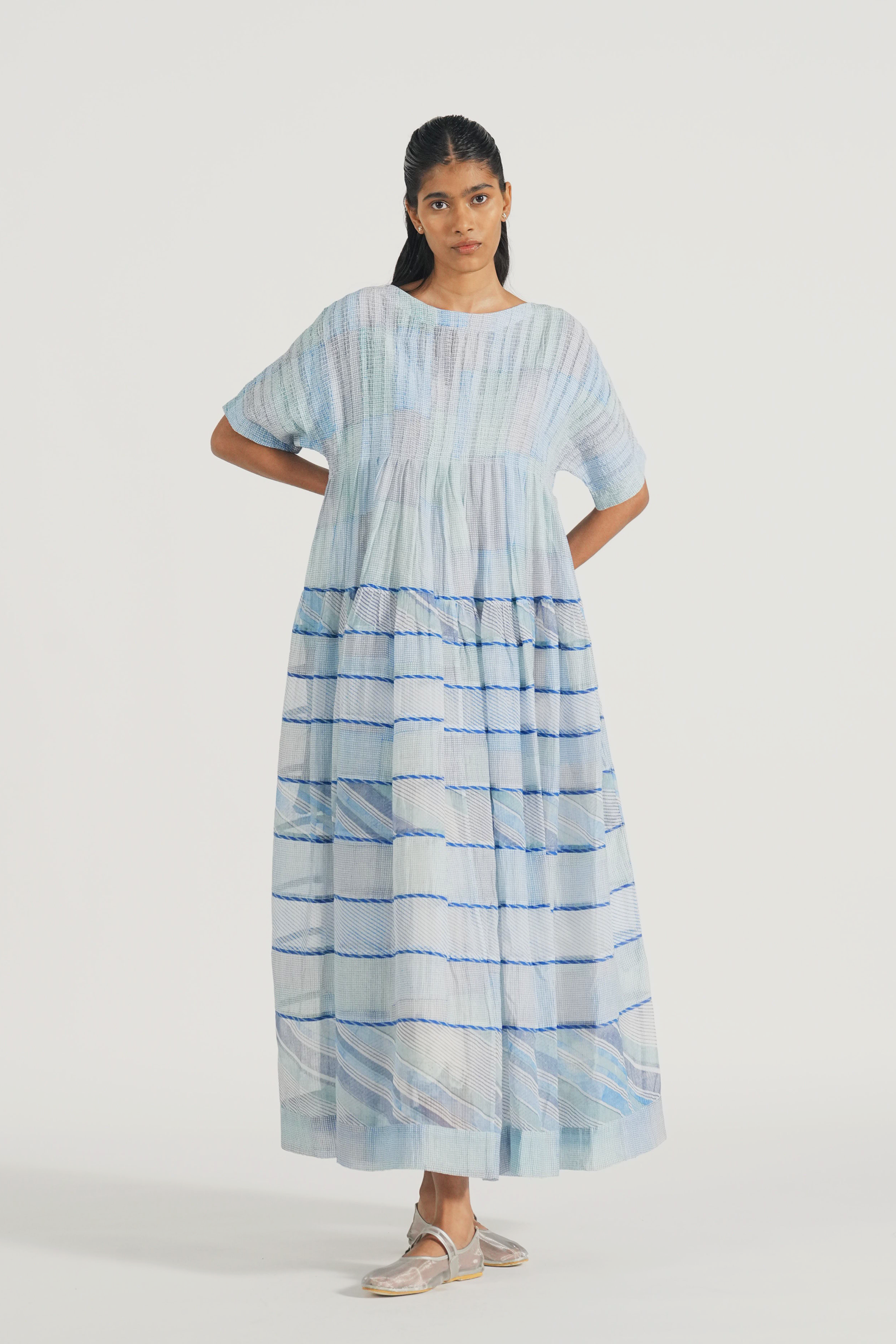 Smocked and panelled maxi dress in multi color hand block printed graph checks and diagonal. Comes with a complimentary lining.