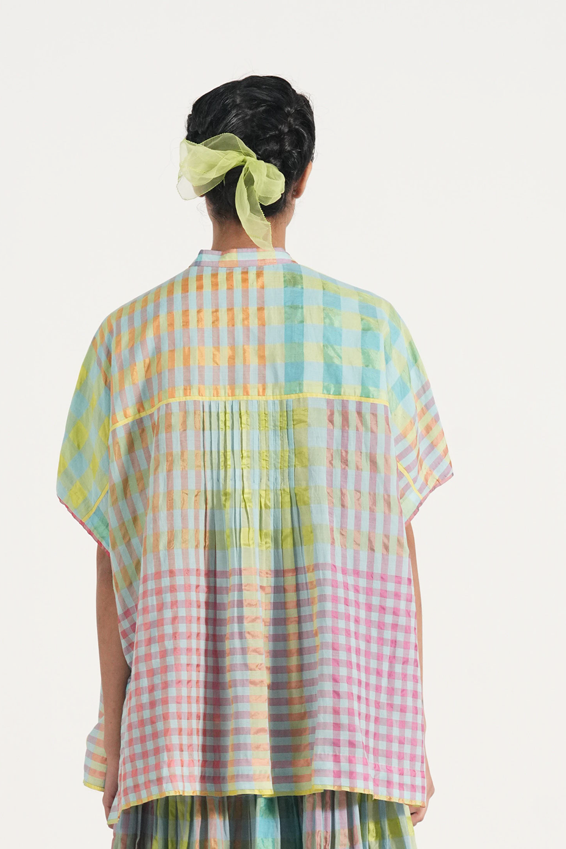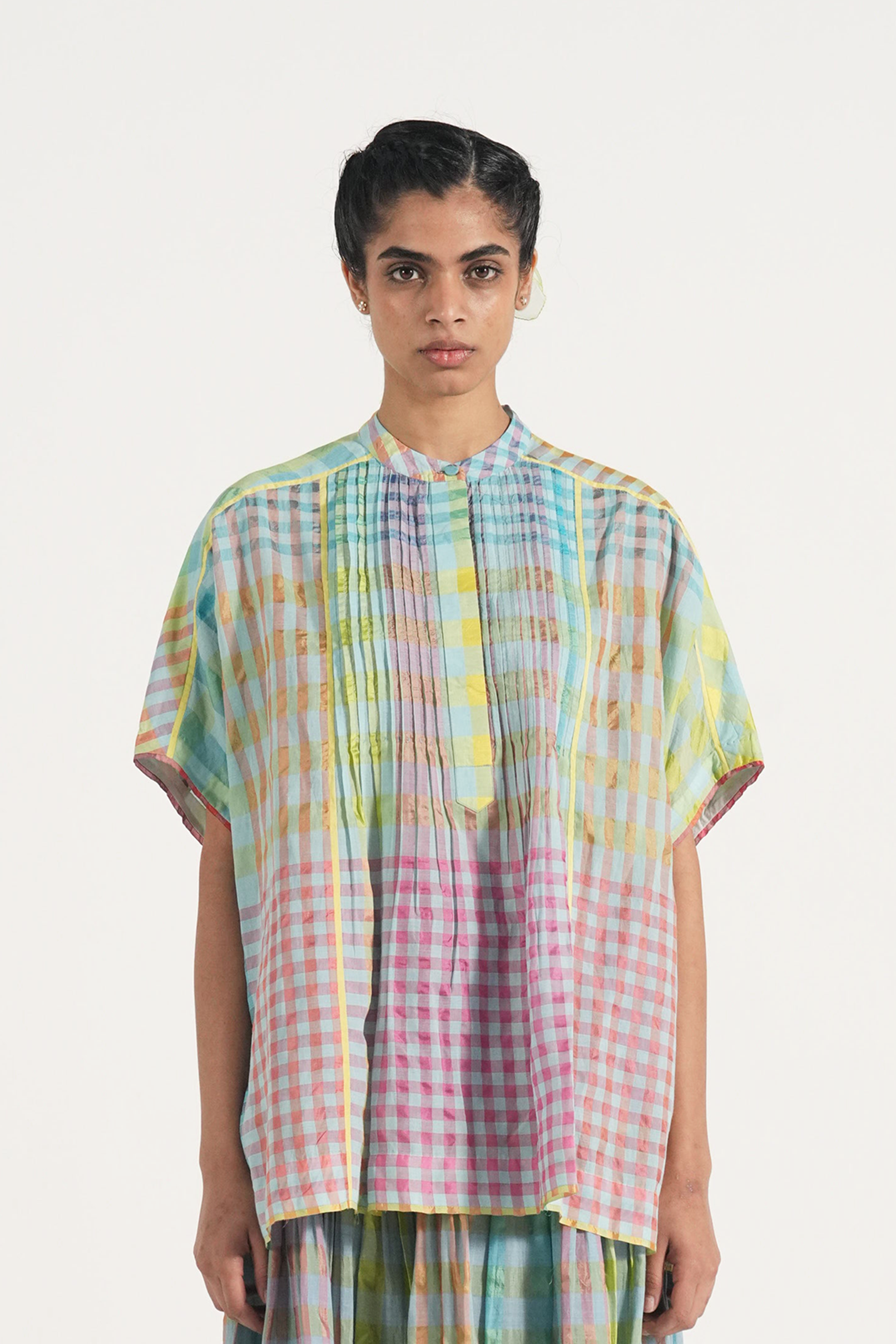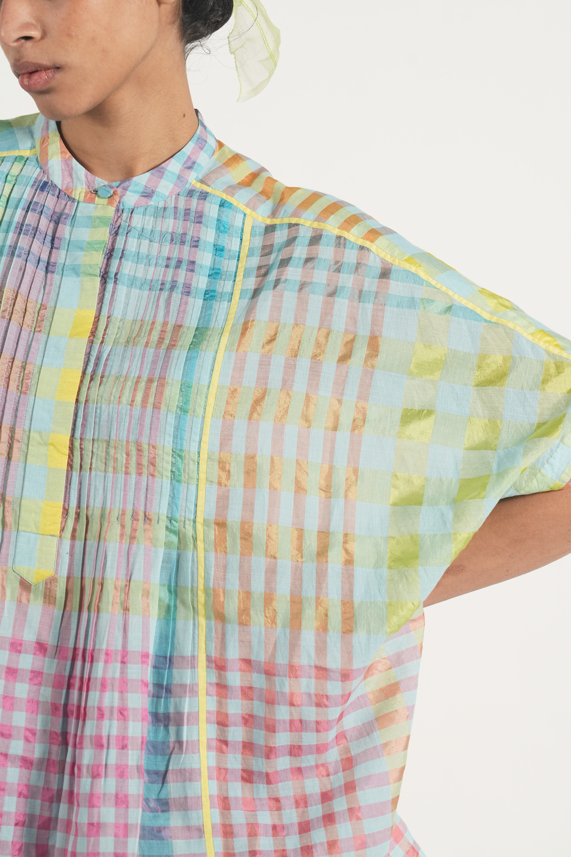 Front open pintuck top in multicolor handwoven cotton silk checks with contrast selvage