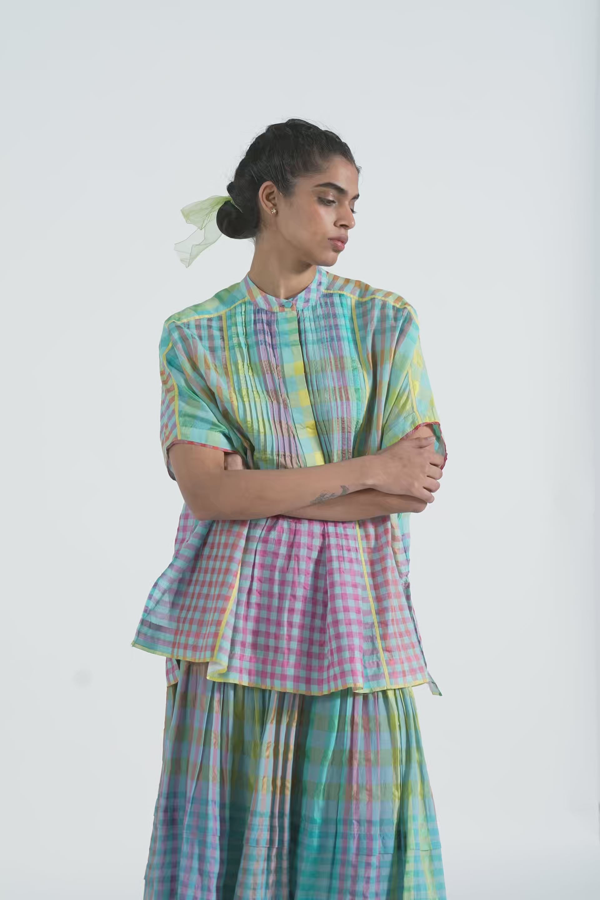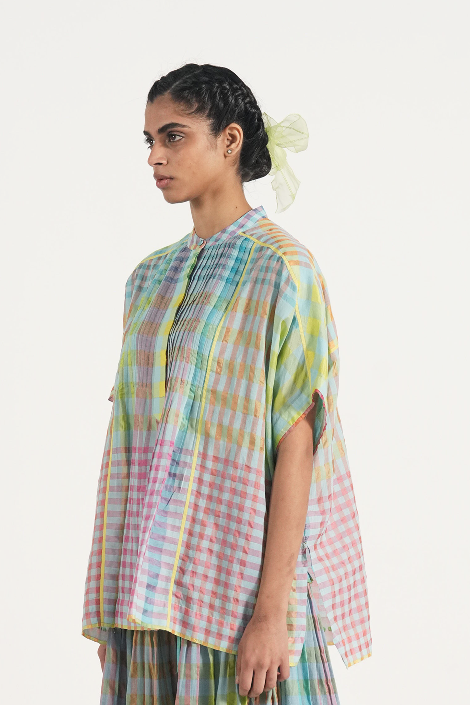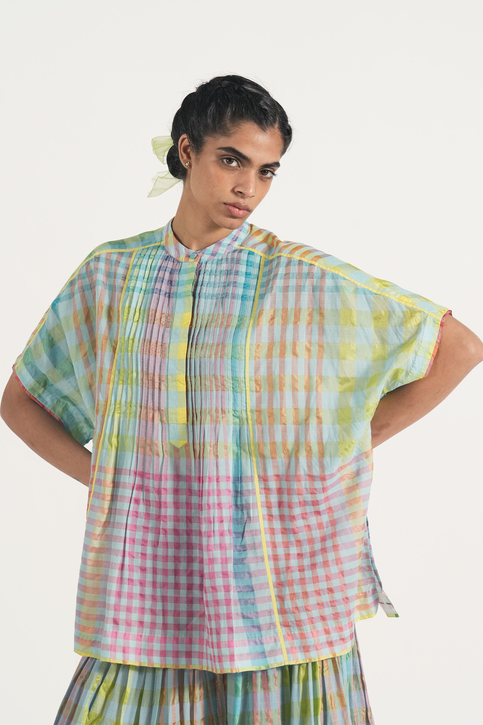 Front open pintuck top in multicolor handwoven cotton silk checks with contrast selvage