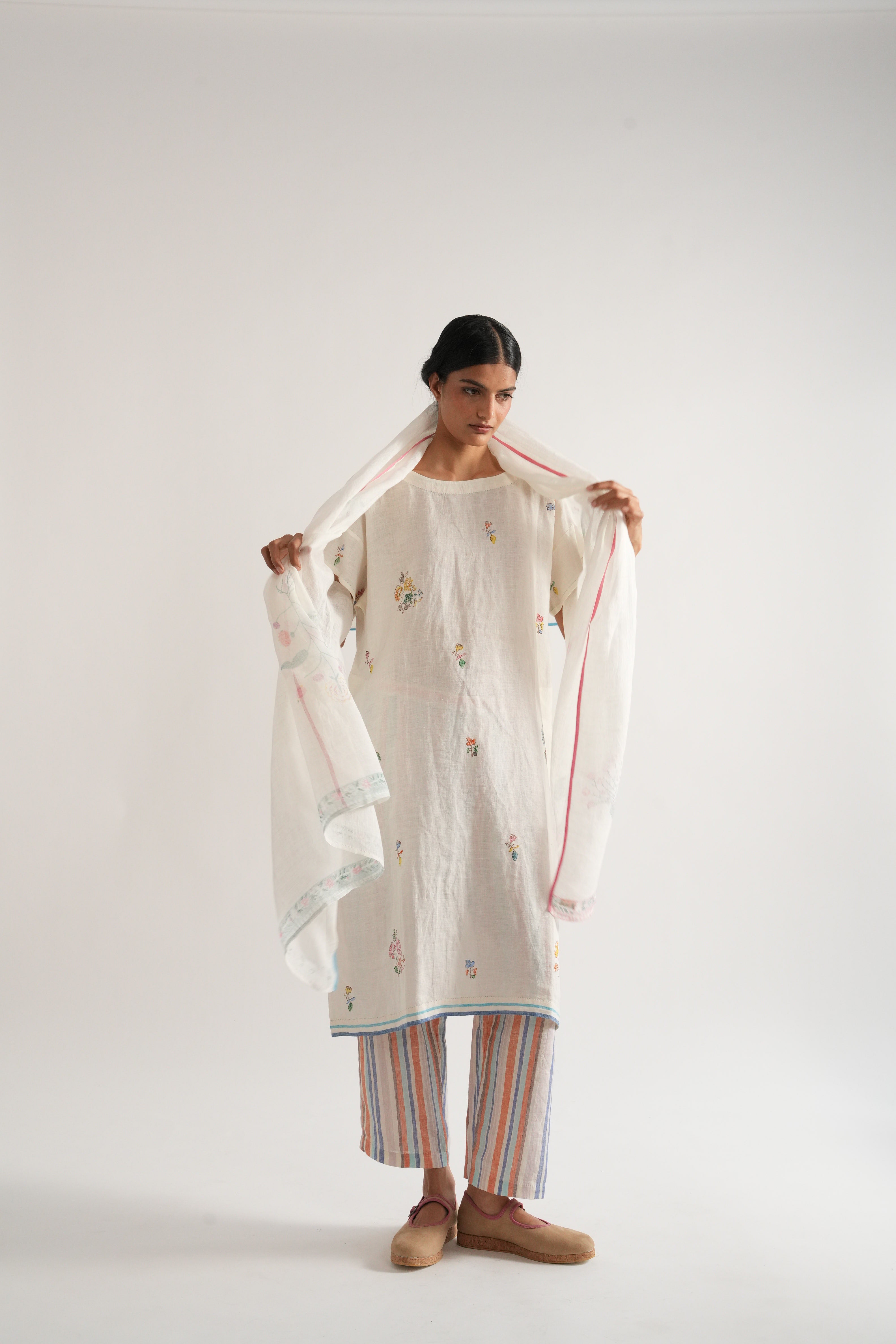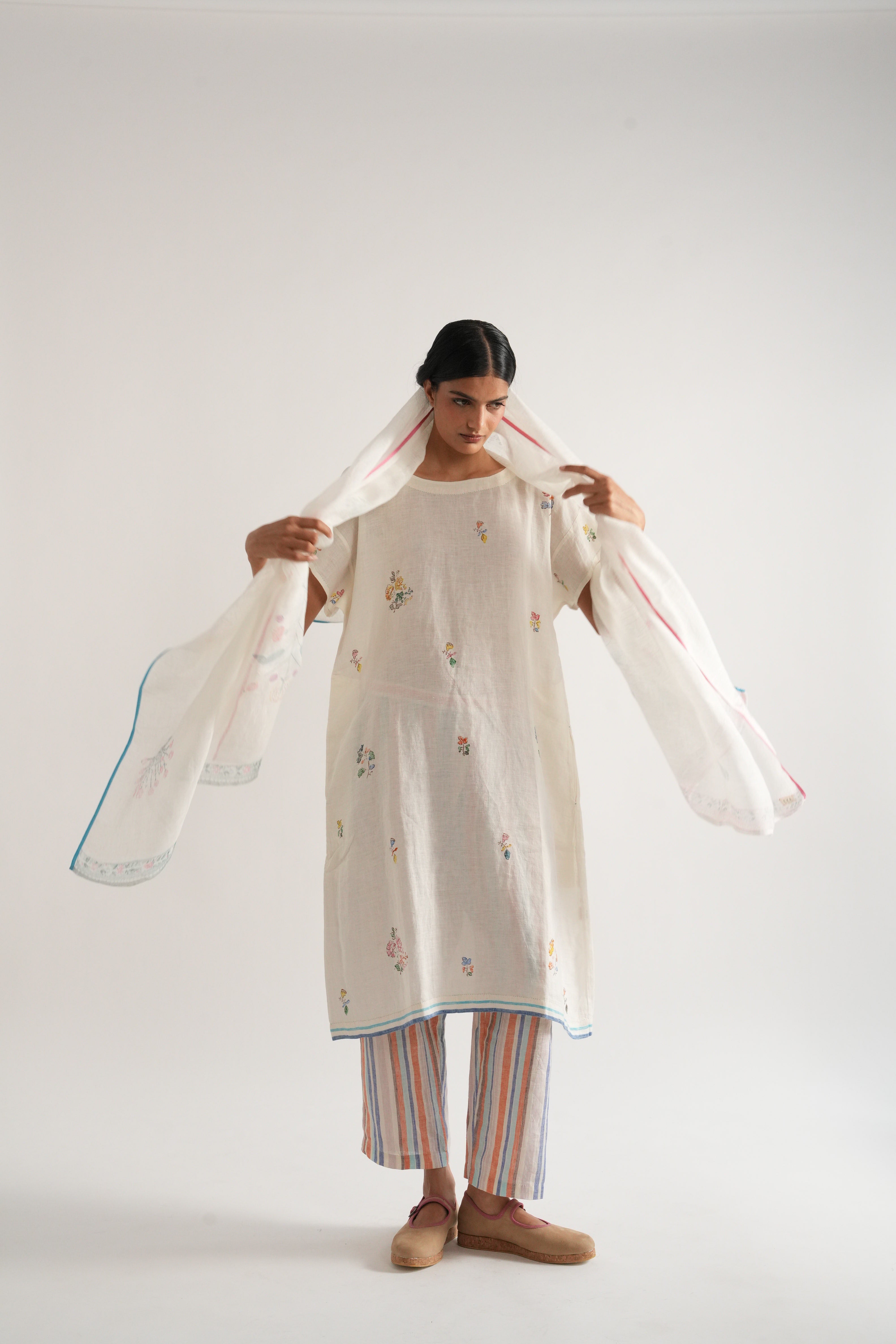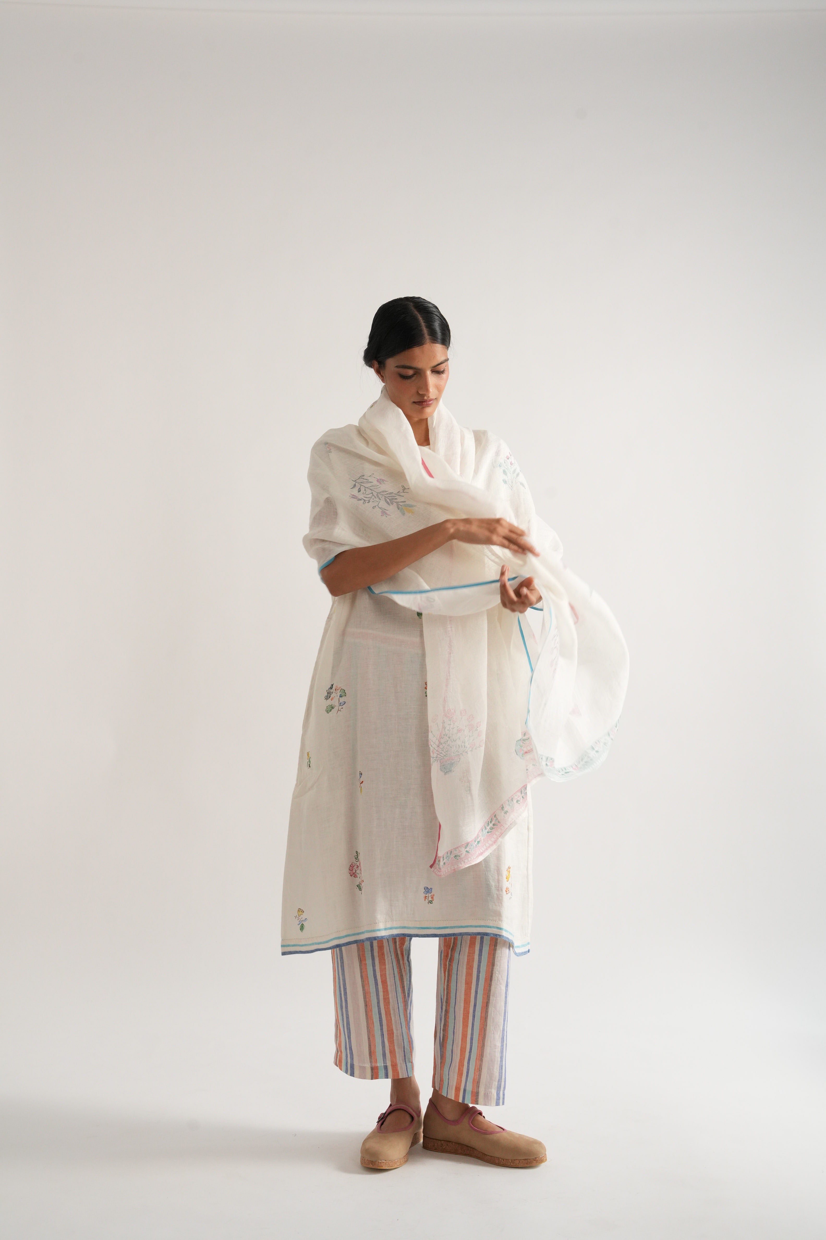 Stole in placement hand block printed handwoven linen gauze with contrast selvage details
