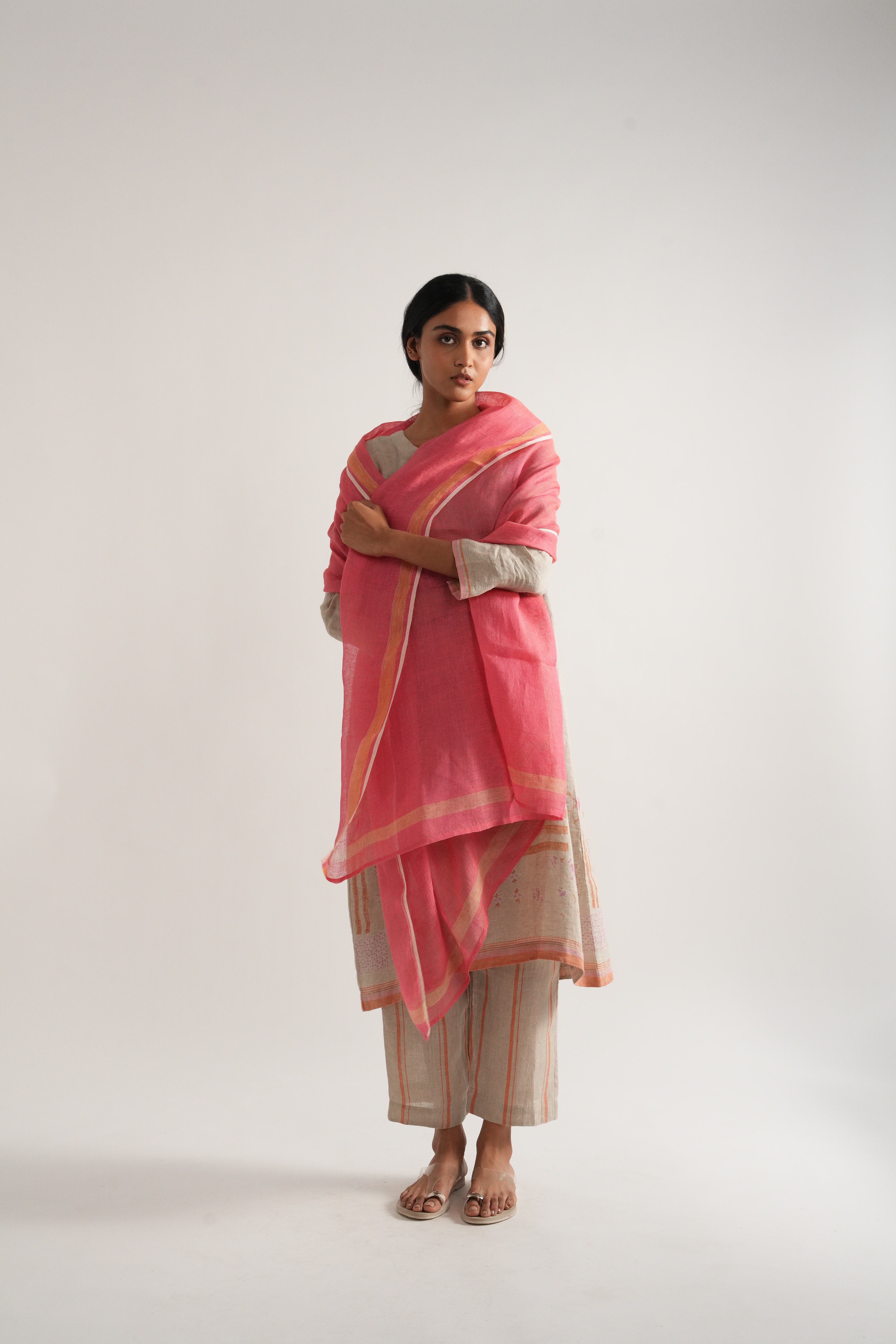 Stole in solid handwoven linen gauze with contrast yarn dyed border and selvages