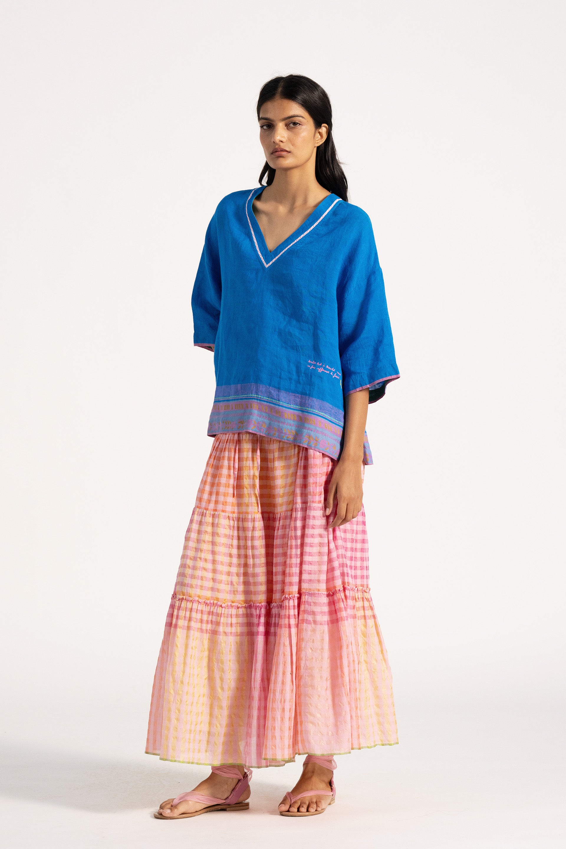 Basic v neckline relaxed fit top with 3/4 sleeve and contrast border and salvedge detail across the hem and sleeves. Constructed in solid with border 100% linen fabric.