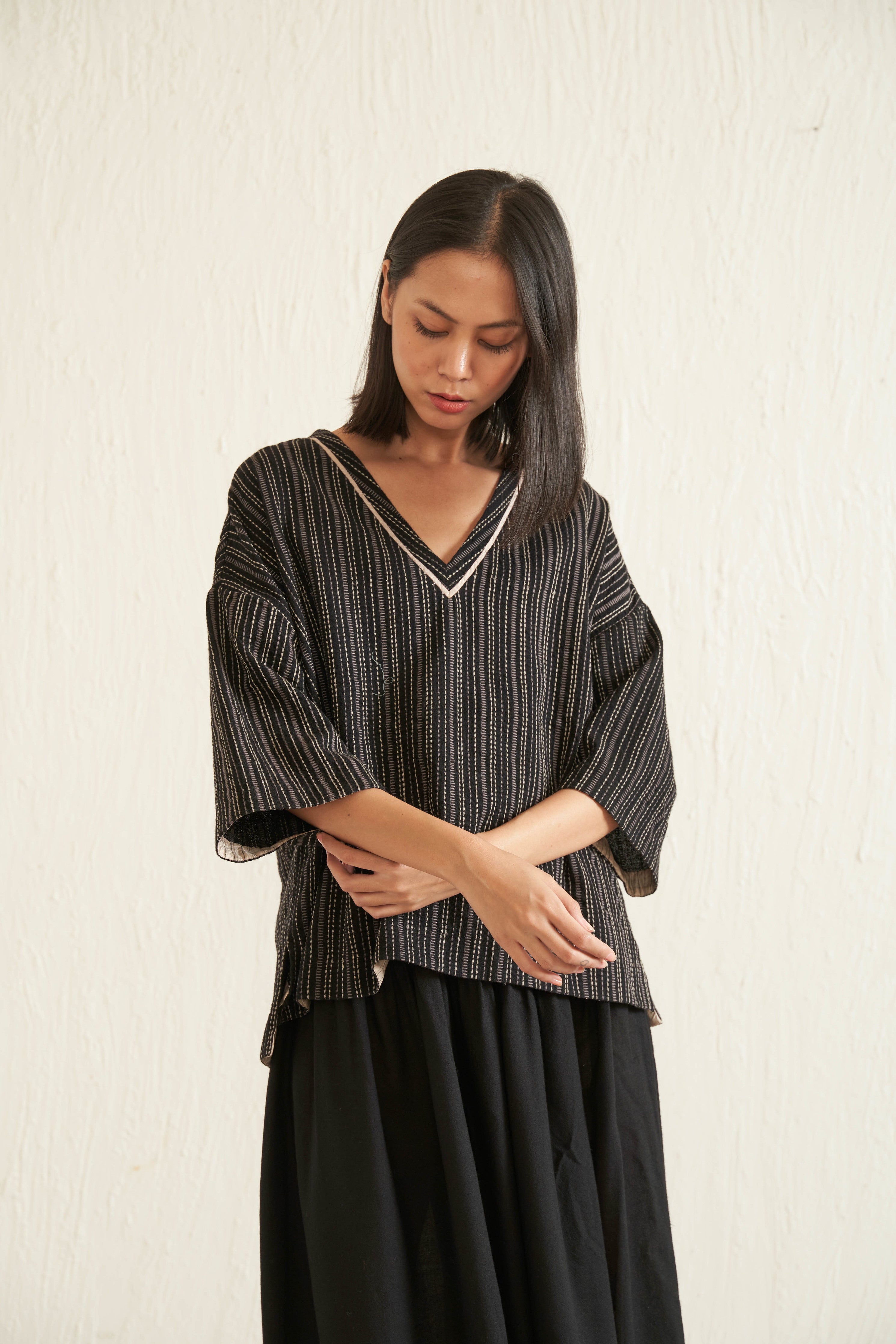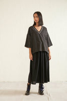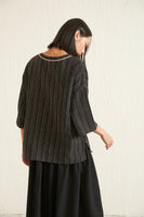 Black all- over embroidered short top in pure merino wool with contrast piping detail