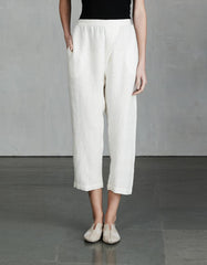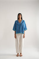 V neck straight fit easy summer top in handwoven linen yarndyed stripes with selvage detail