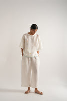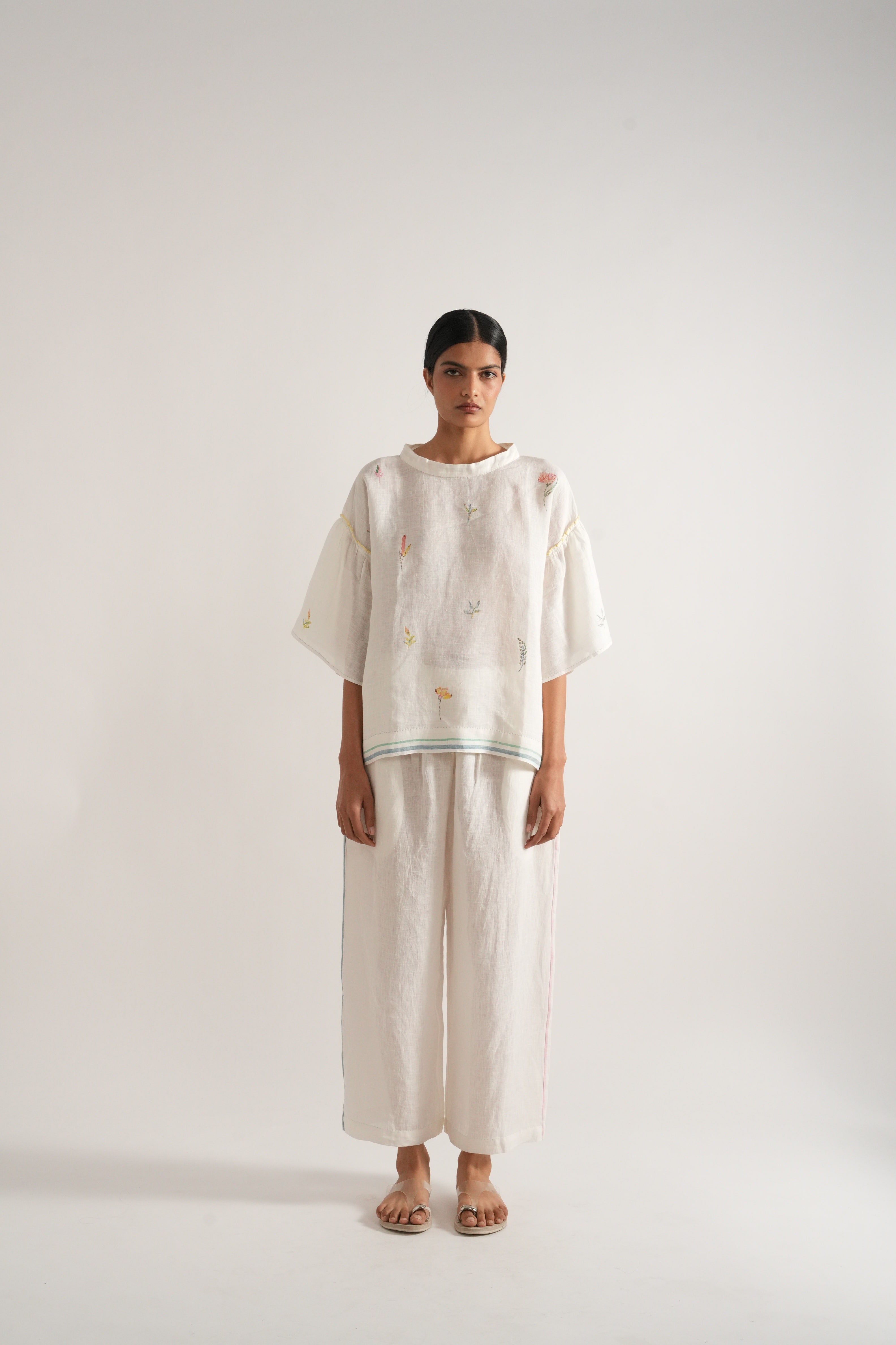 Flared bell sleeves summer top in hand block placement print handwoven linen