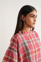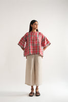 Flared bell sleeves summer top in handwoven linen checks