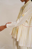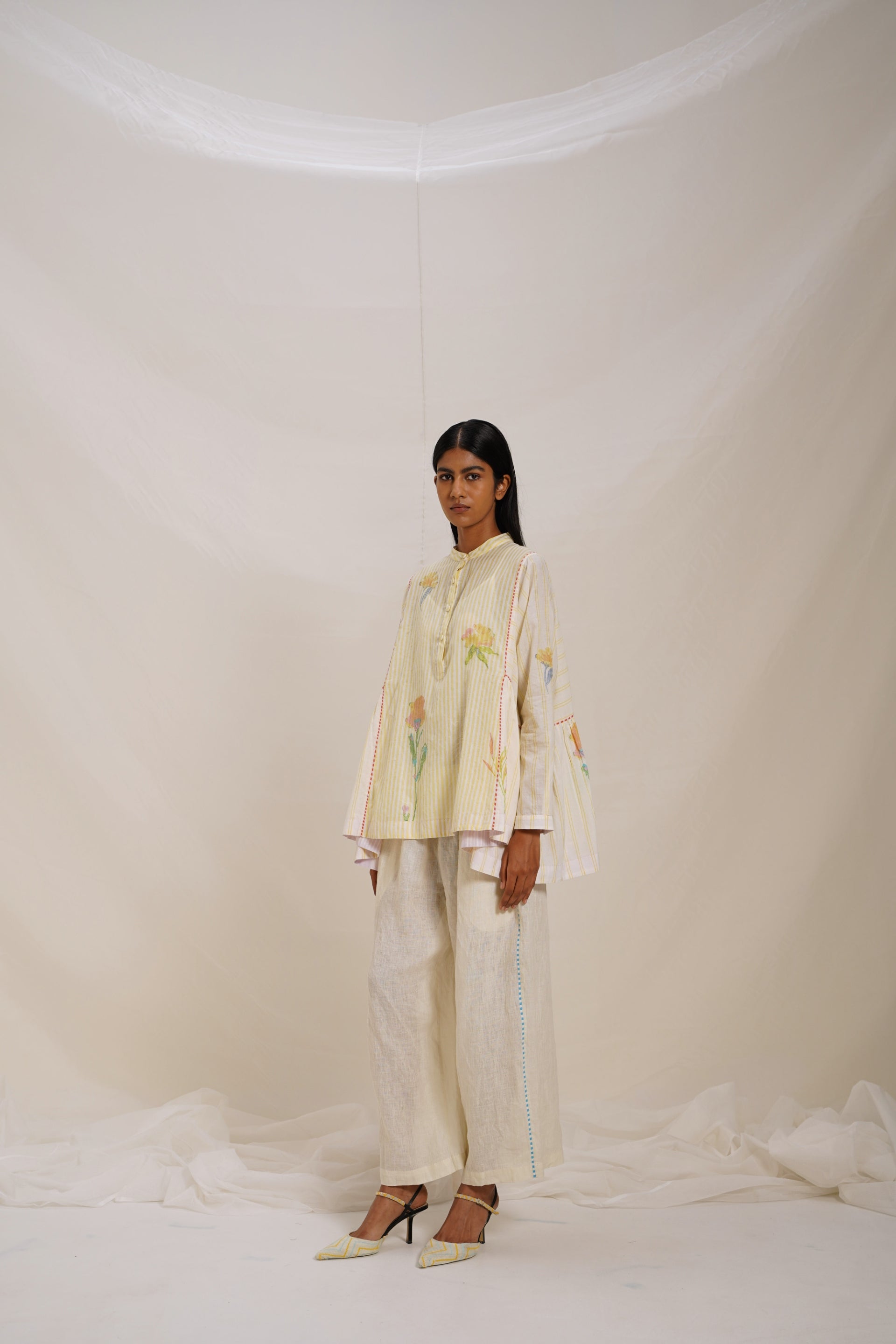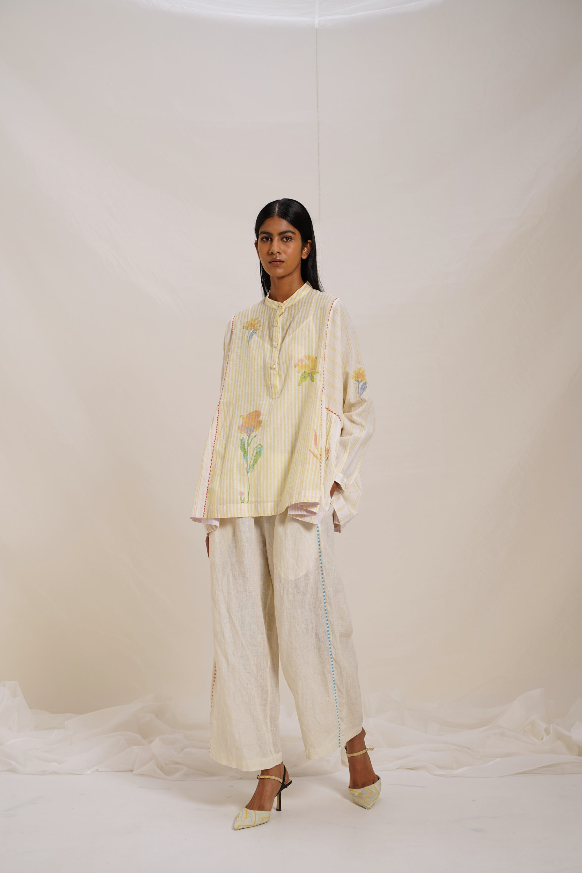 Oversized placket top, showcasing a captivating blend of hand block grid and floral prints. This piece features contrast hand block striper print piping detail, adding a touch of sophistication to its design. Crafted with attention to detail, this top offers a perfect balance of comfort and chic style.