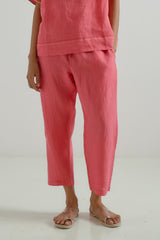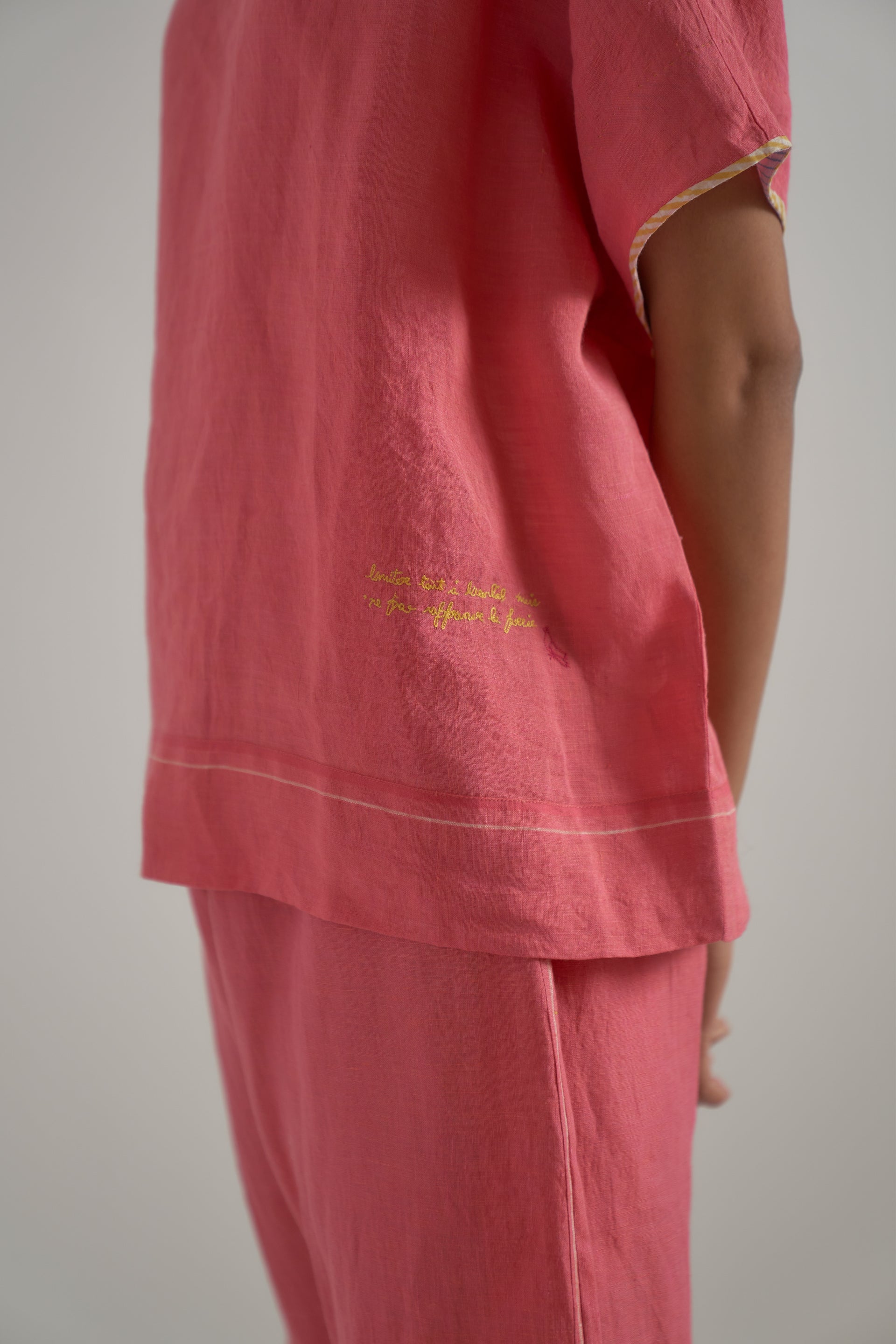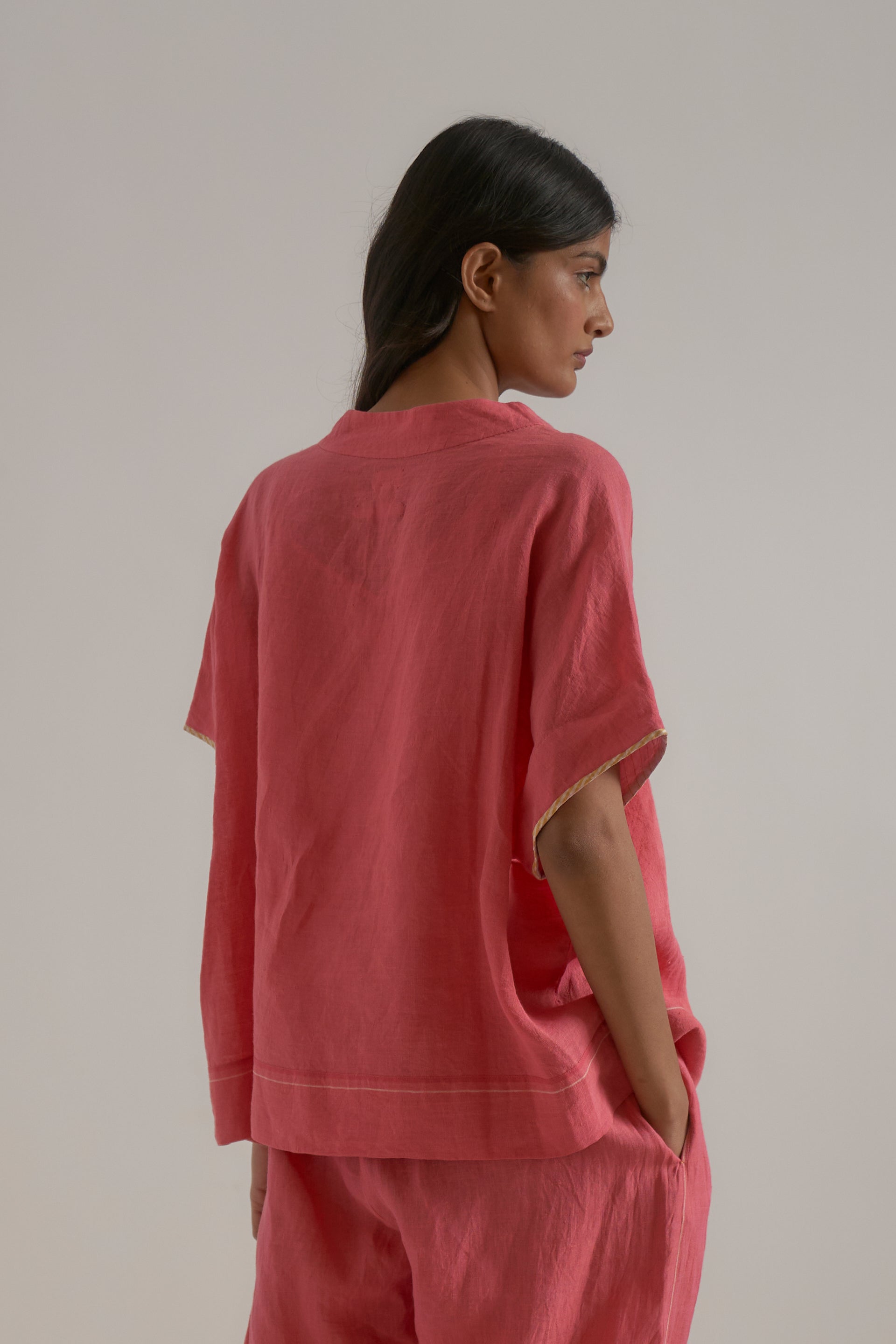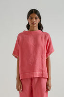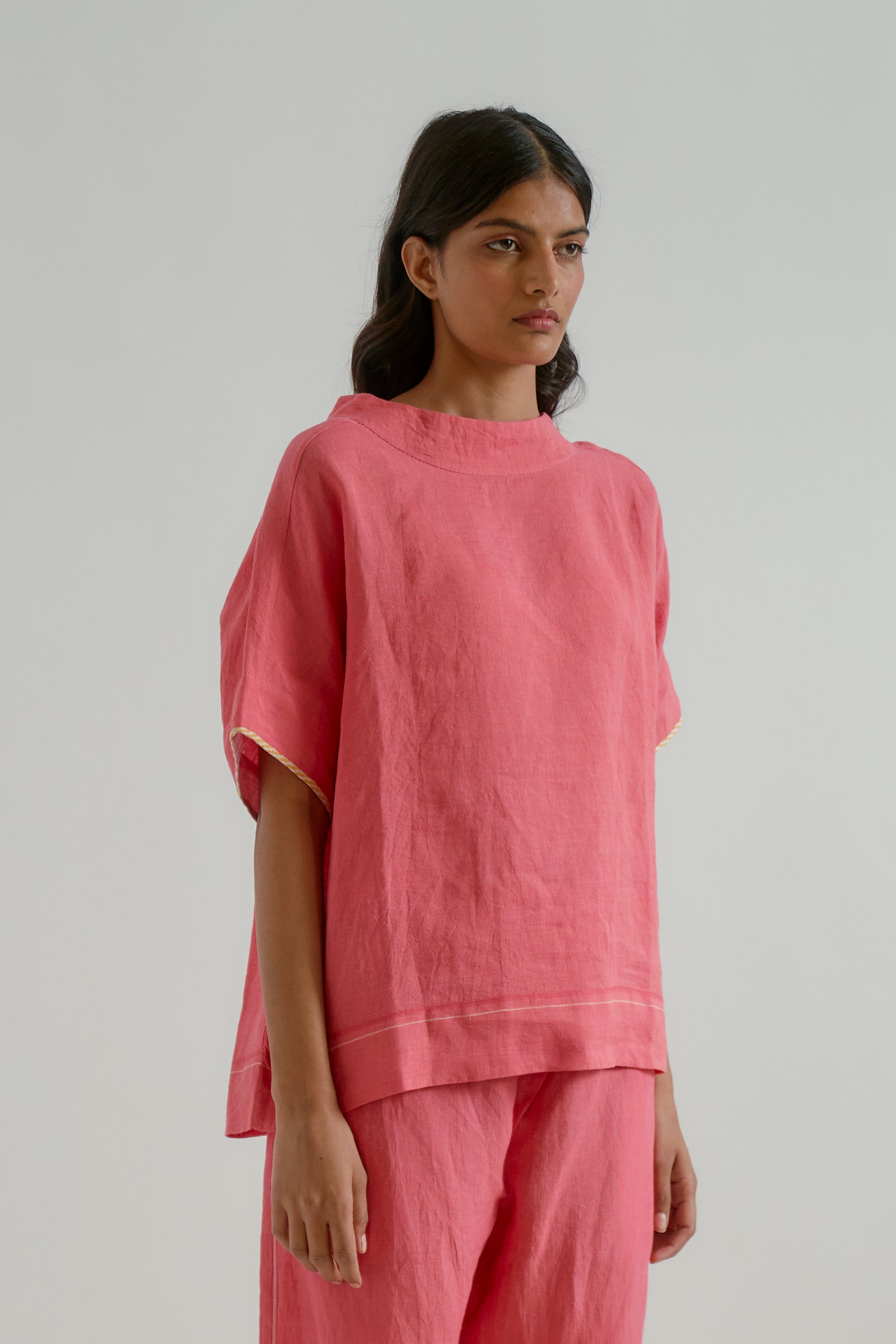 Crew neckline relaxed fit top with short sleeve and contrast handblock print striper piping and selvedge insert detail. crafted in solid 100% linen fabric.