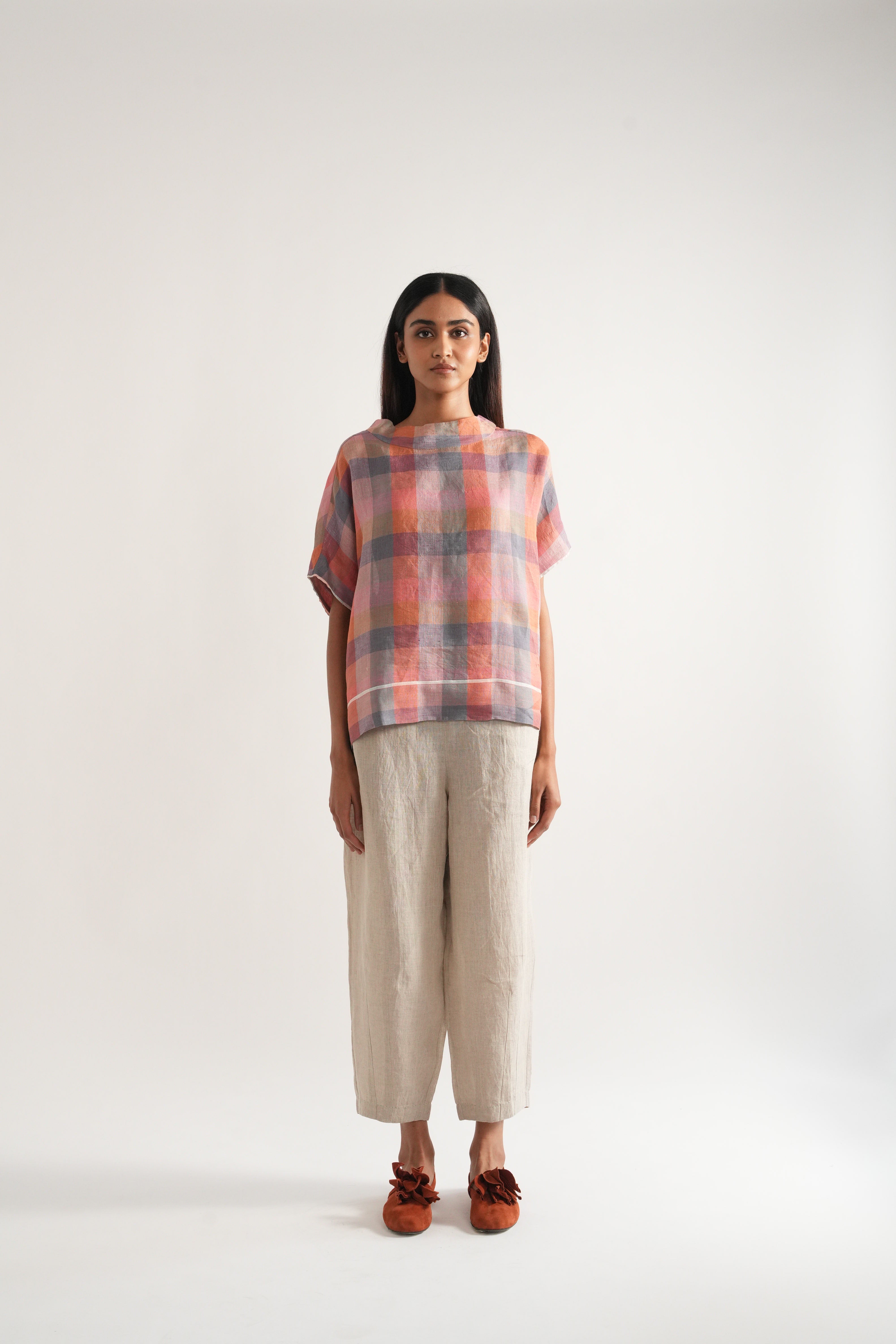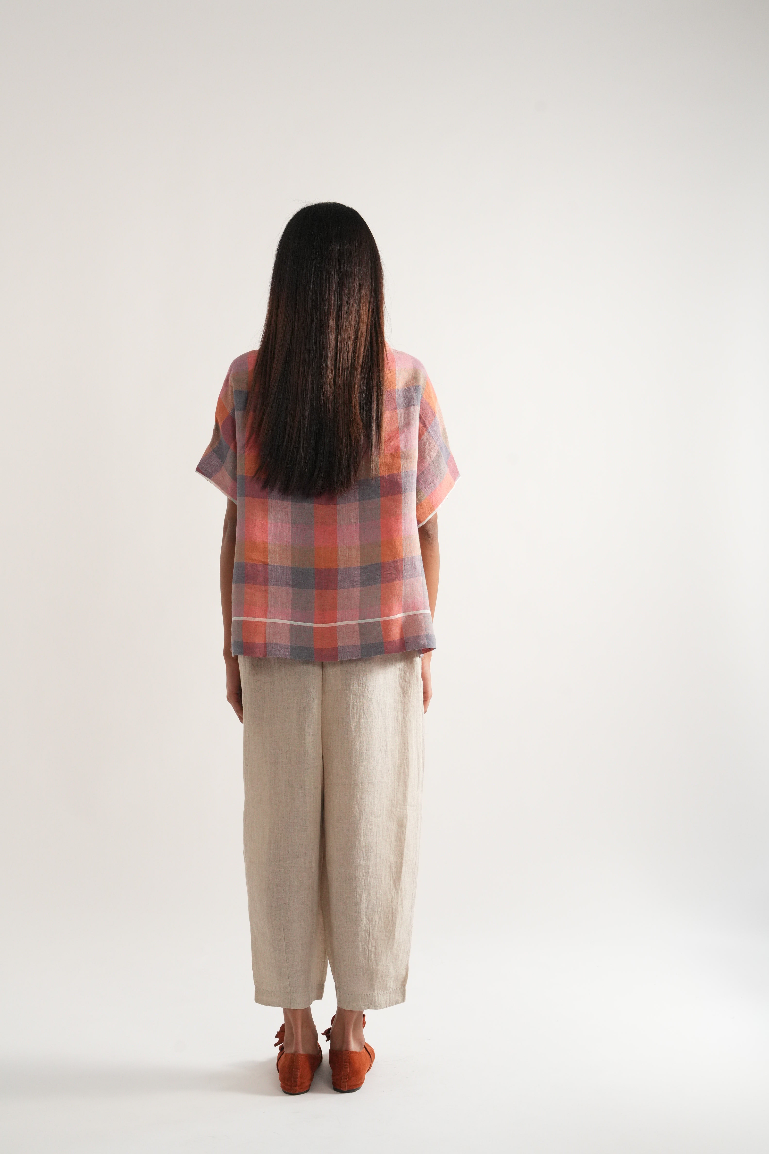 Relaxed fit short summer top in handwoven linen checks with selvage details