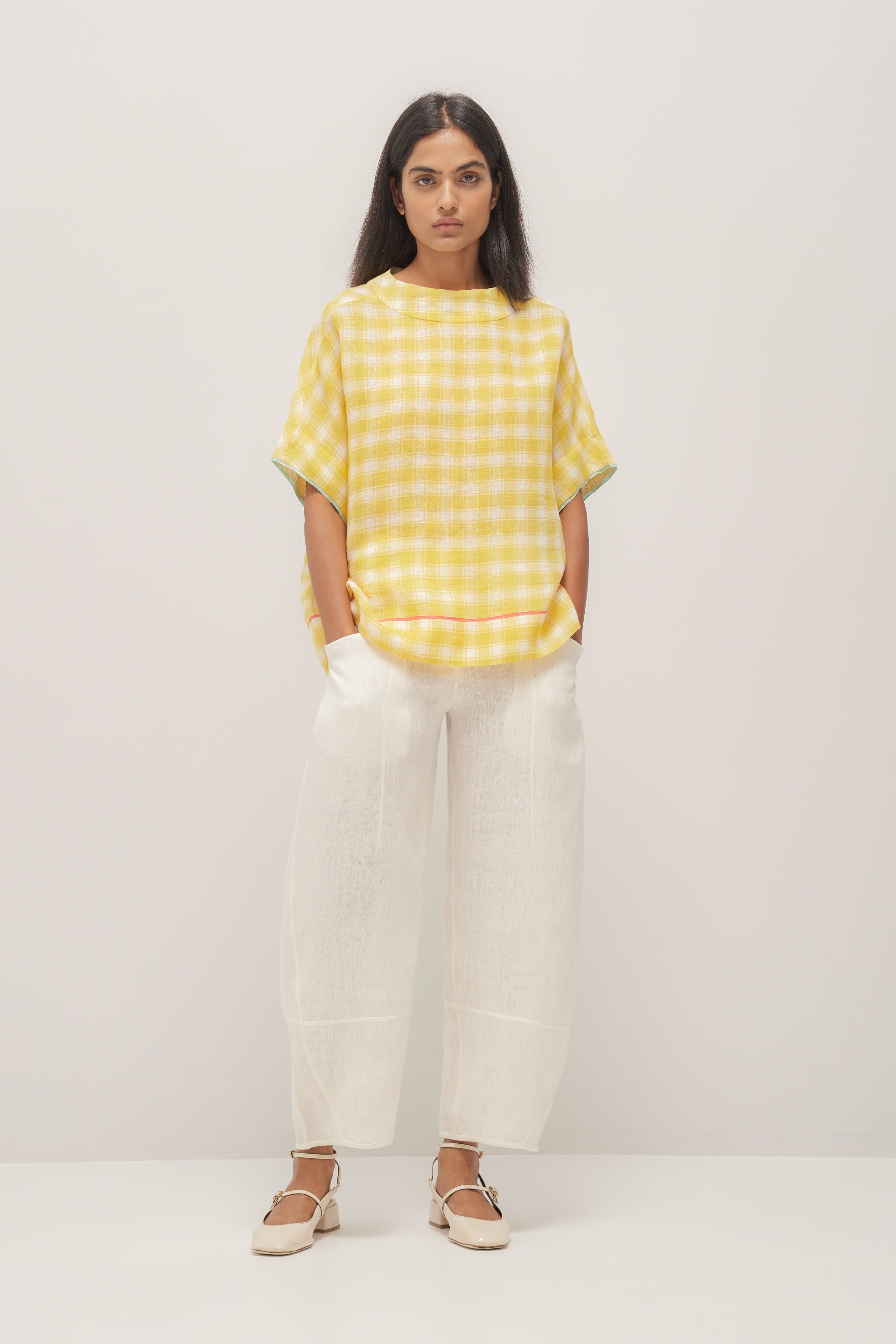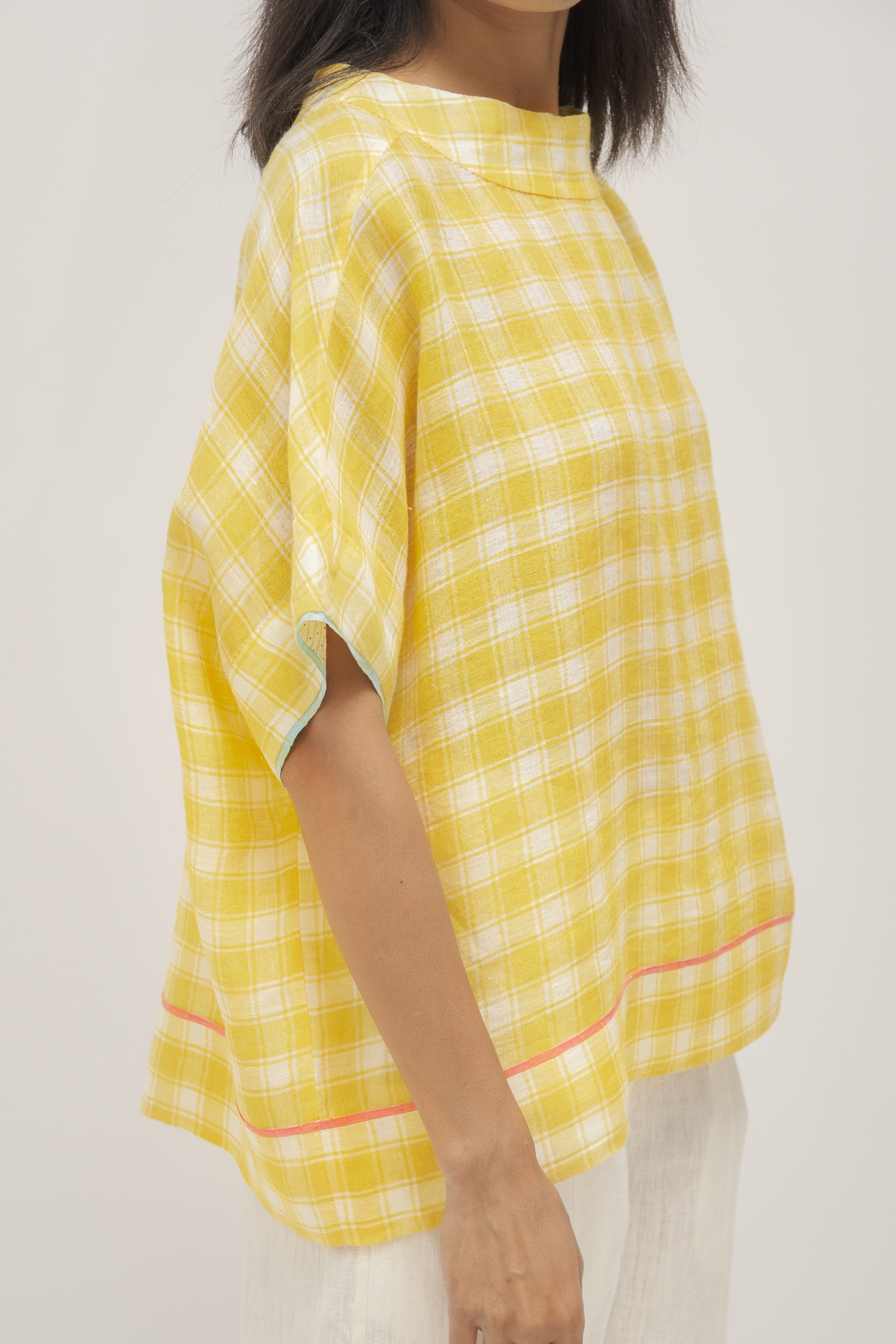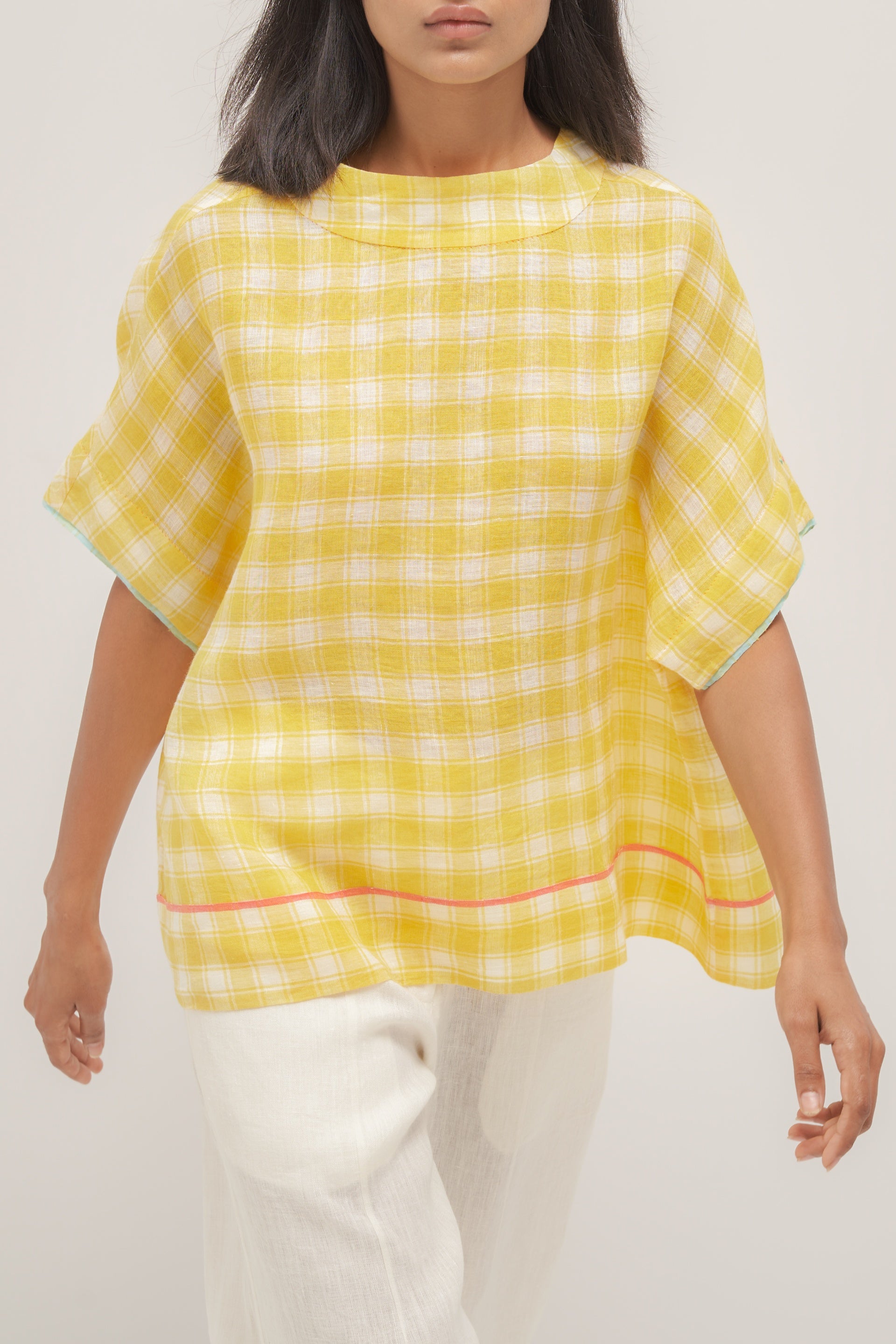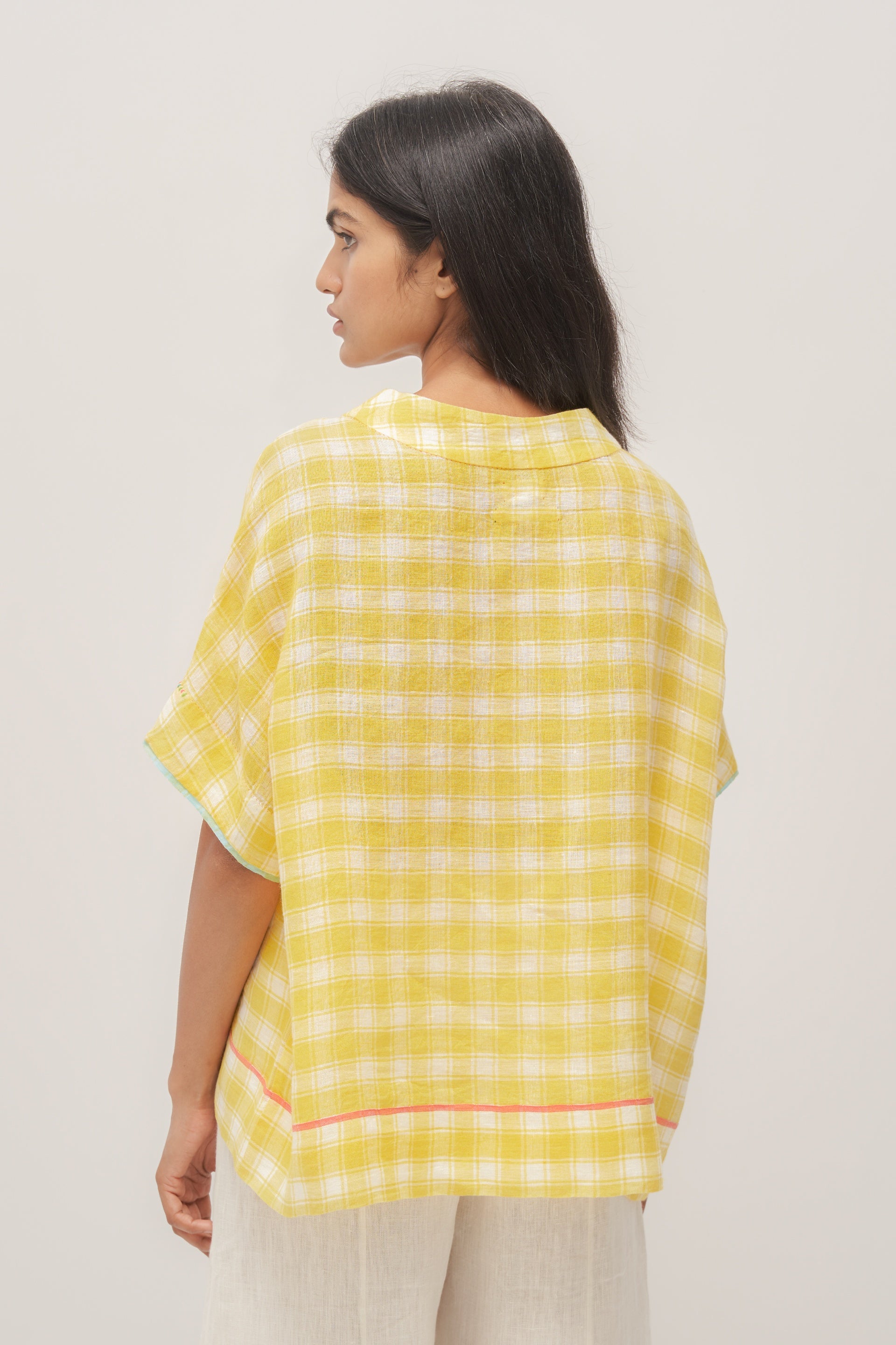 Yellow checks straight-fit linen top with contrasting selvedge detail