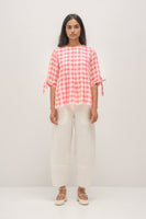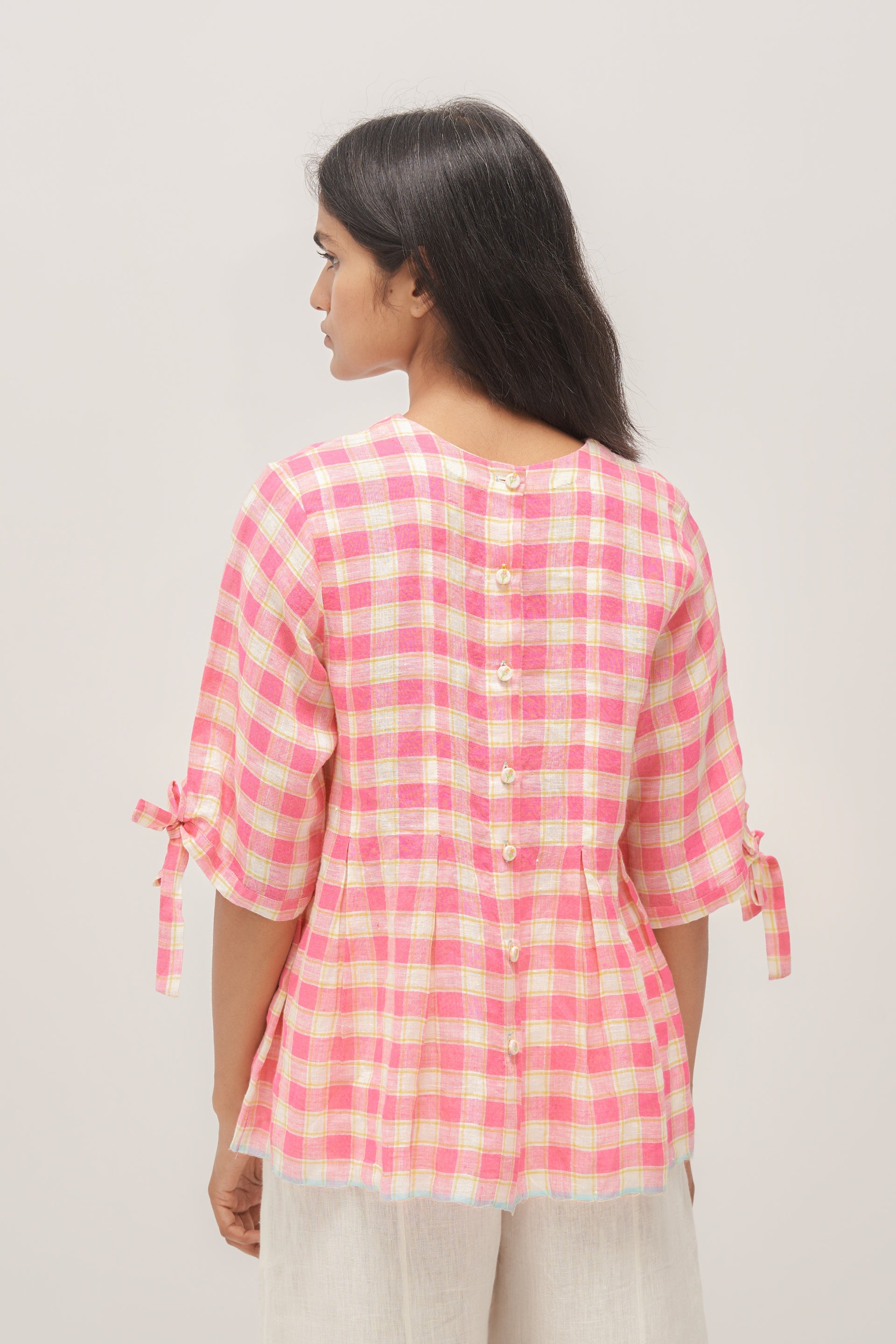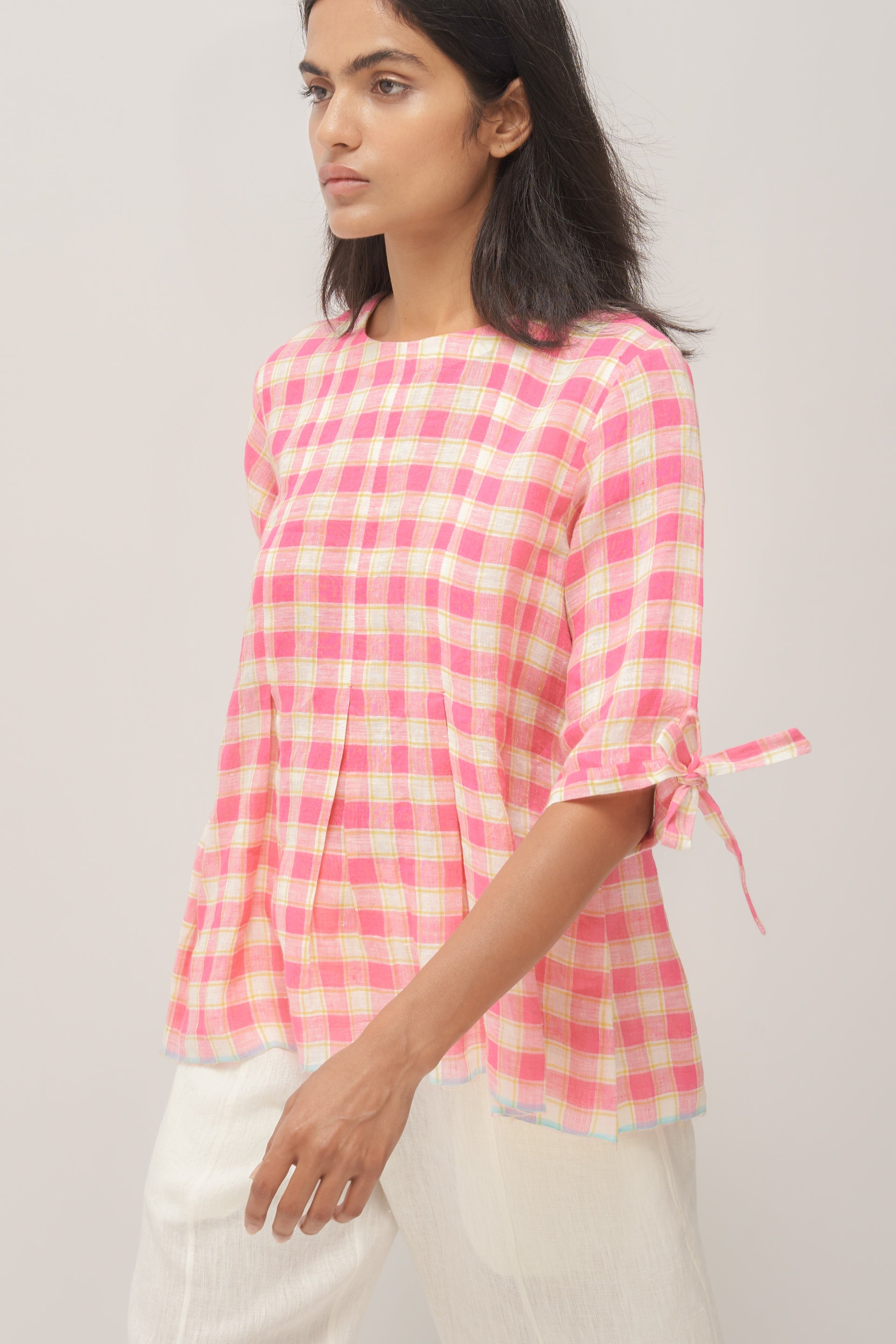 Pink multichecks linen top with sleeve tie-up, inverted box pleats and back open detail
