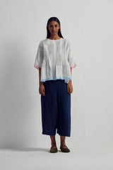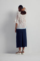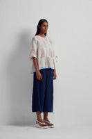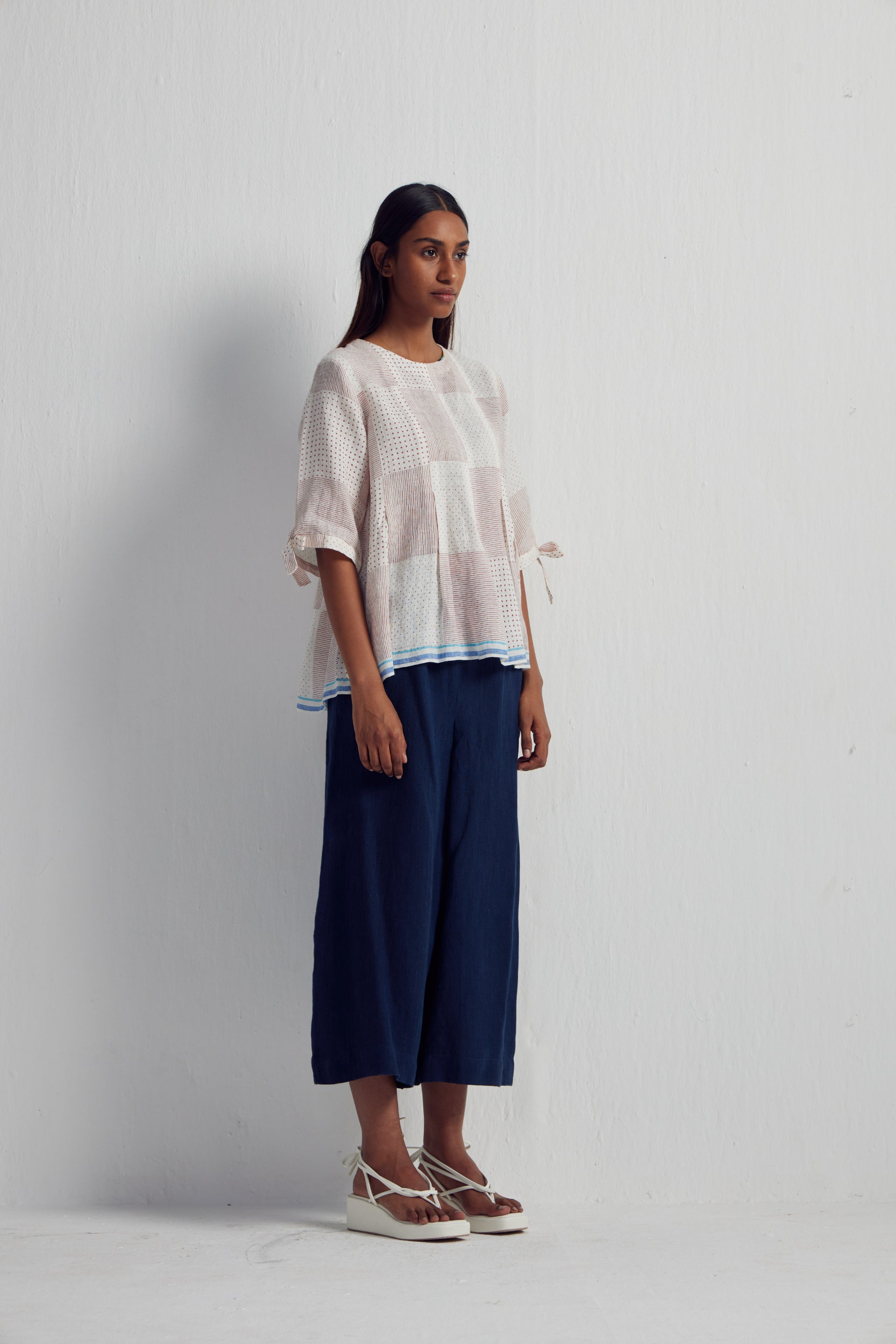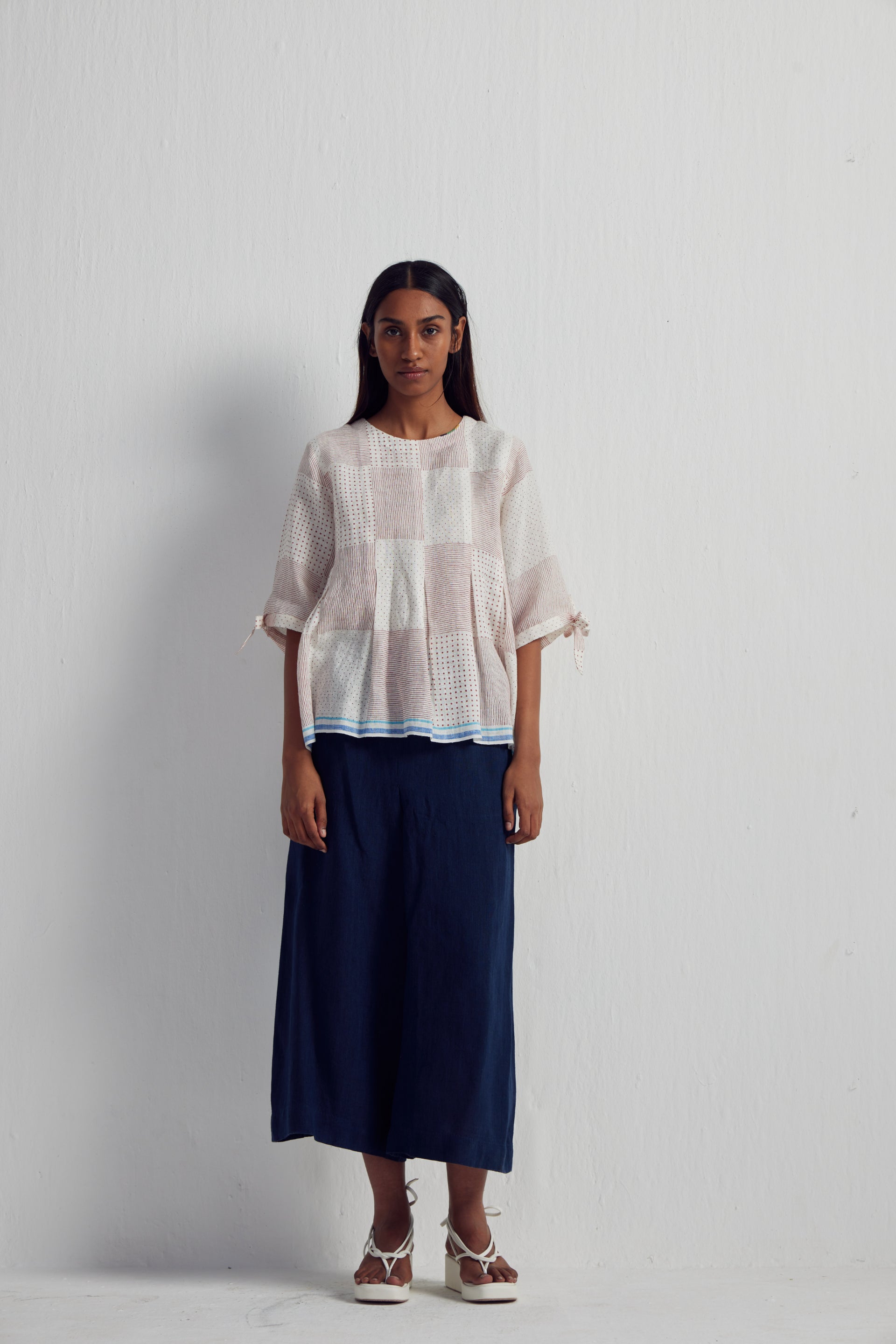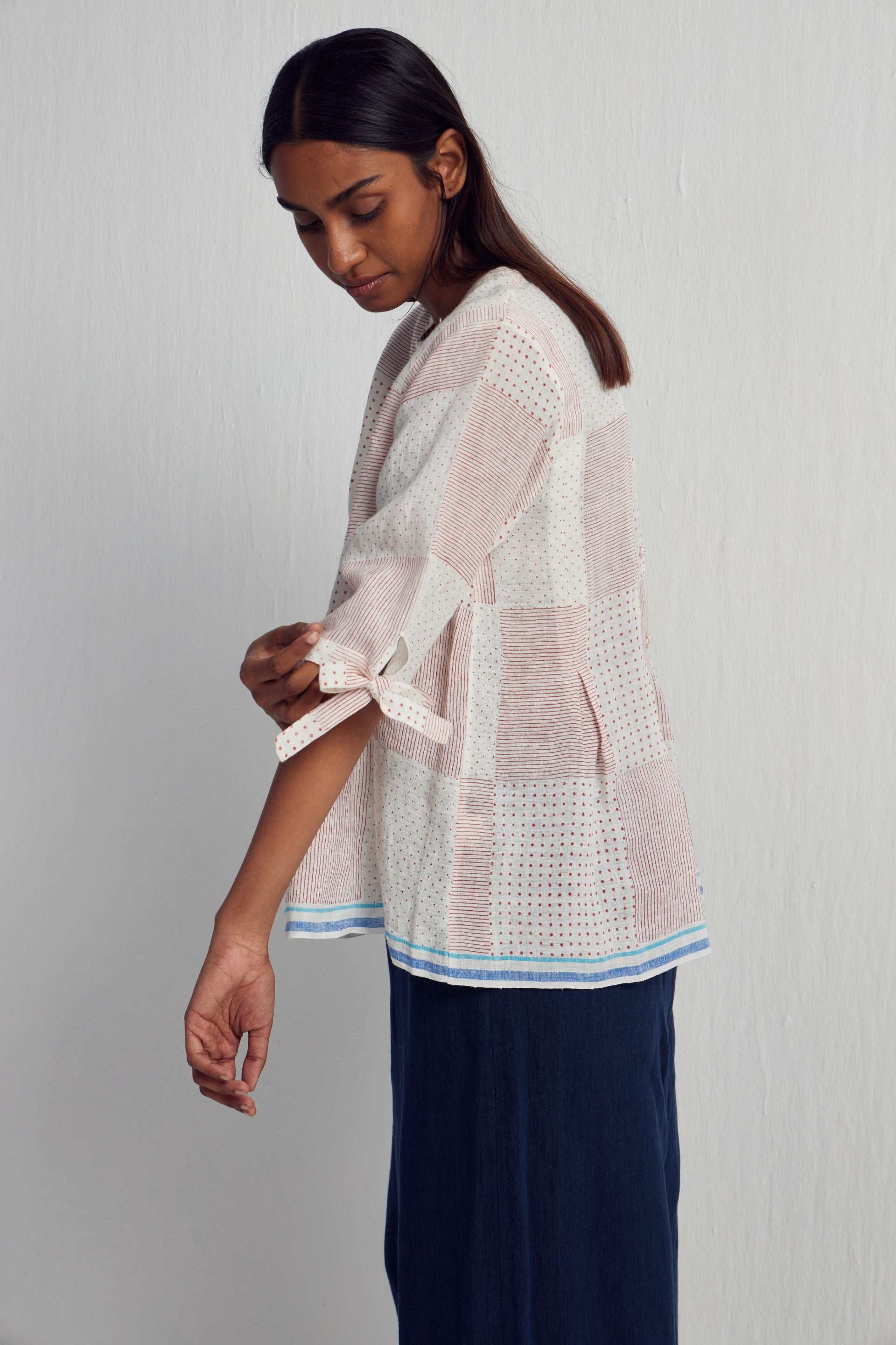 Discover our short top adorned with an all-over Collage hand-block print mix, enriched by intricate hand embroidery and inverted box pleat detail with tie up on sleeves hem. It features contrasting selvedge on the hem and sleeves, complemented by a back button-down open detail.