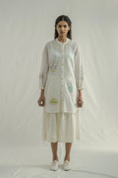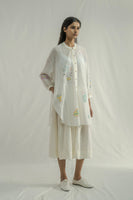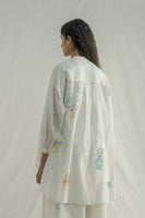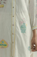 A front-open ,relaxed-fit long shirt with a stand collar, featuring 3/4th puff sleeves, a U-cut hem, and box pleat detailing at the back. Crafted from a white base with a vibrant multicolor placement handblock print, it is finished with yellow handblock print binding along the placket, collar, and cuffs for a striking contrast.