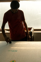 Motifs inspired by the diverse floral elements of Amer were first translated into hand-drawn watercolor paintings. These designs were then meticulously adapted into hand-carved blocks, carefully considering the limitations of the medium. The play with negative-positive space, color separation, and outlining led to both singular motifs and intricate, multi-layered repeats. As many as 80 small and large wooden blocks were used to create pattern repeats for a single garment.