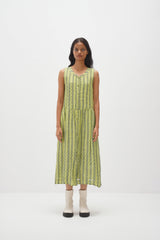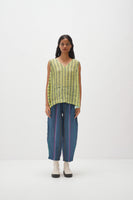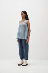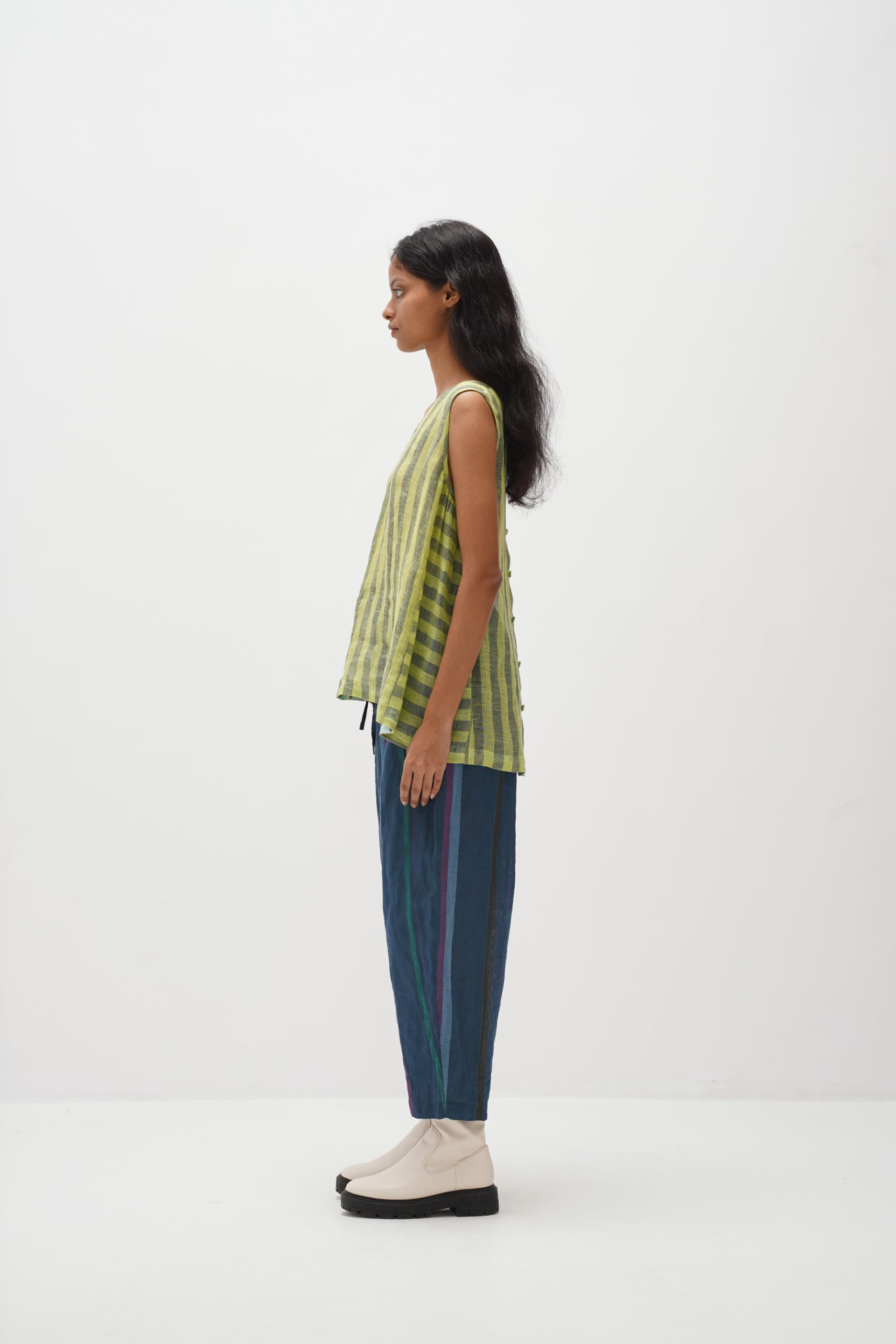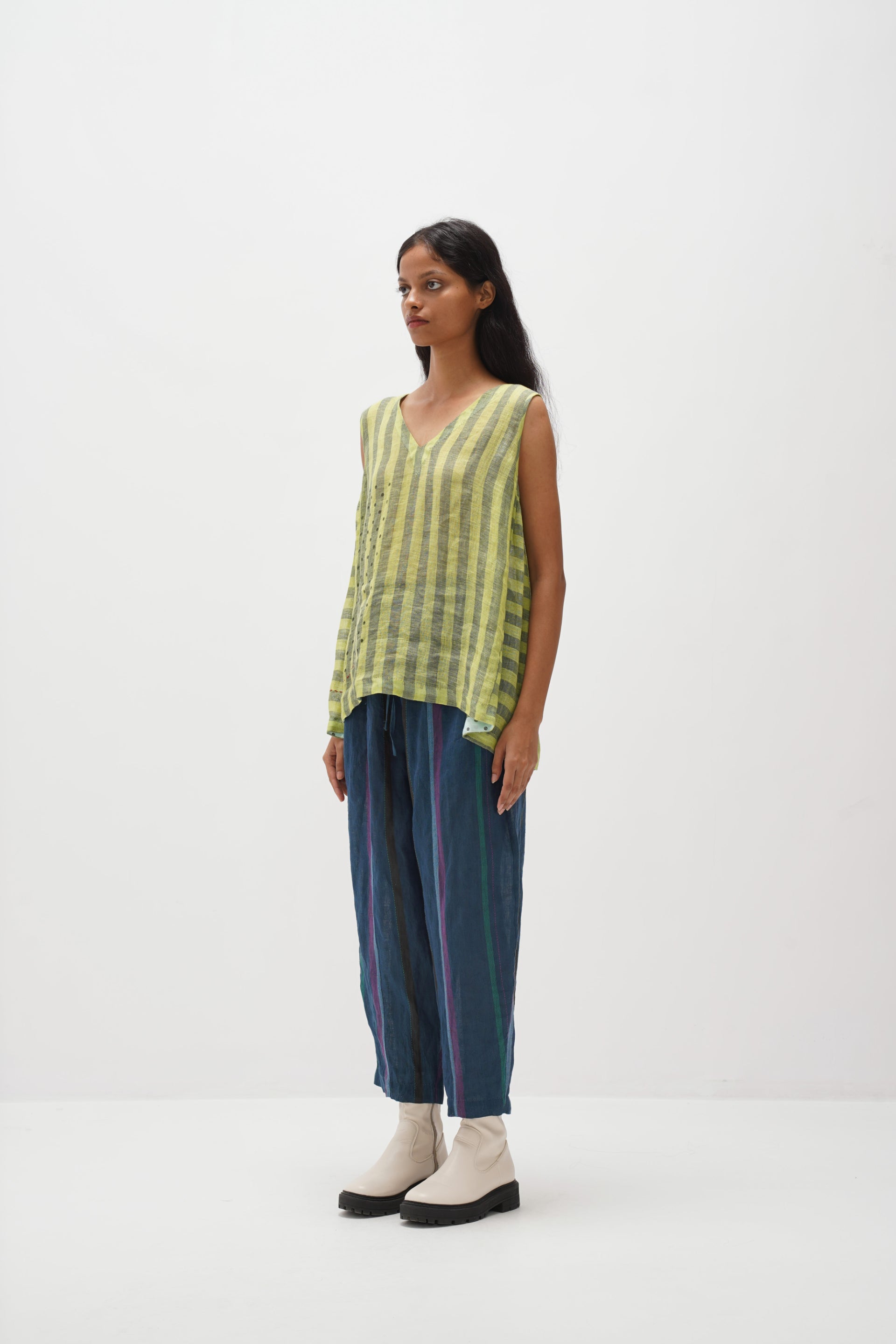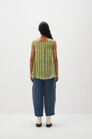 Discover our V-neck sleeveless top in handwoven stripes with a hand-block polka dot print. It features gathers under the armhole, polka dot cotton silk facing, and a stylish button-down back opening.