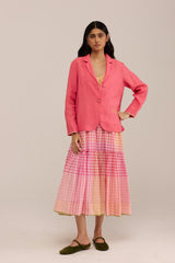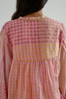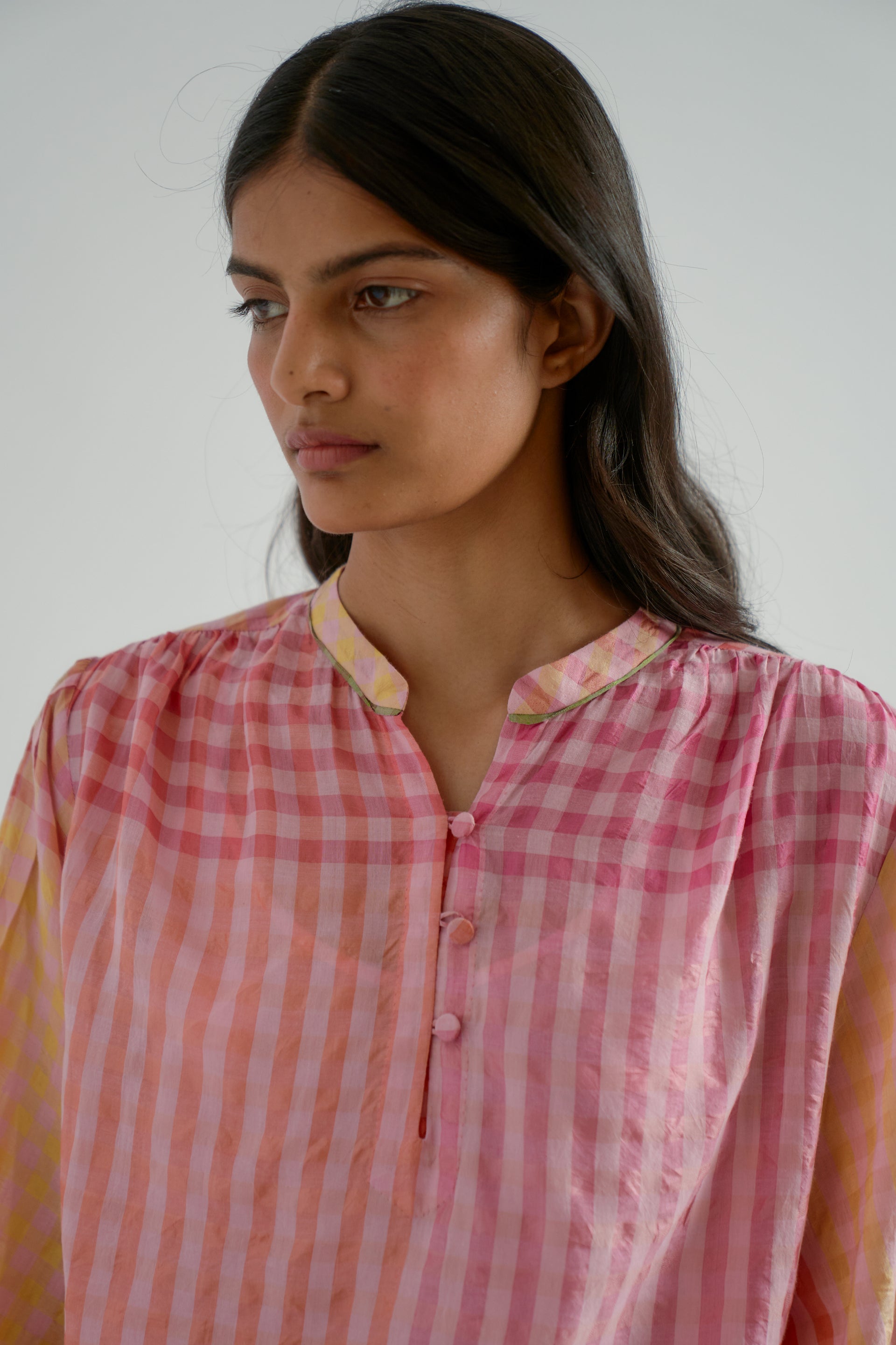 A front open stand collar top with puff sleeves and tuck detail constructed in multicolor checkered cotton silk blend fabric.
