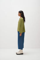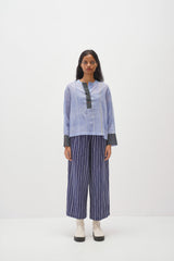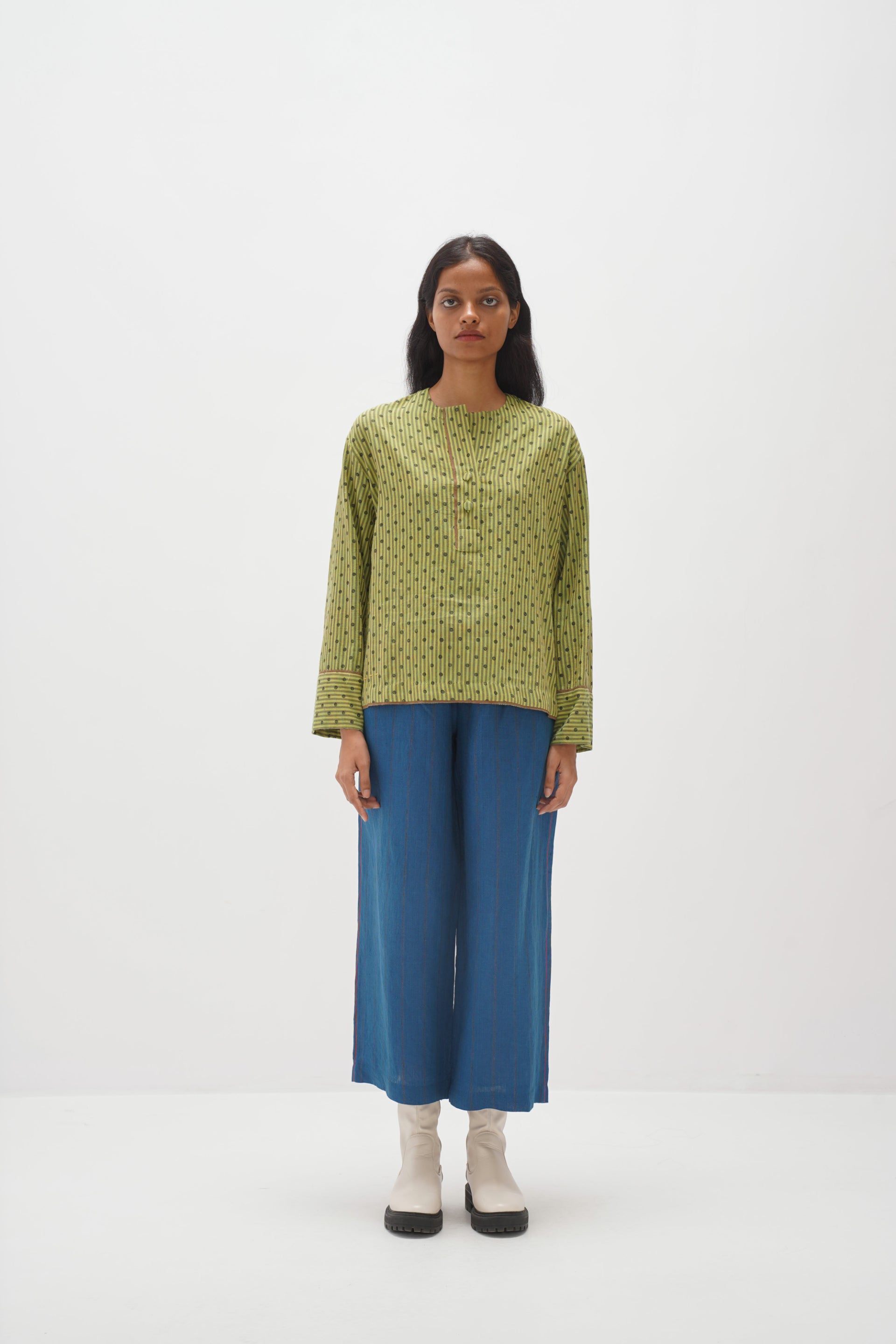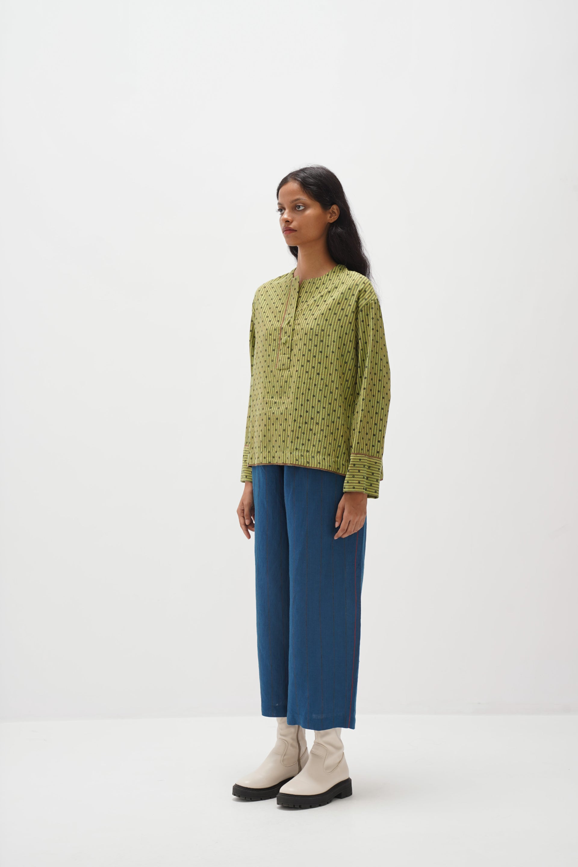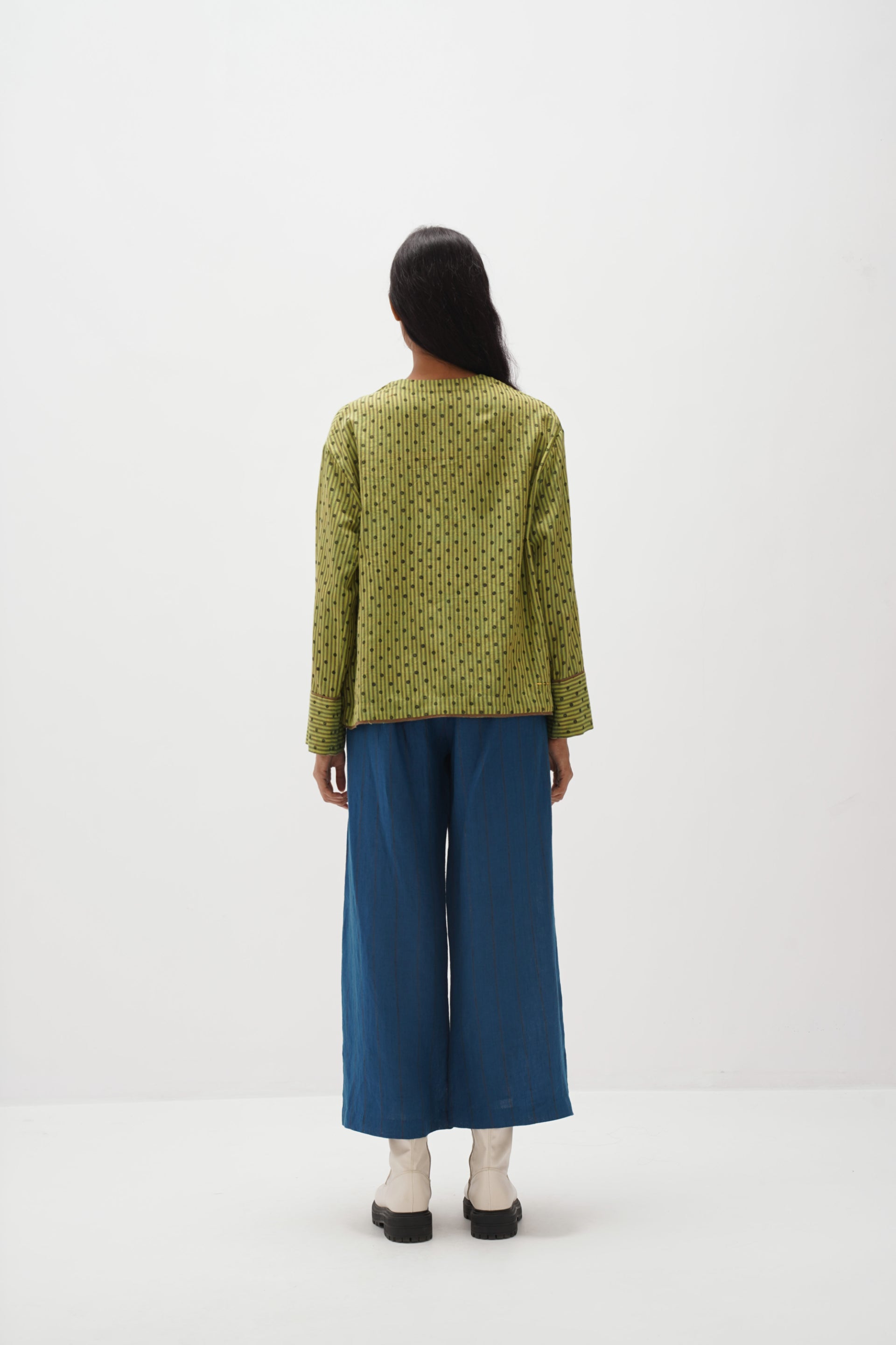 Discover our center-front open top with full cuff sleeves in handwoven stripes and adorned with an all-over hand-block polka dot print. finished with handwoven stripe print facing.