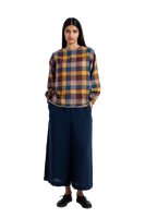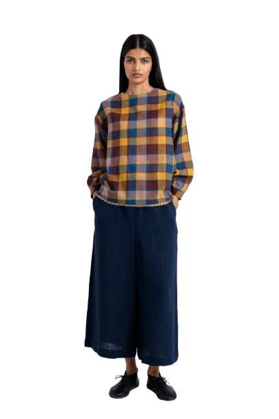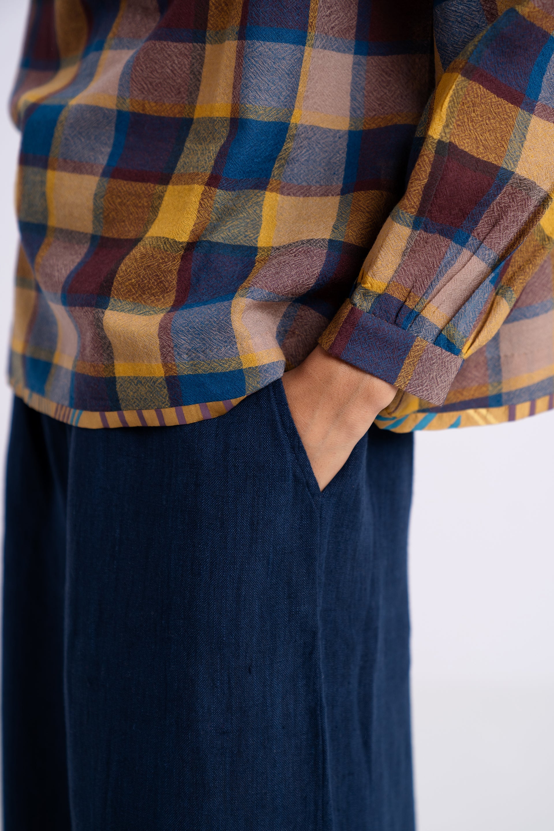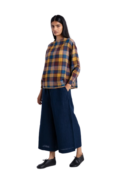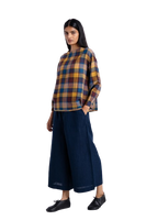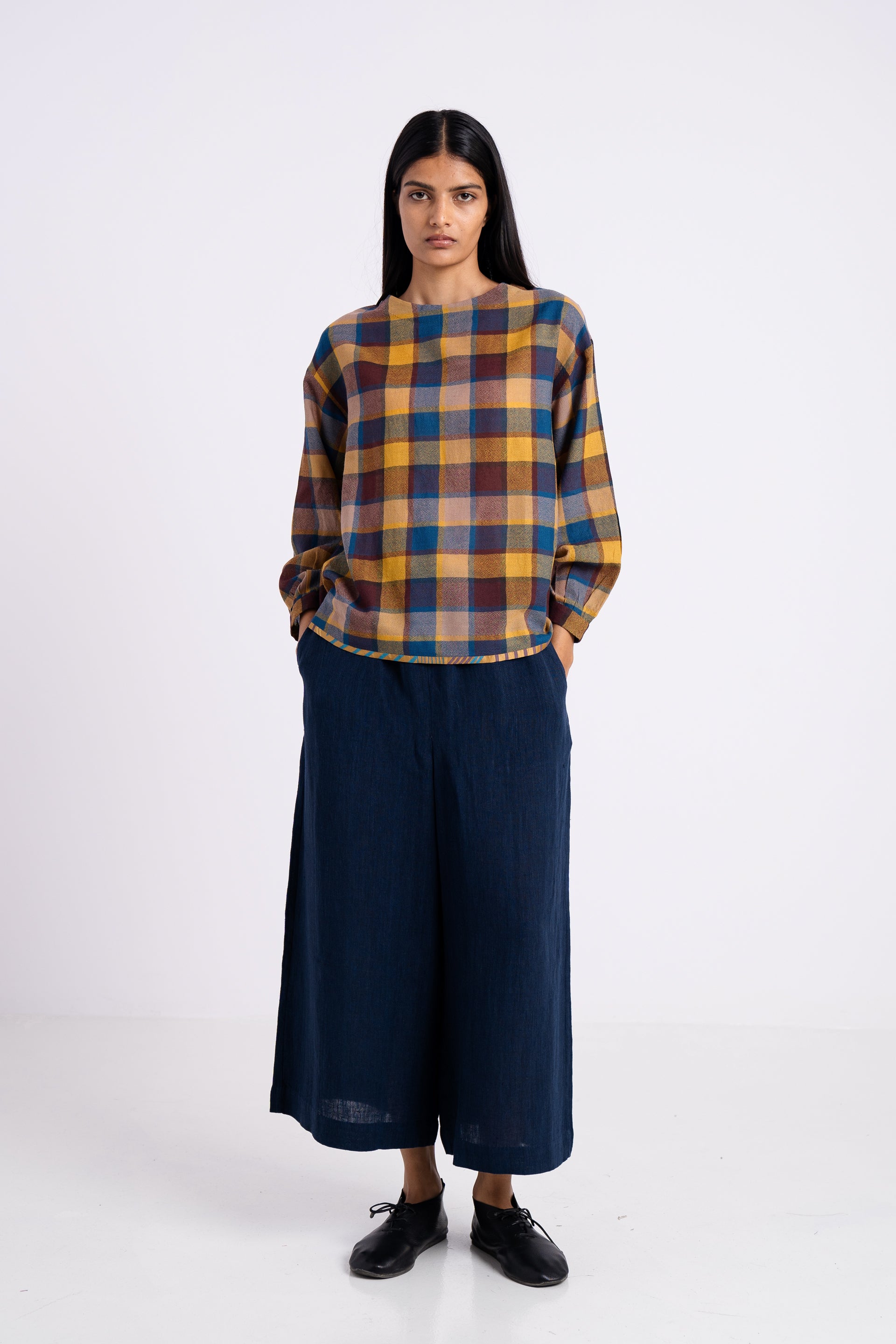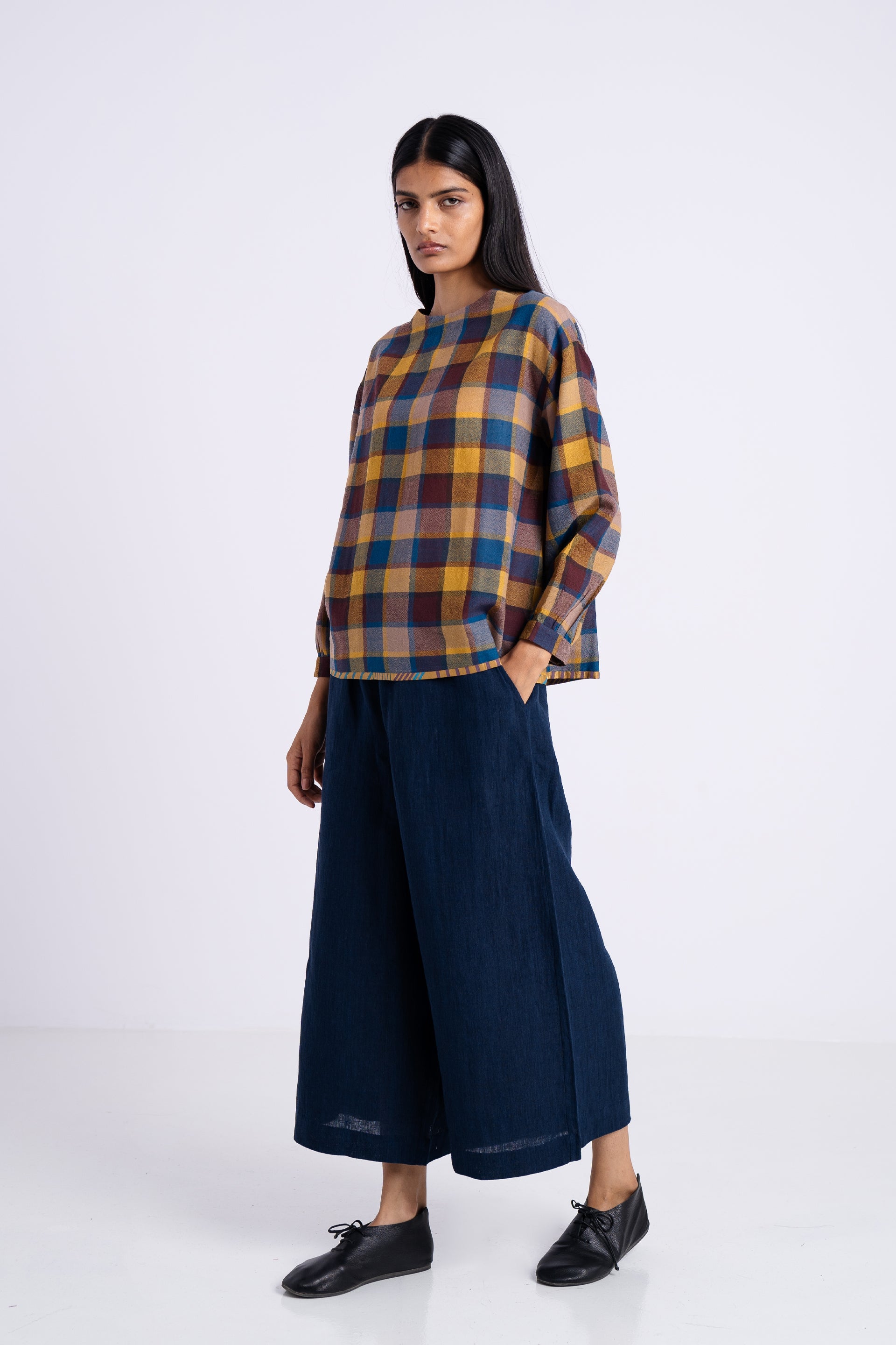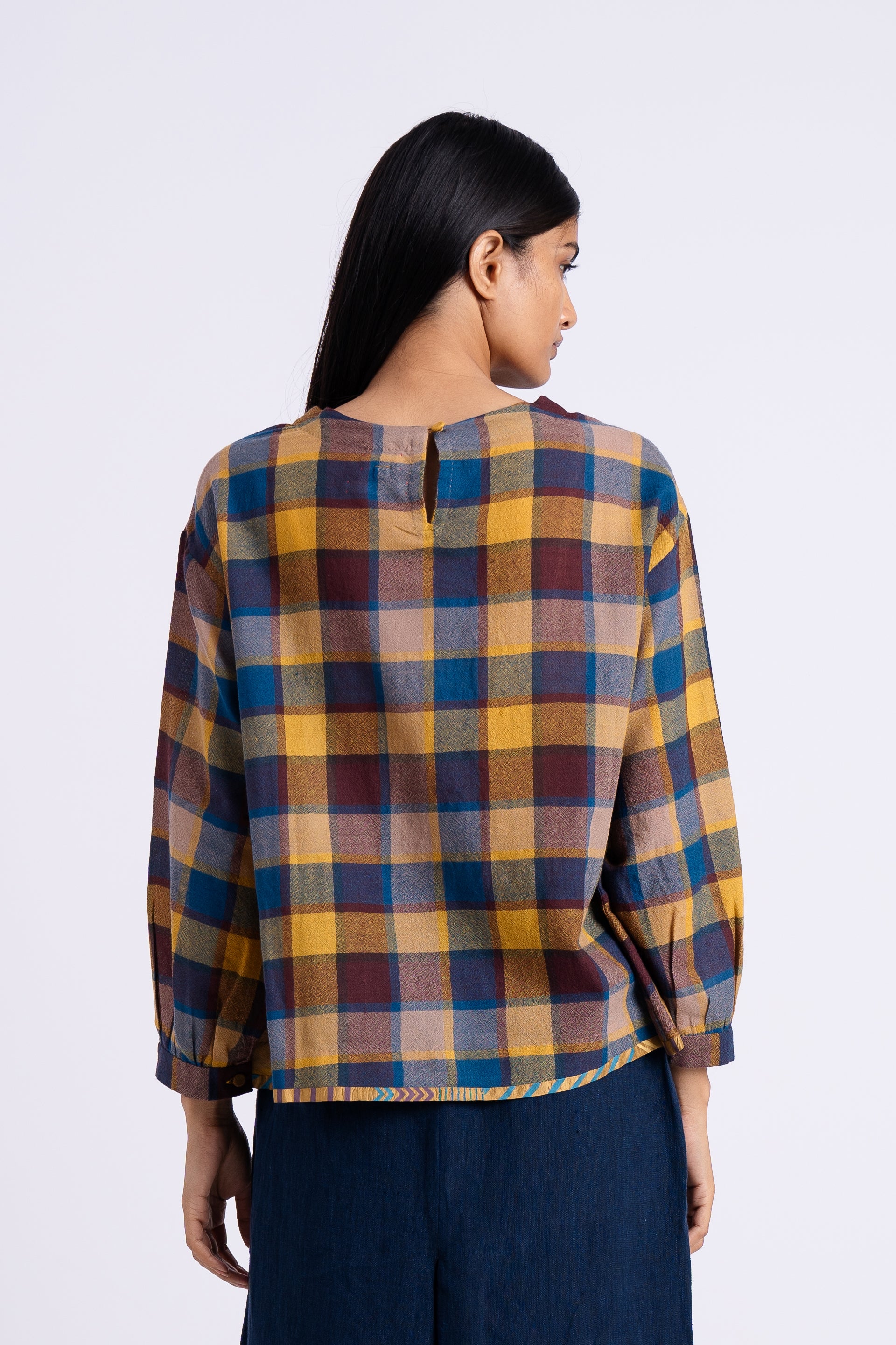 Relaxed fit round neckline drop shoulder top with full sleeves and contrast selvedge detail on hem and button closure on cuffs. Constructed in multicolor checks 100% wool fabric. Finished with contrast multicolor collage handblock print 100% cotton silk blend facing detail.