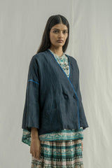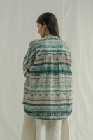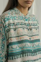 A stand collar, straight fit button down shirt with front opening and full sleeve. crafted from a cotton silk-blend fabric, featuring an all-over handblock print with 17 meticulously aligned hand blocks.