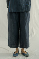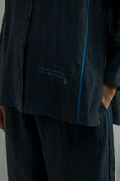 A stand collar, straight fit front open button down shirt with full sleeve. constructed in solid 100% linen fabric with contrast selvedge detail.