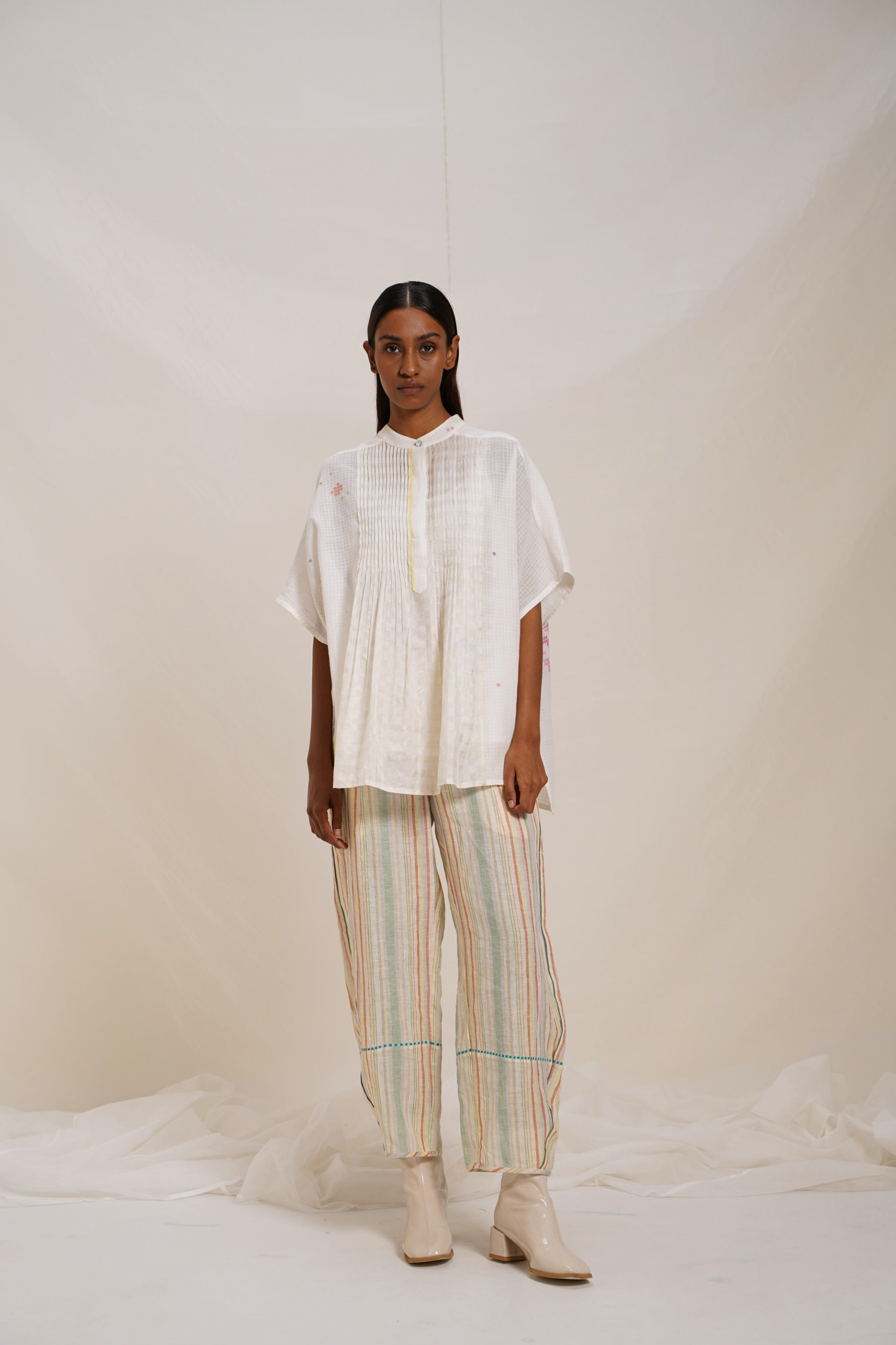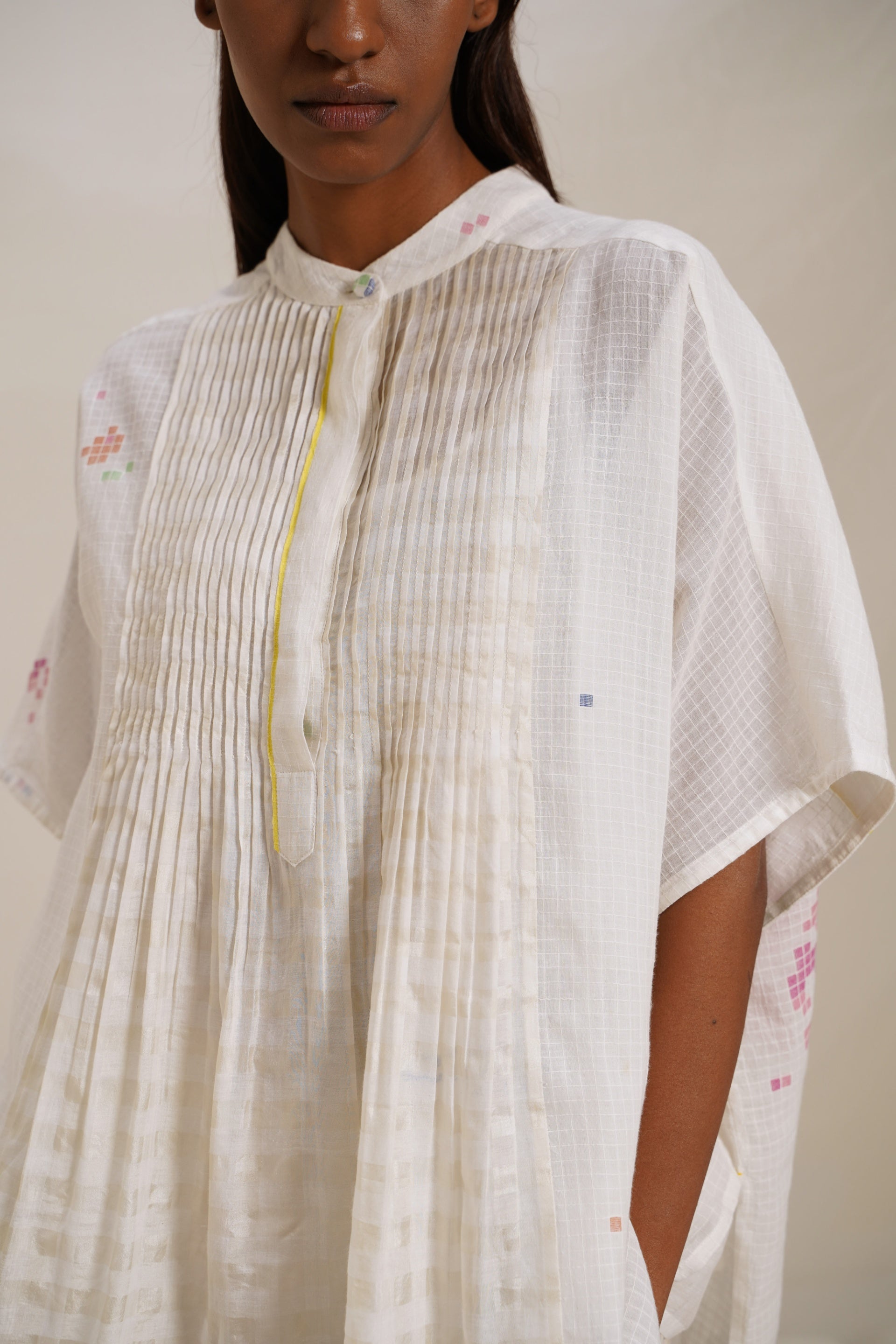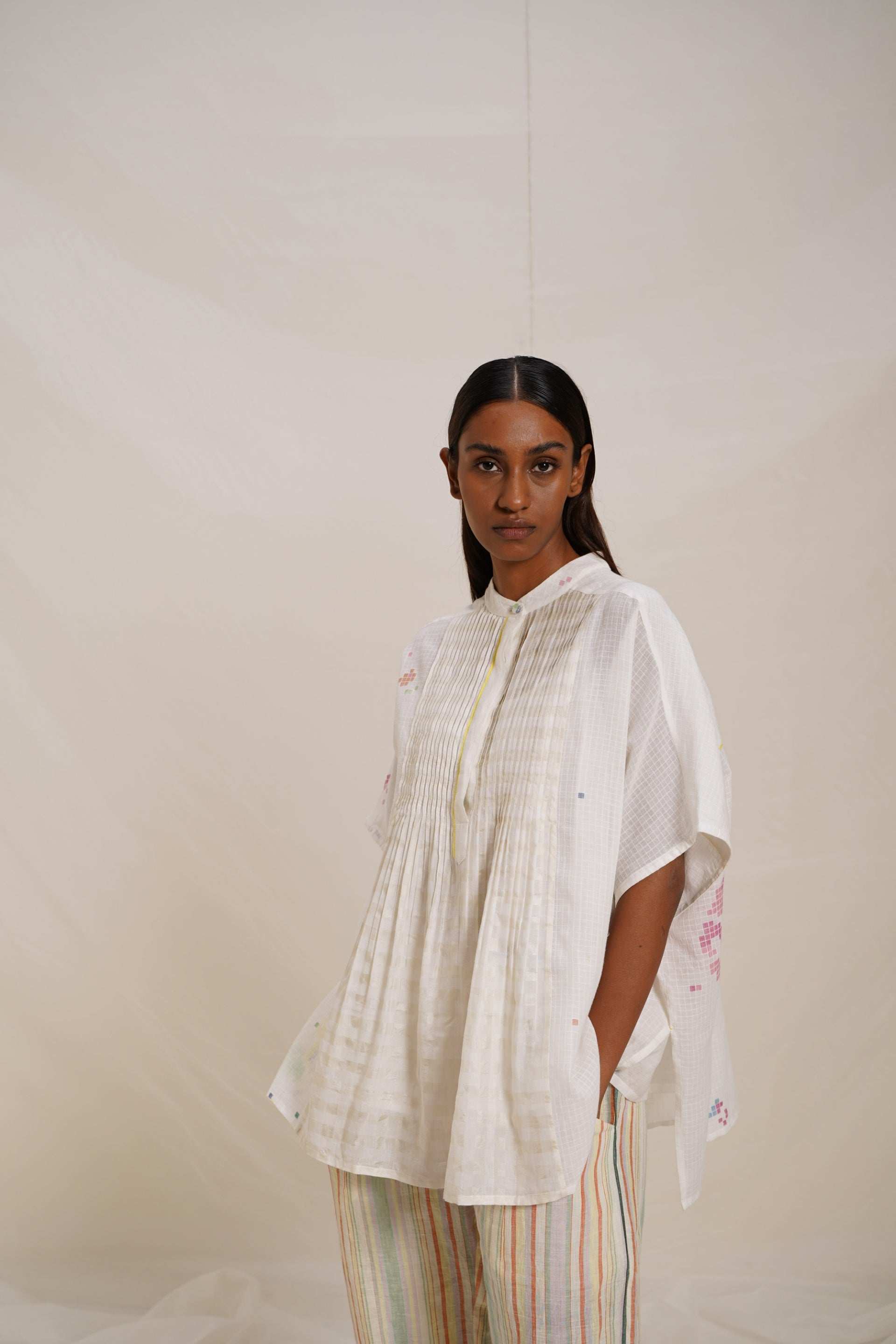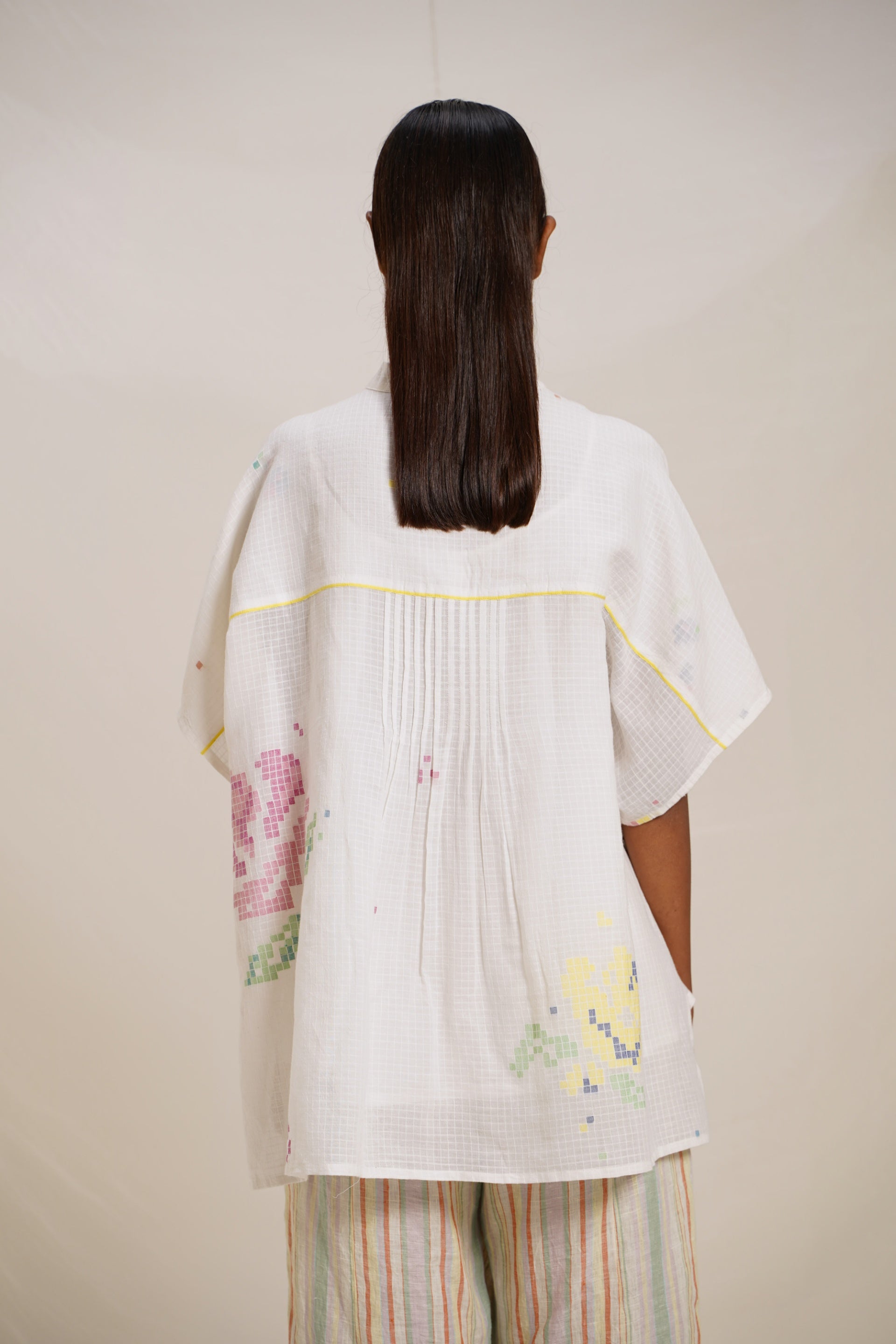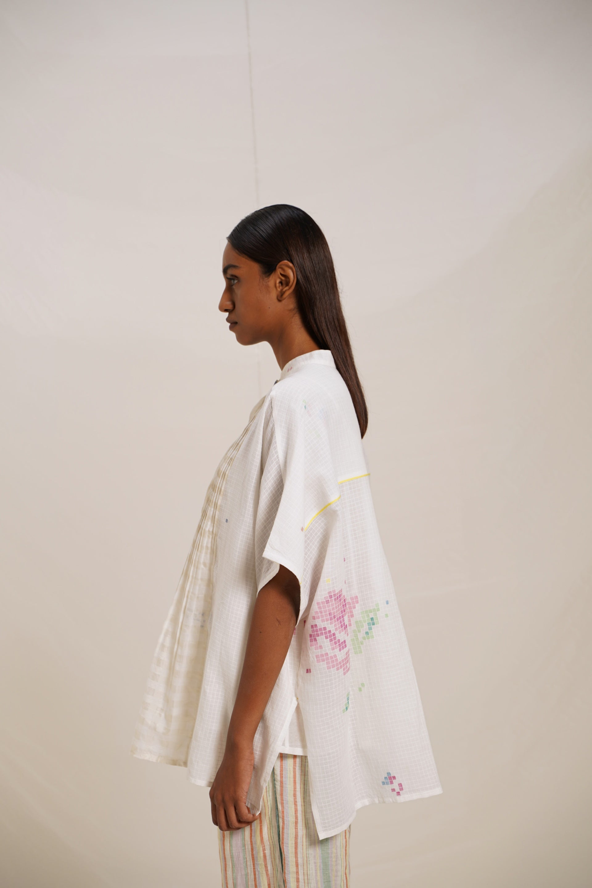 Short top effortlessly combines playful floral prints with thoughtful design elements. The combination of the all-over floral pattern creates a striking visual appeal of contrast border design. With jamdani details and pin tucks with some gathered at the back. Comes with a separate text printed lining.