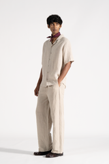 Flare trouser with contrast selvedge detail on side seam in solid cotton linen fabric.