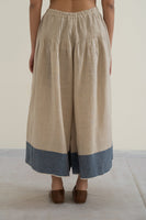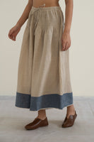 Wide leg culottes with elasticated waist and drawstring in handwoven linen with pin tucks on the waist and contrast selvedge detail on bottom