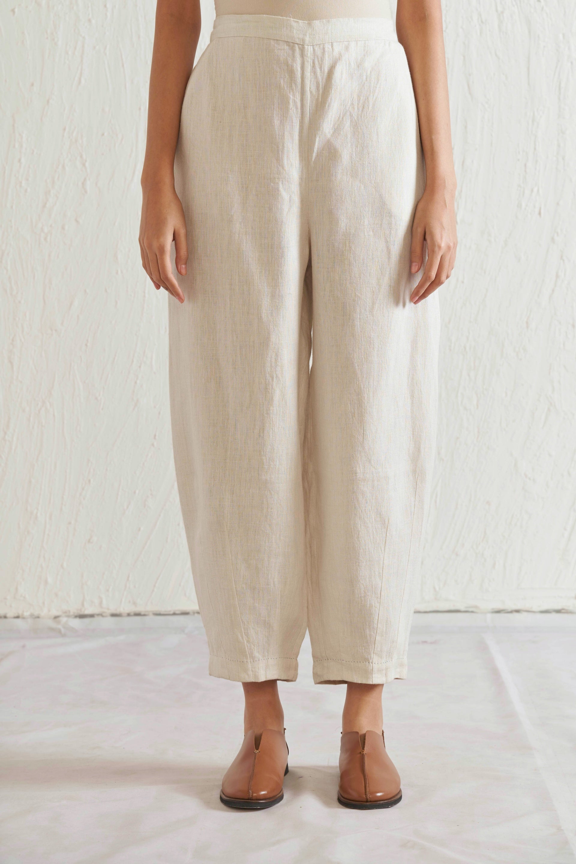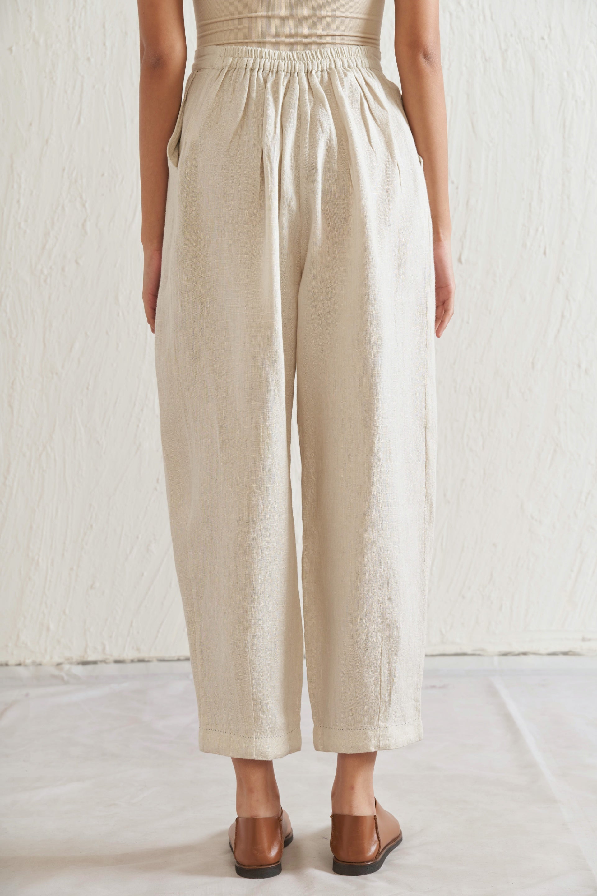 Tapered trousers with pleated hem in handwoven linen with elasticated back and pockets.