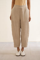 Tapered trousers with pleated hem in handwoven linen with elasticated back and pockets.