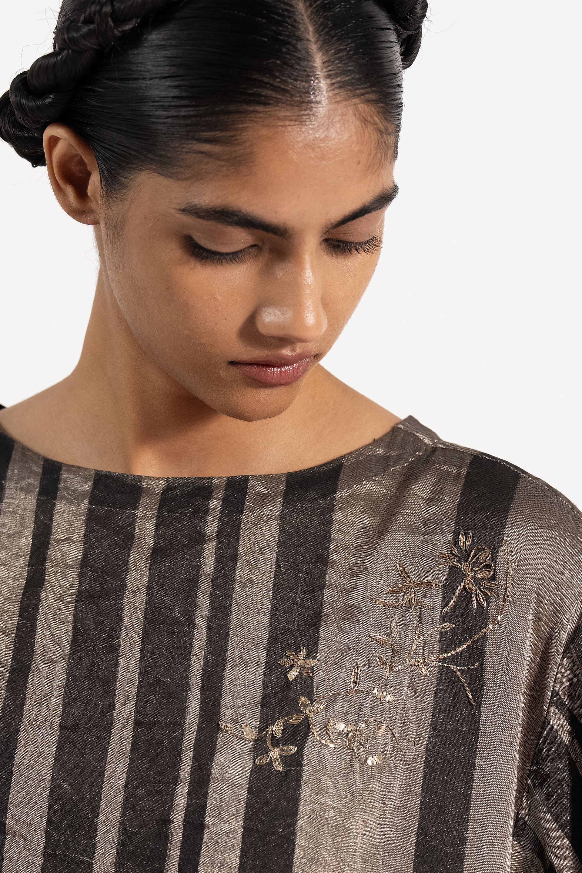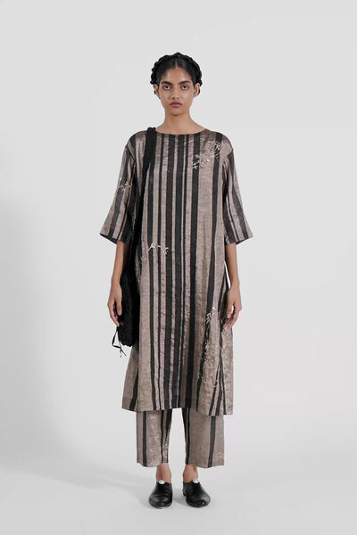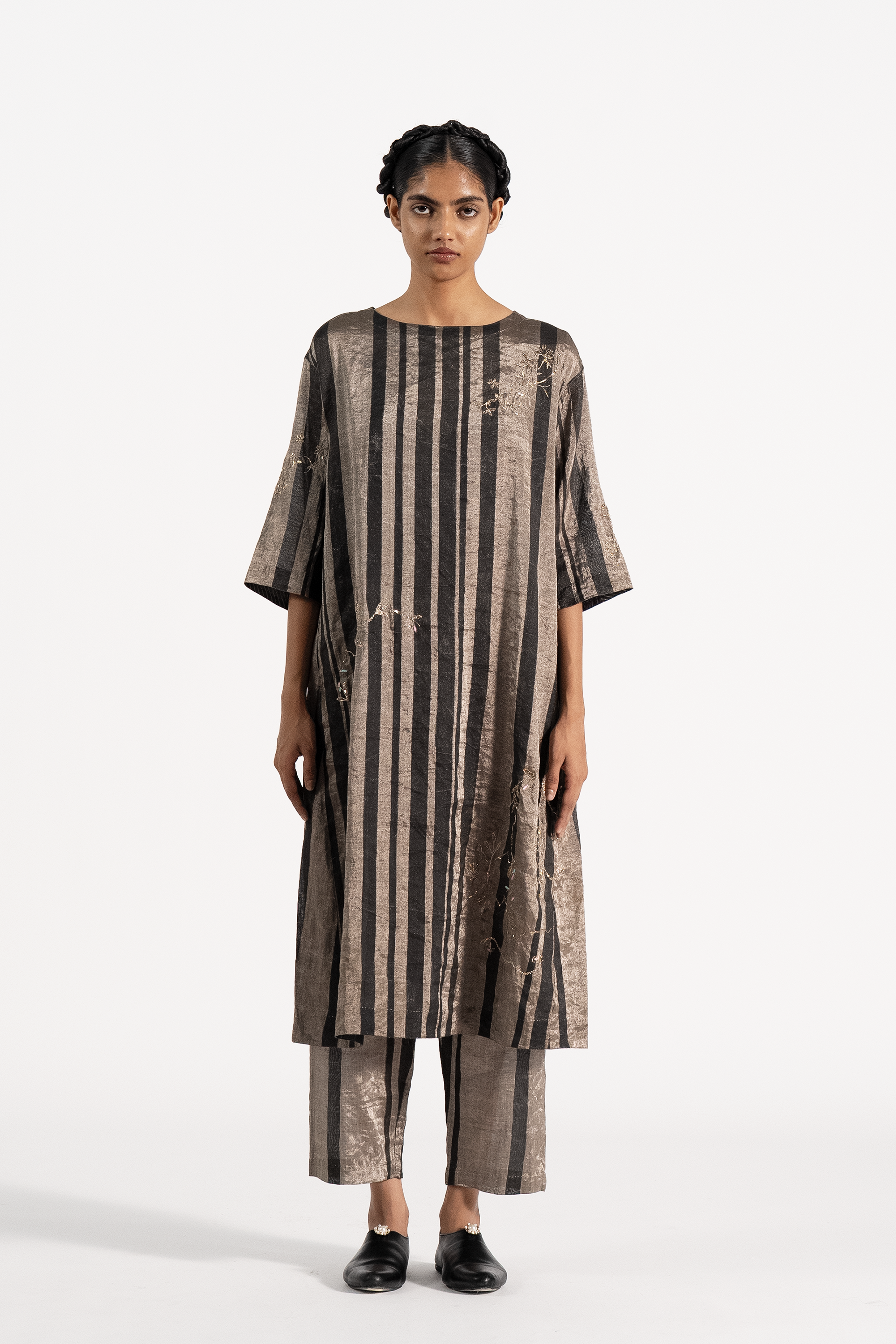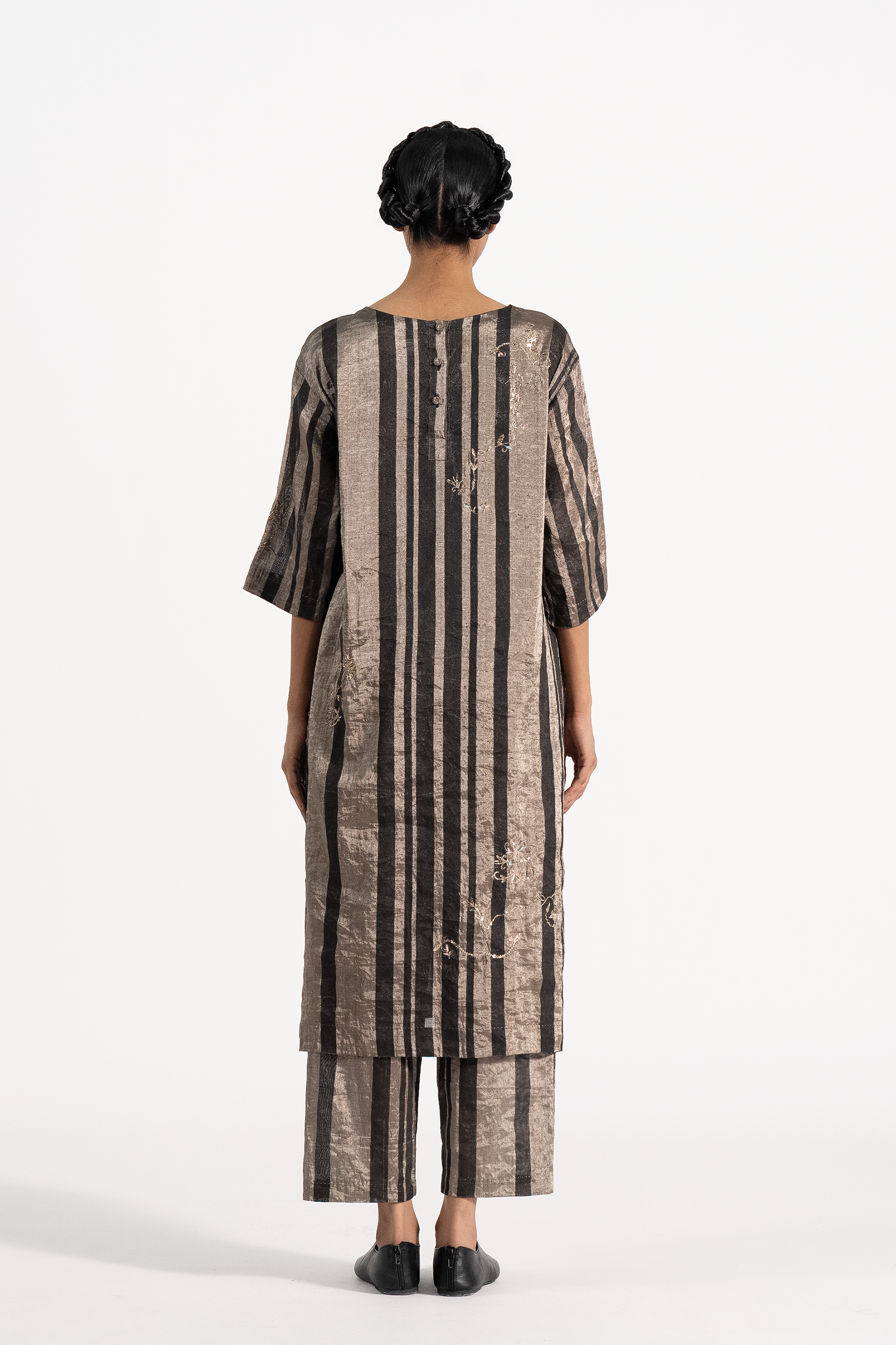 Round Neck Midi Length Kurta With 3/4th Sleeve And A Placket On The Back  With Floral Zari Hand Embroidery. Comes With A Pair Of Straight Fit Linen Zari Pants.