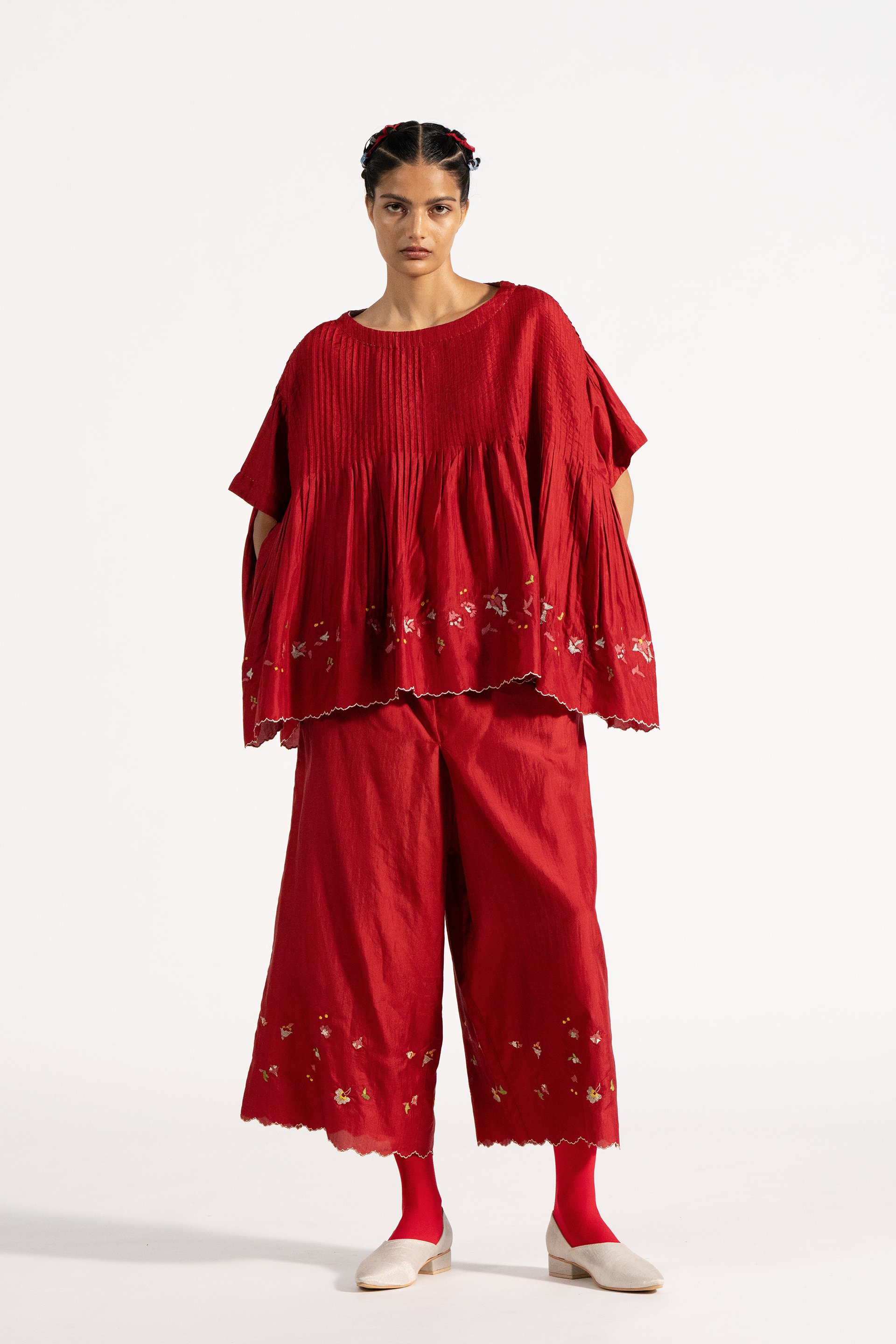 Oversized boat neck top in handwoven silk with gathered side panels. With multicolor floral embroidery on hem.