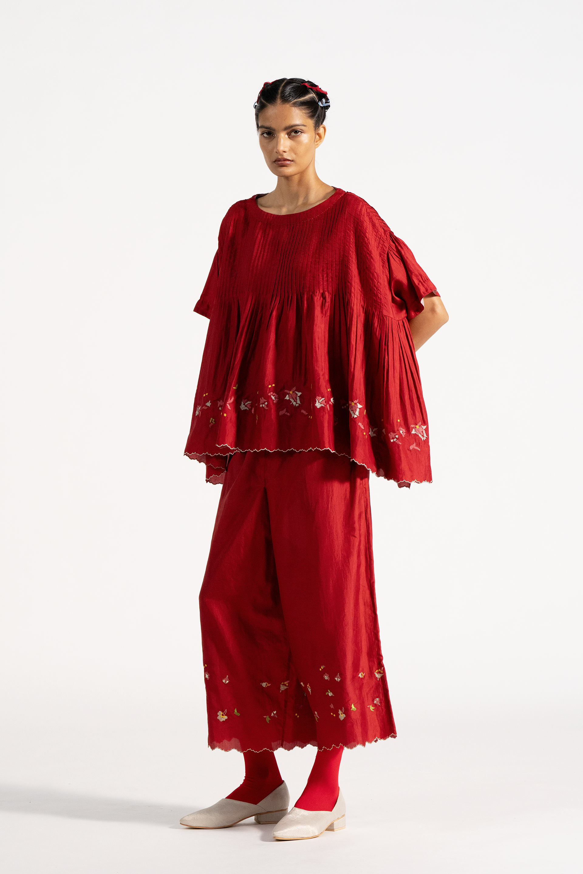 Relaxed fit boat neck allover pintuck top with pintucks and gathers on the side panel. Constructed in scatter multicolor floral embroidery on silk fabric.