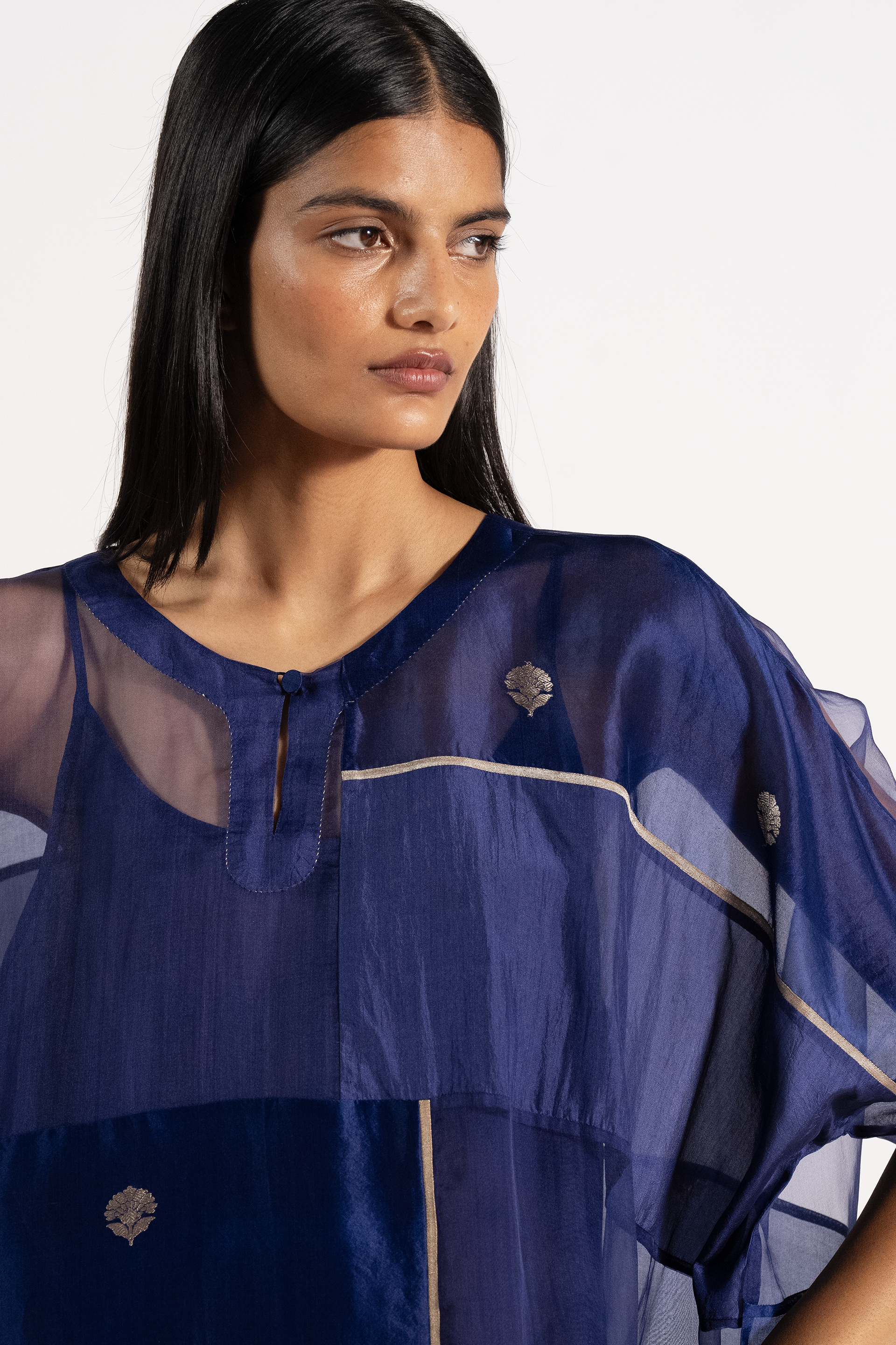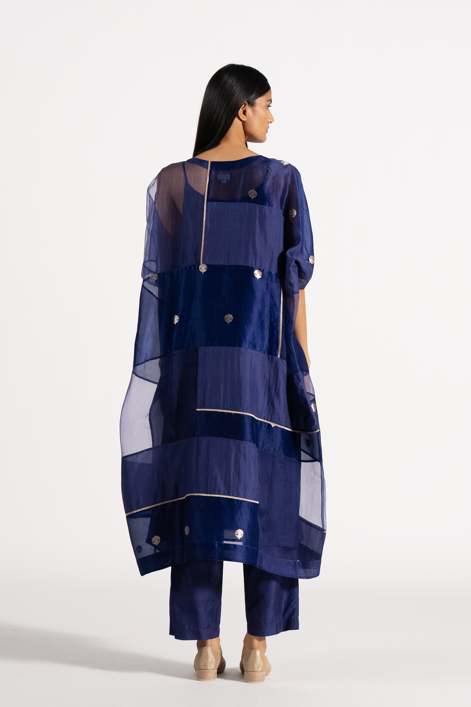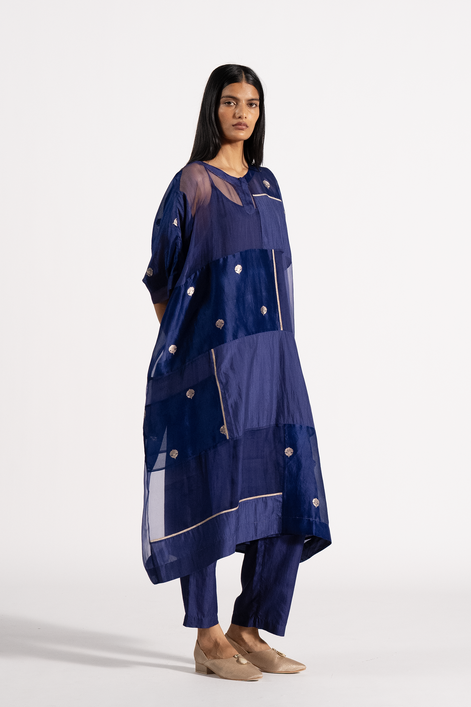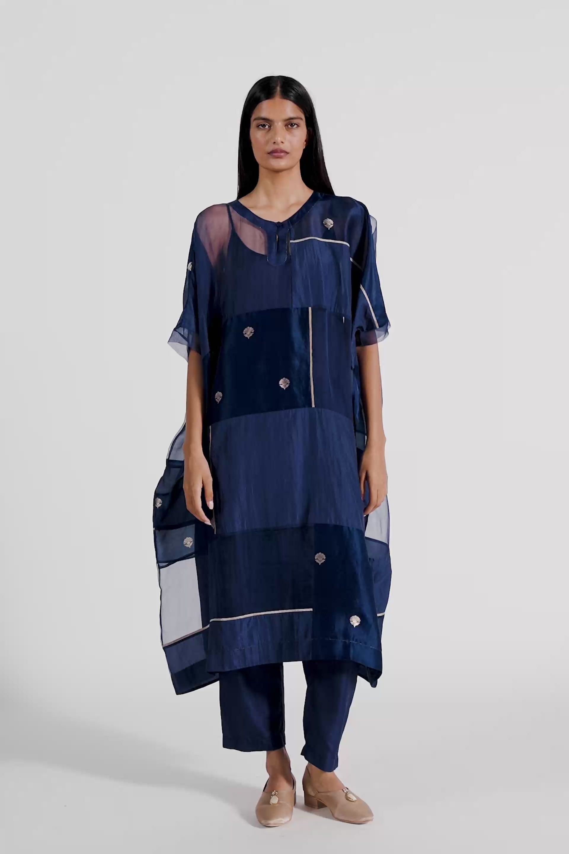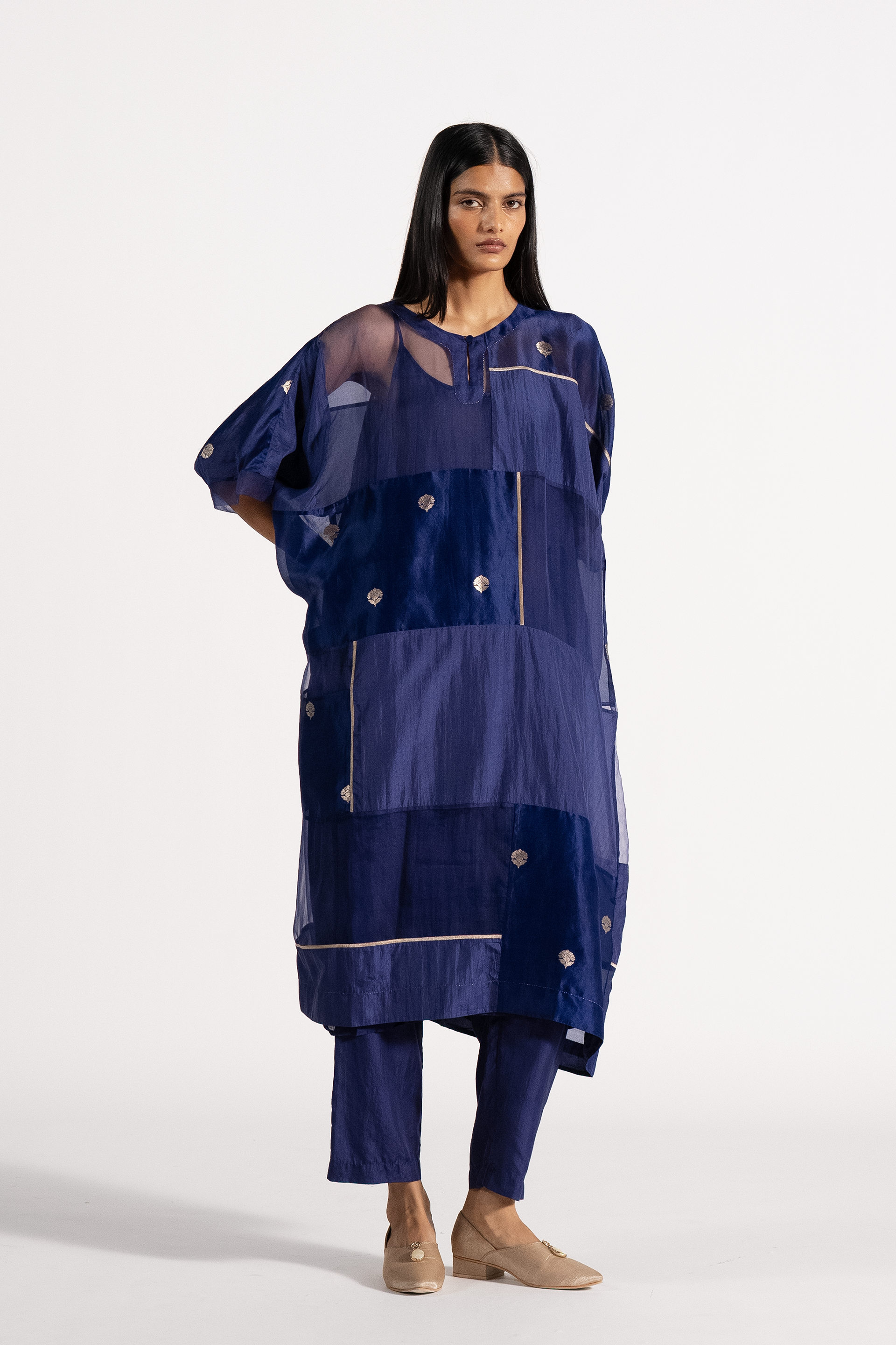 Oversized Round Neck Patchwork Kaftan Kurta Dressin Jacquard Butti Silk Organza. Comes With A Separate Cotton Silk Lining And Paprika Pants In Silk.