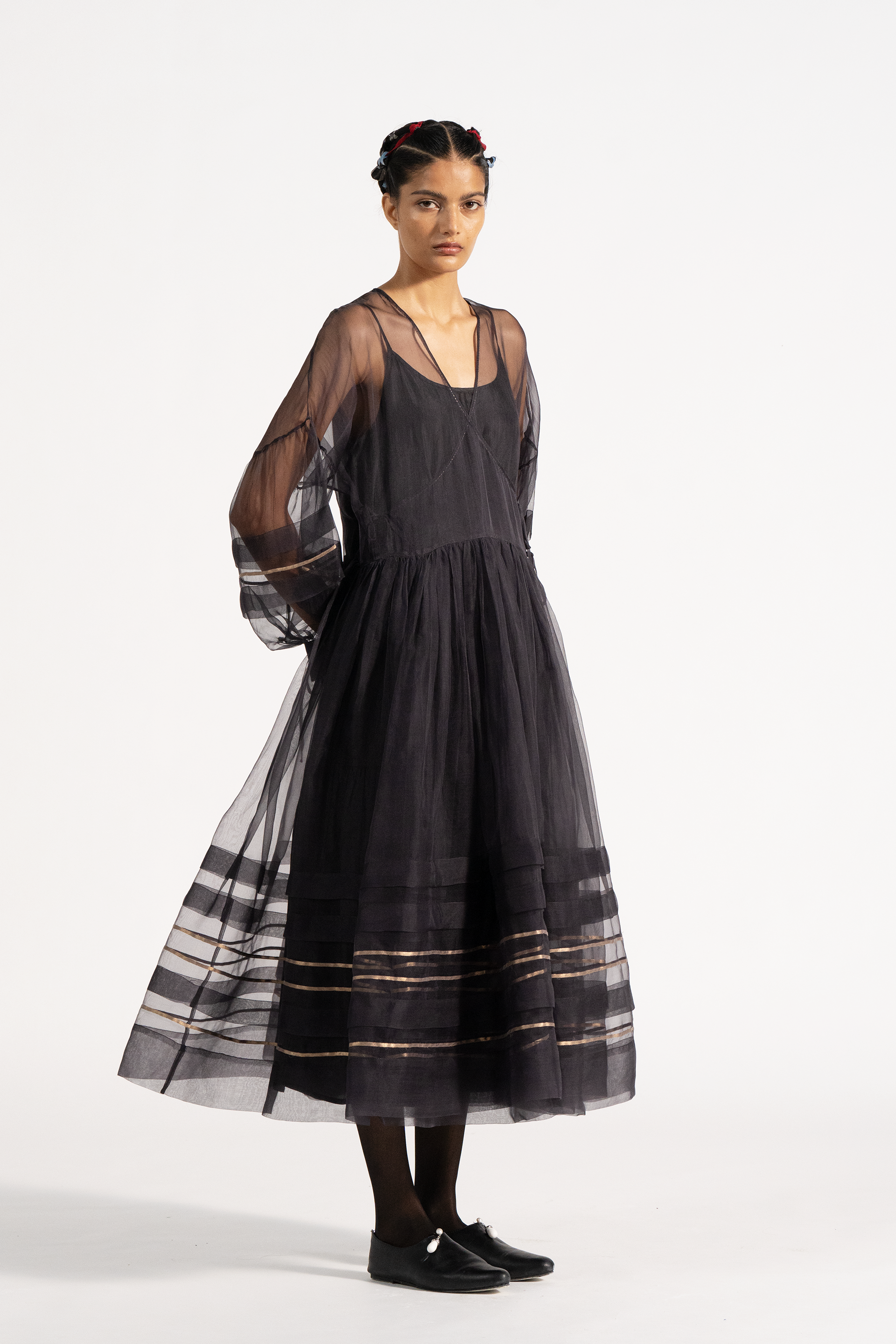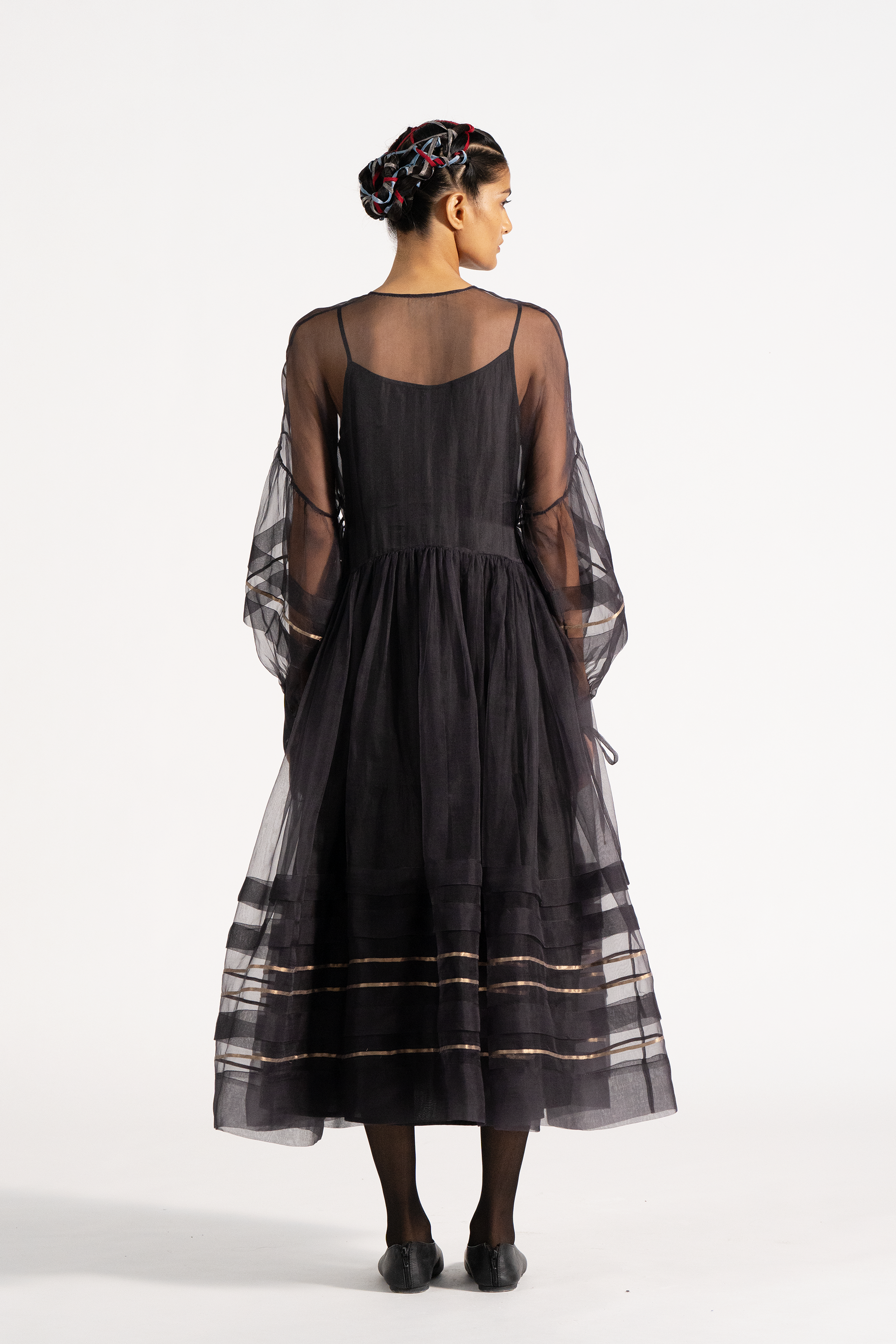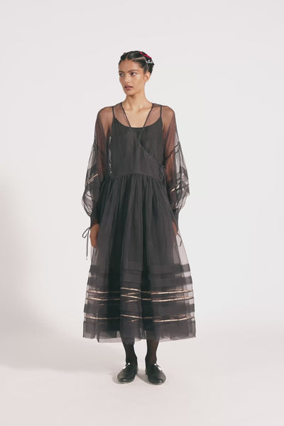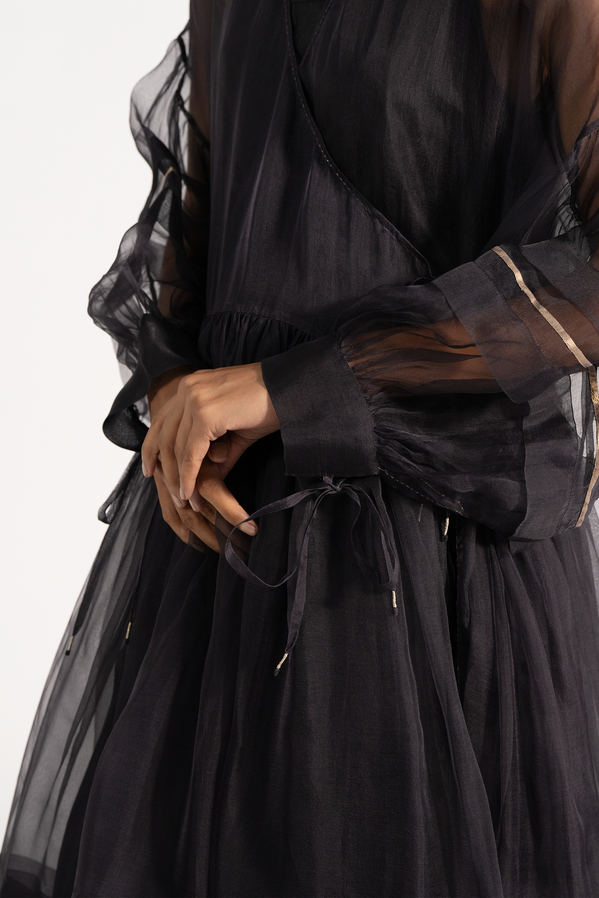 Oversized tiered wrap-around overlay dress in silk organza with golden silk brocade binding. Comes along with a complimentary cotton silk lining.