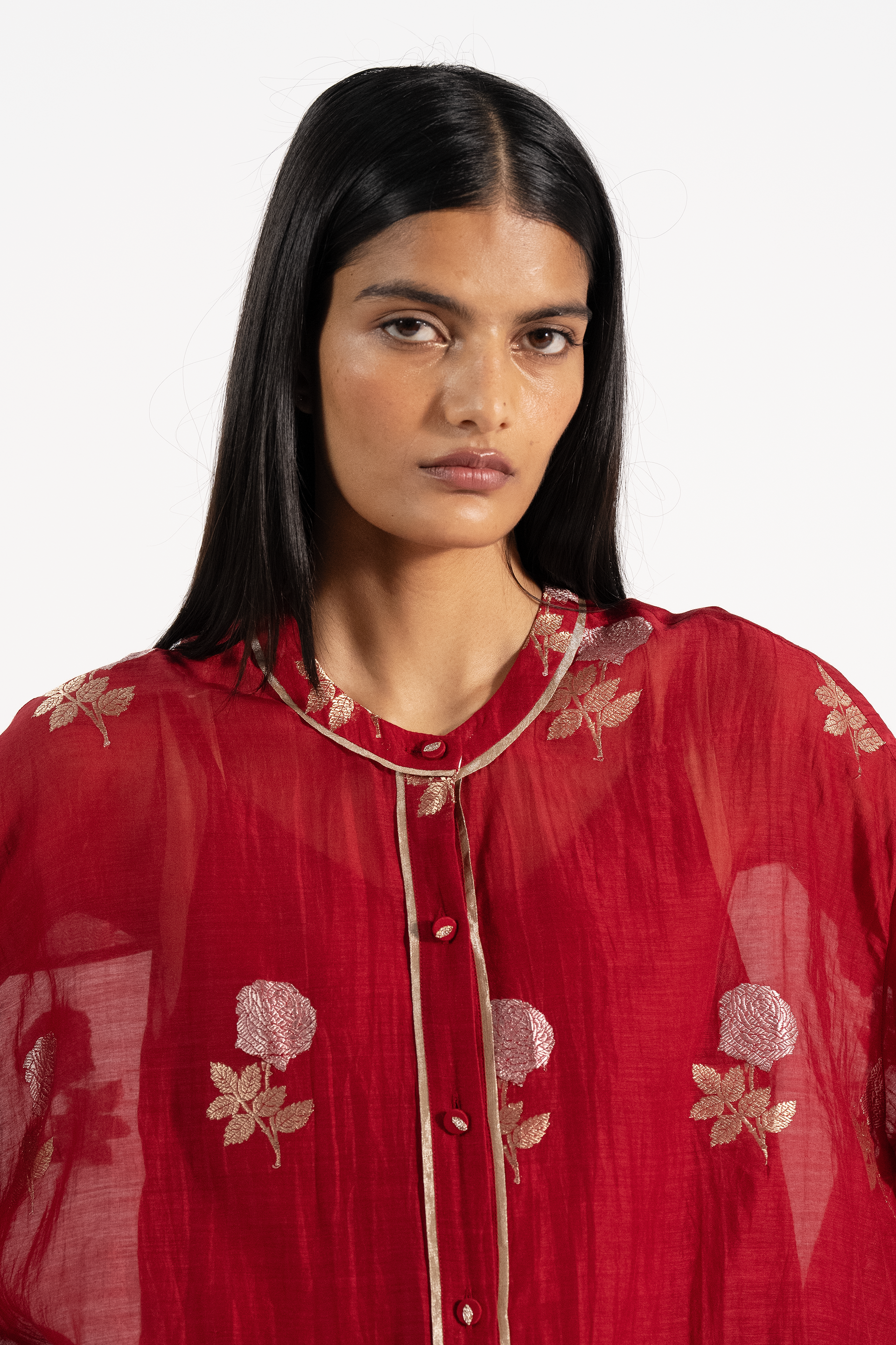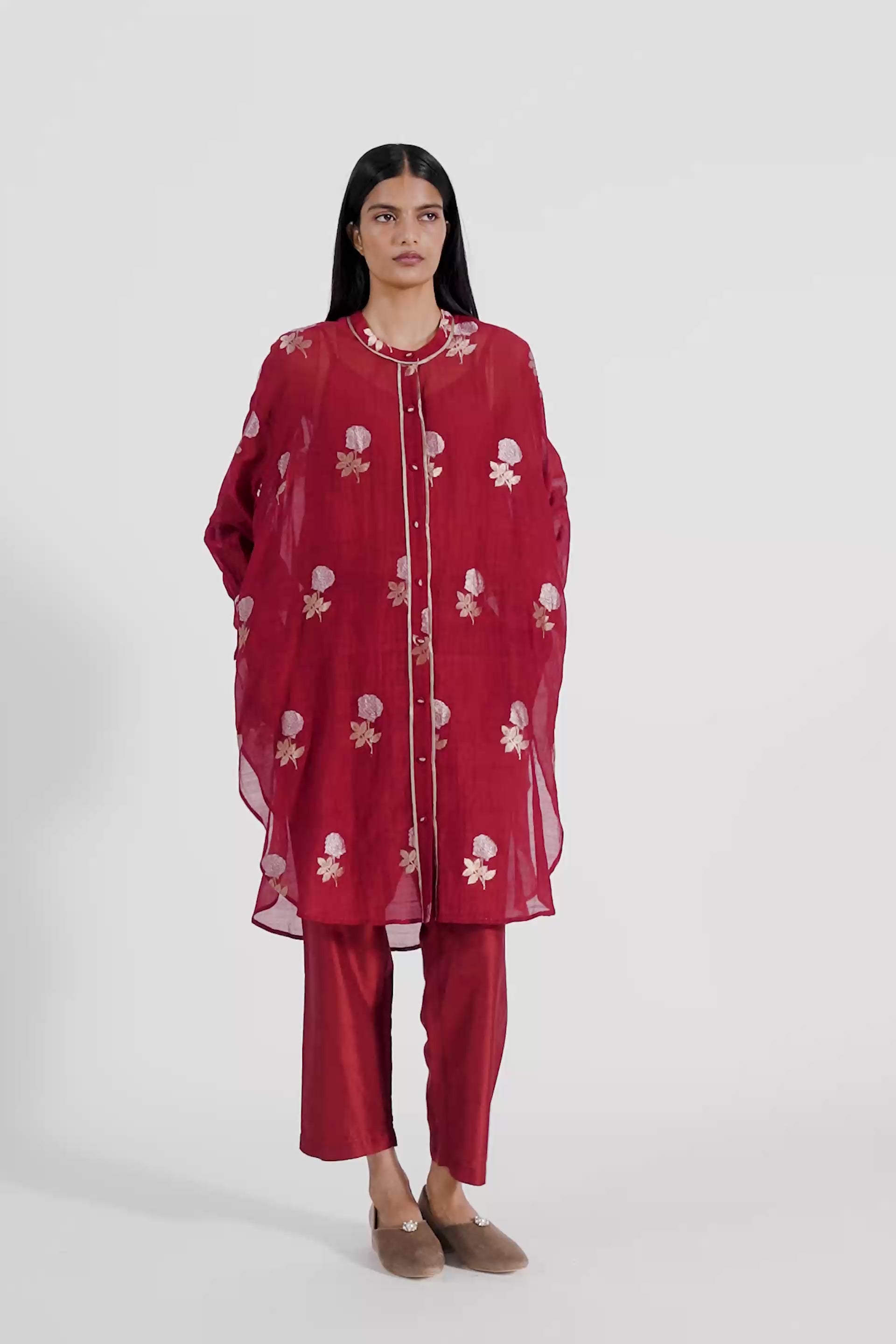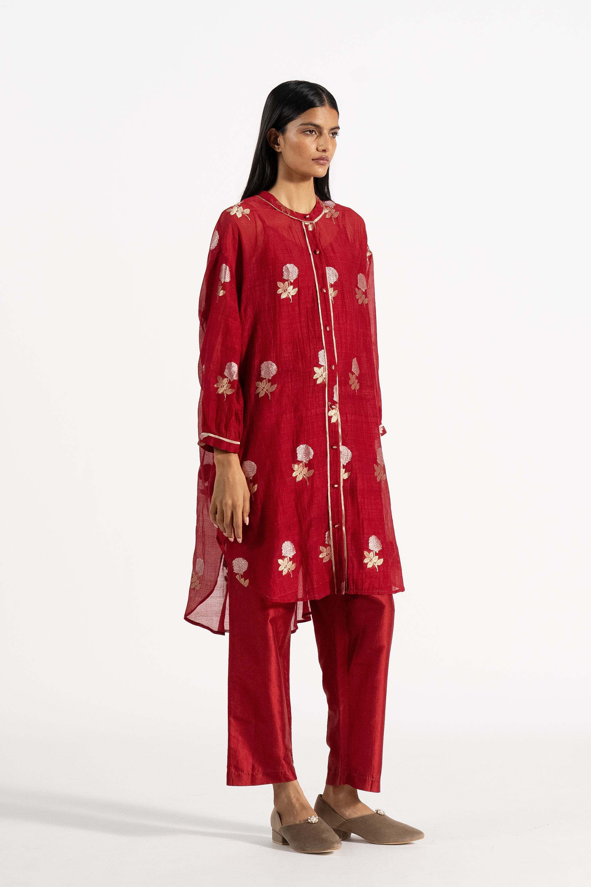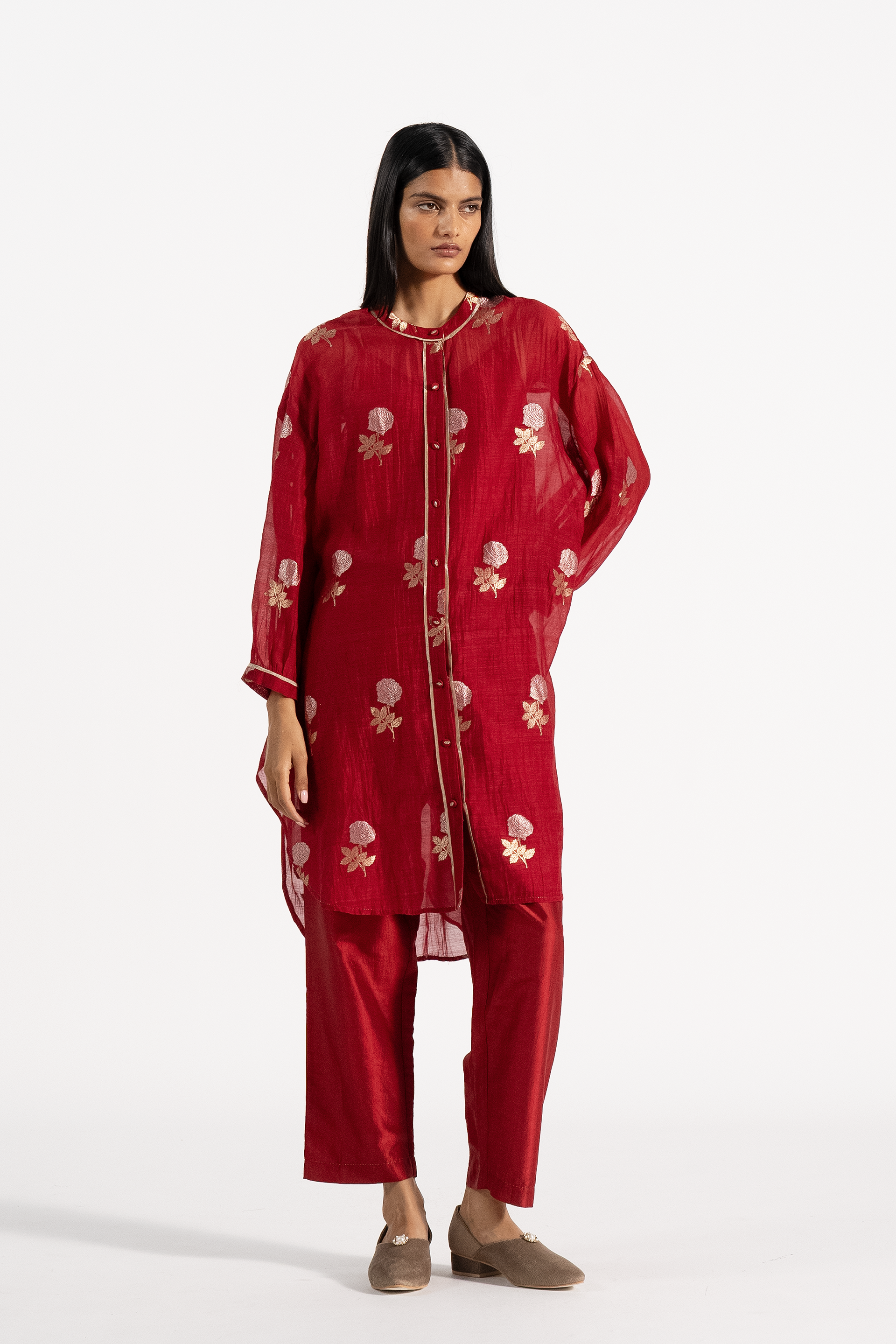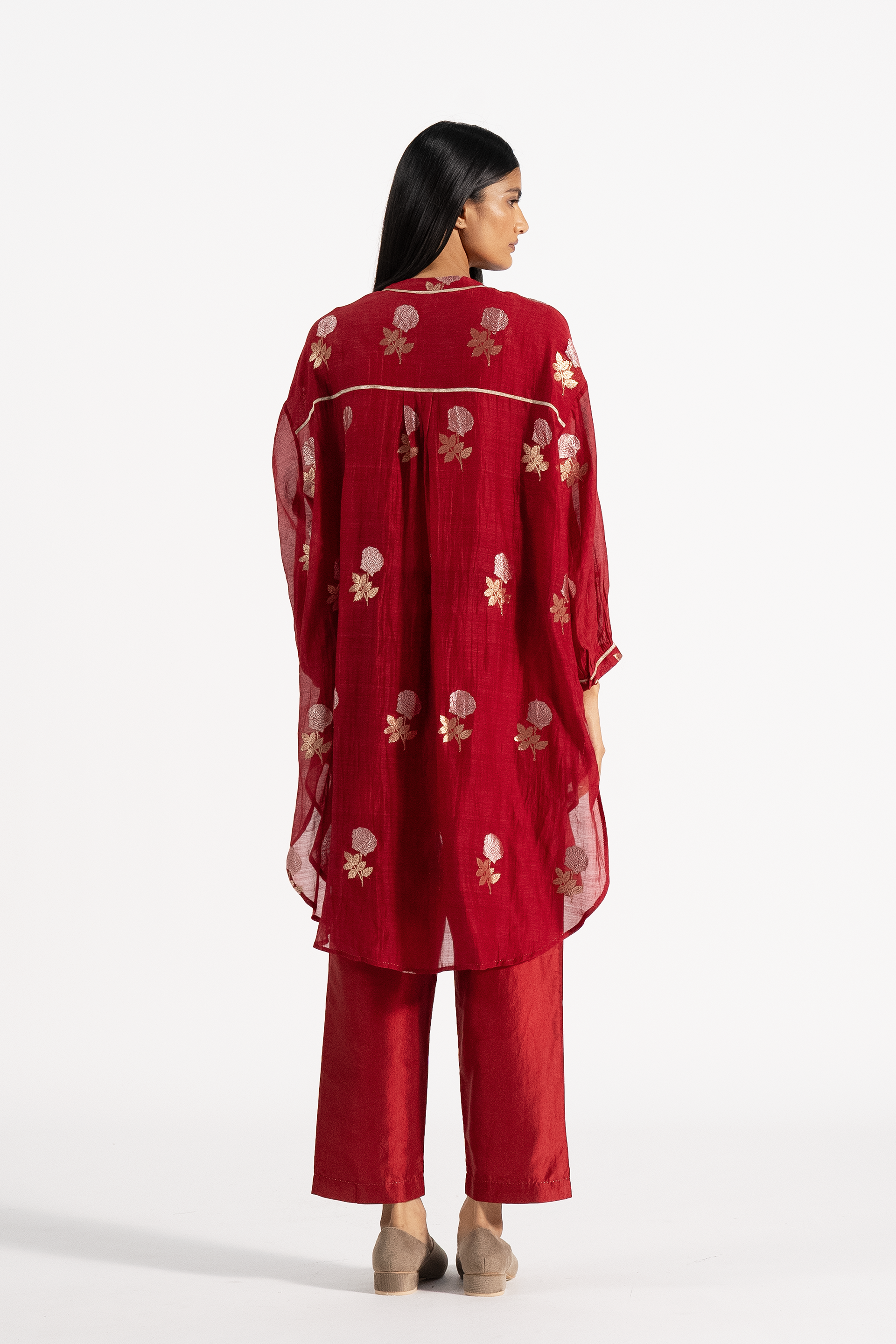 Oversized Fit Front Open Long Top With 3/4 Puff Sleeves With U Cut Hem Detail In Butti Chanderi Silk With Gold Binding. Comes With A Lined Straight With Pant In Silk.