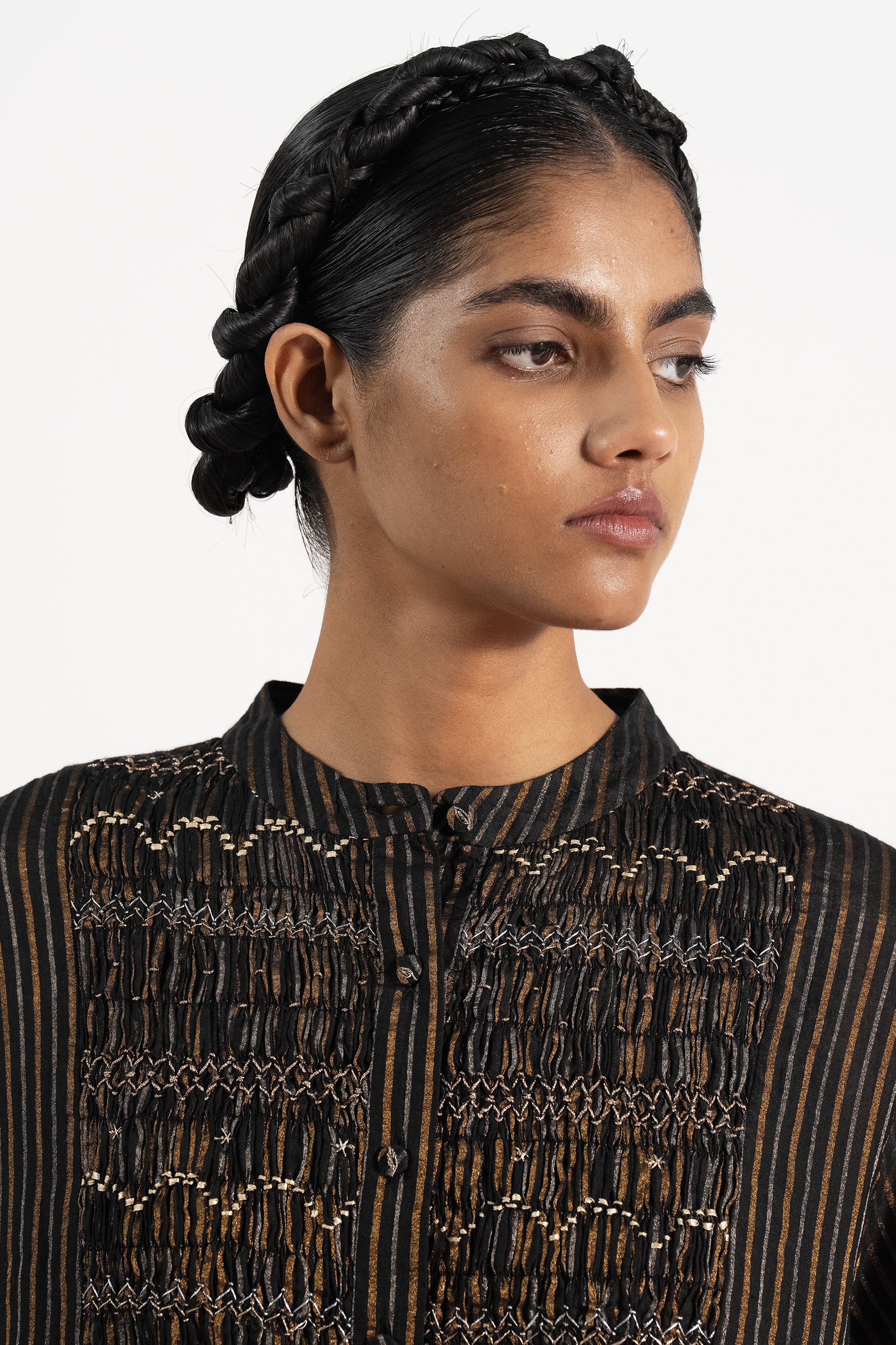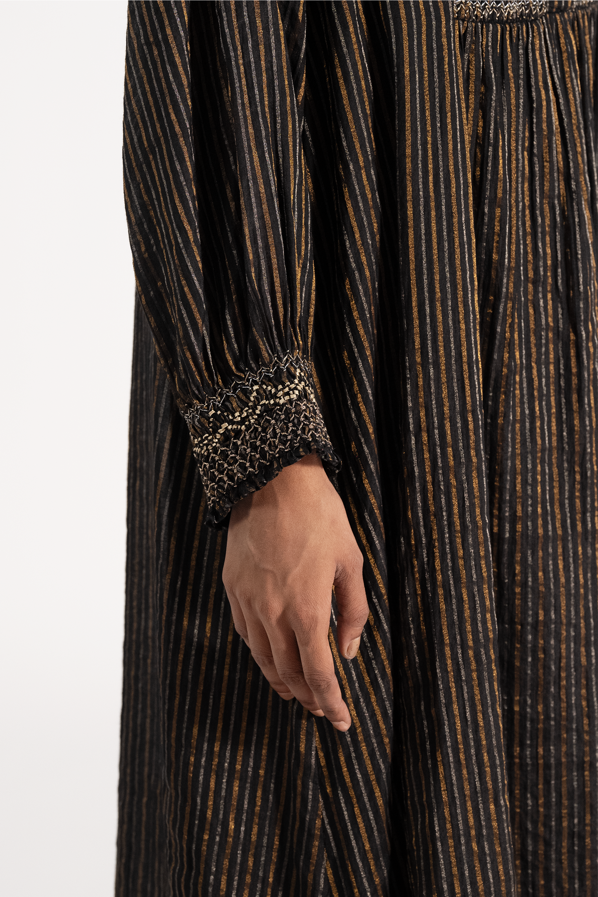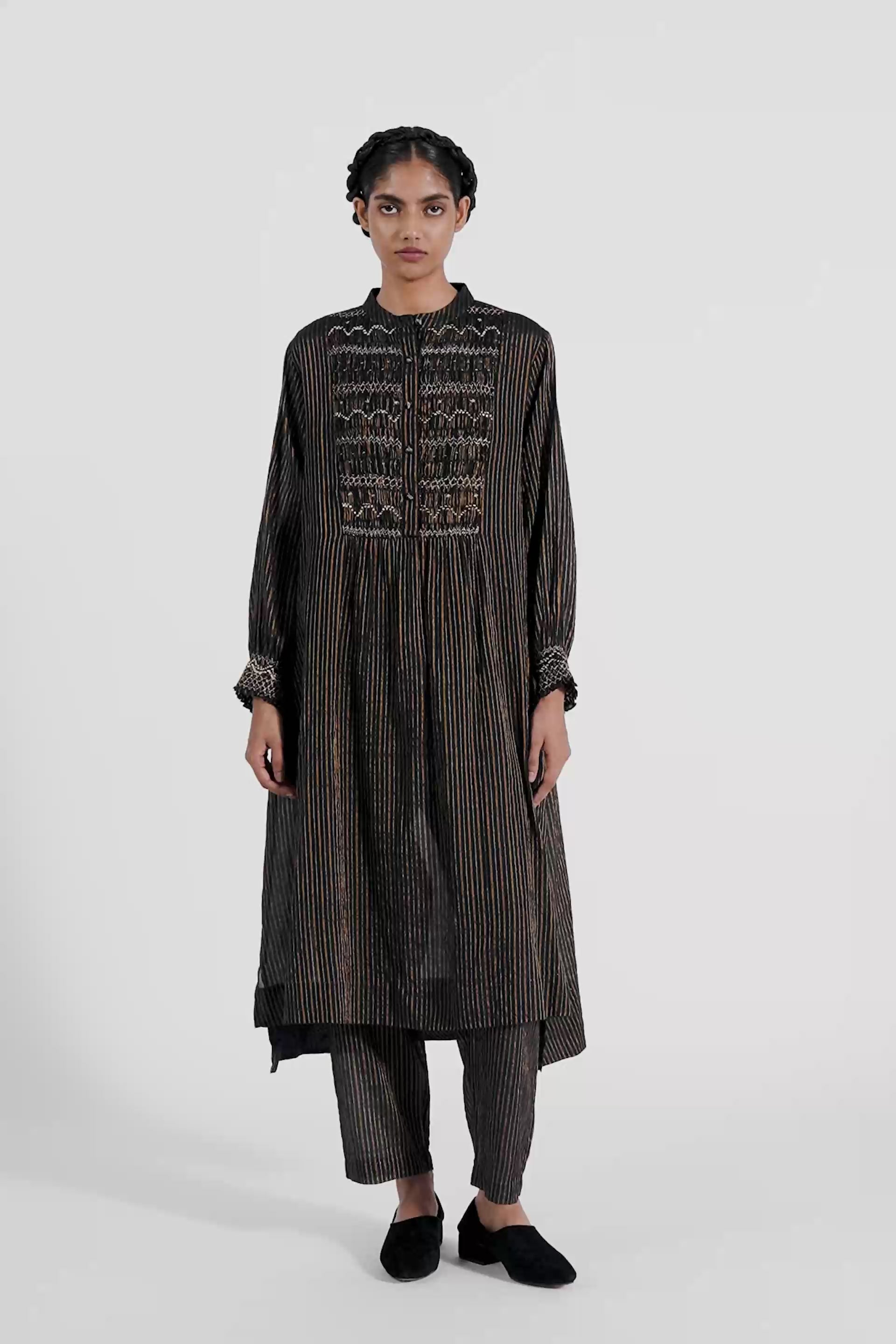 Midi Dress In Cotton Silk Thick And Thin Zari Stripes With Intricate Hand Smocking Detail On The Yoke With Zari Thread Work. Comes Along With A Pair Of Straight Fit Pants In Stripes With Piping Detail On The Side Seams.