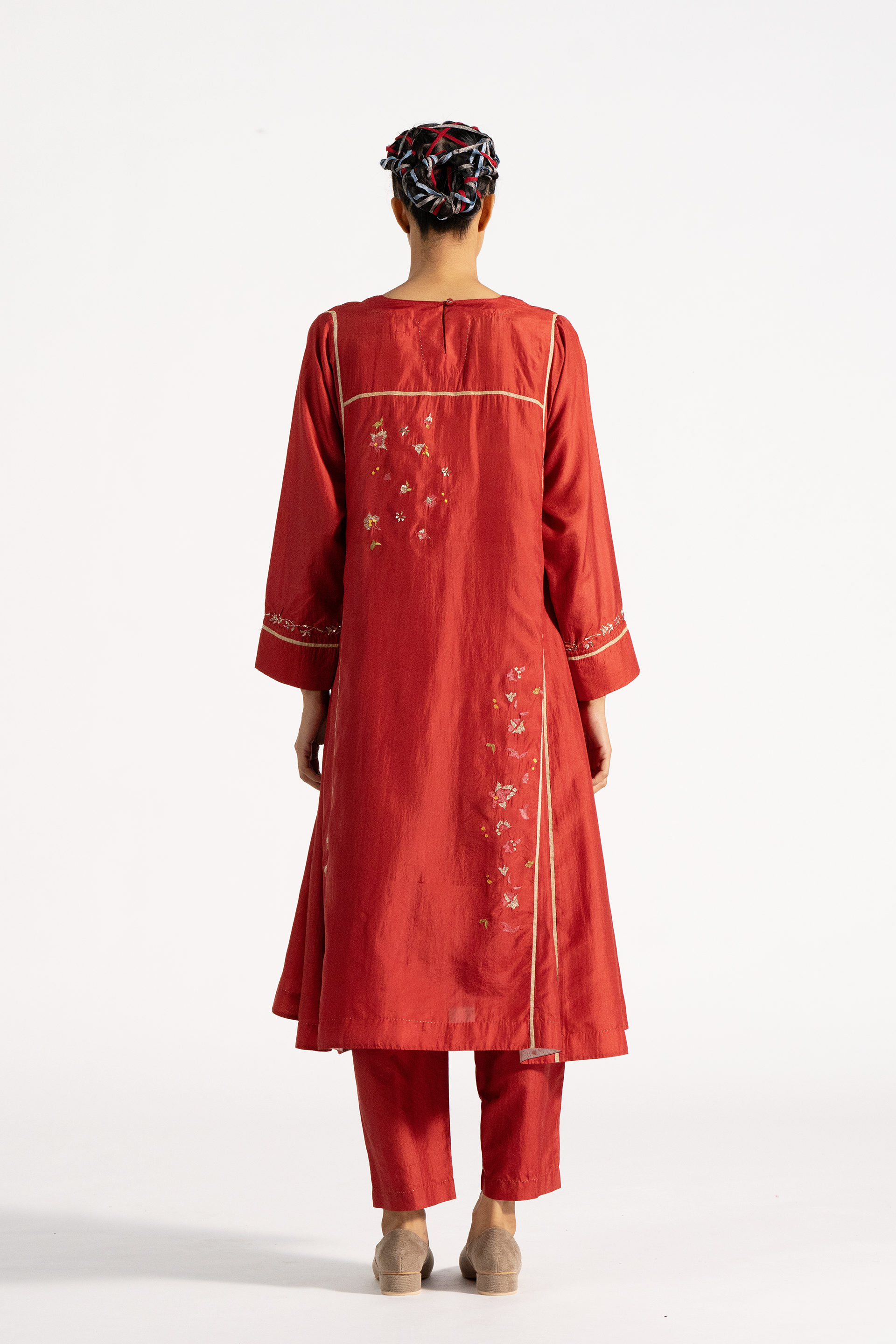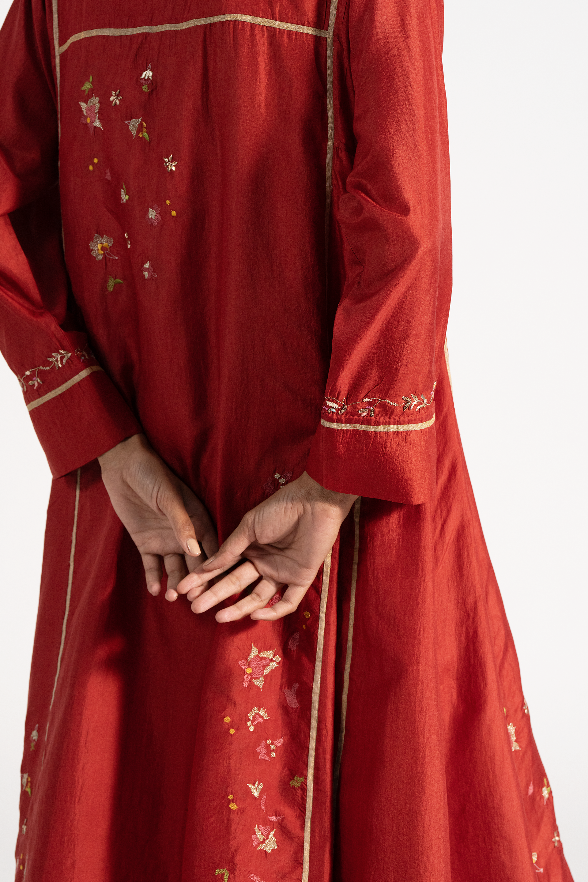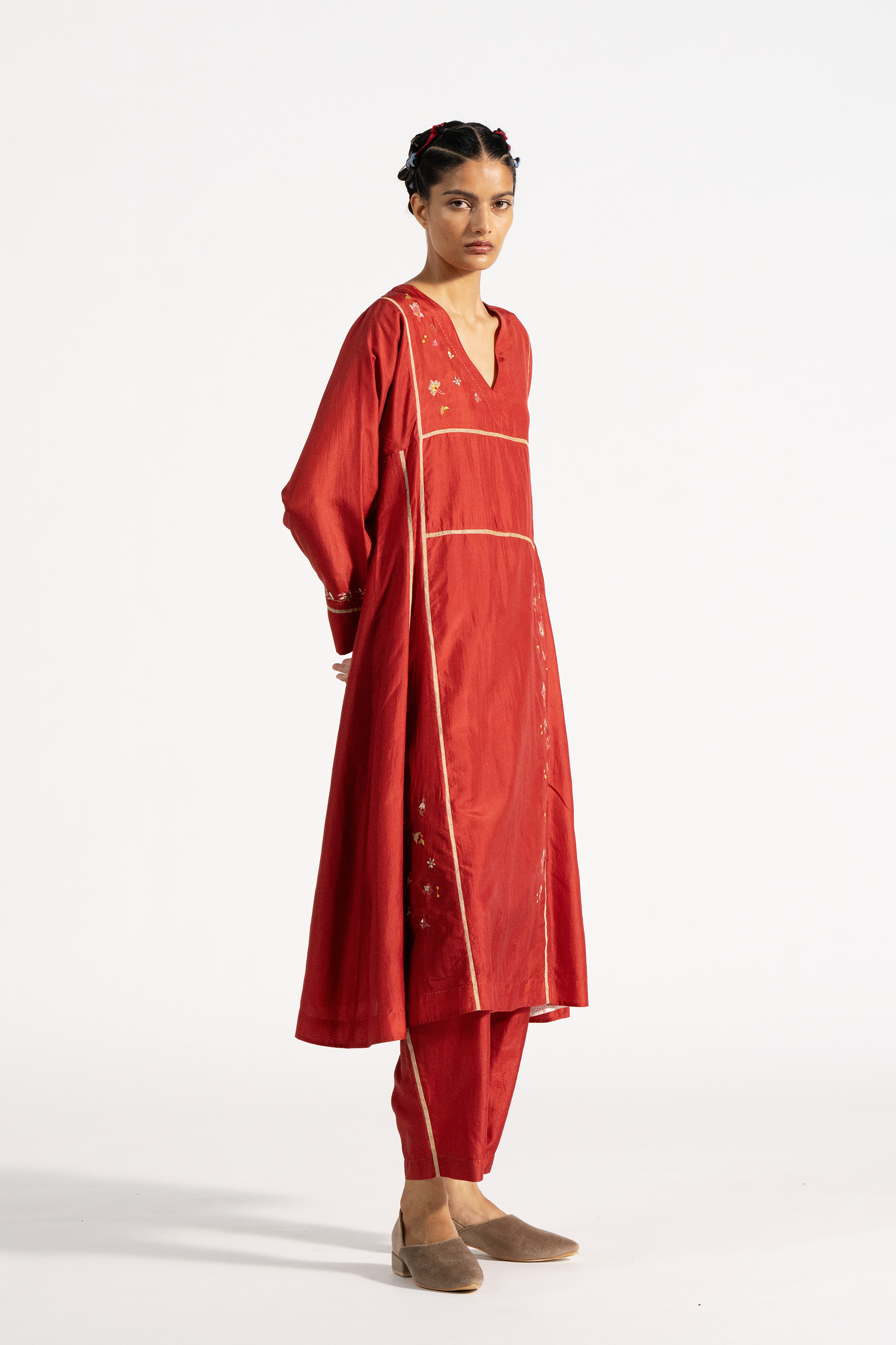 Relaxed fit kurta dress with side panels and embroidery. Comes with pleated poppy pants.