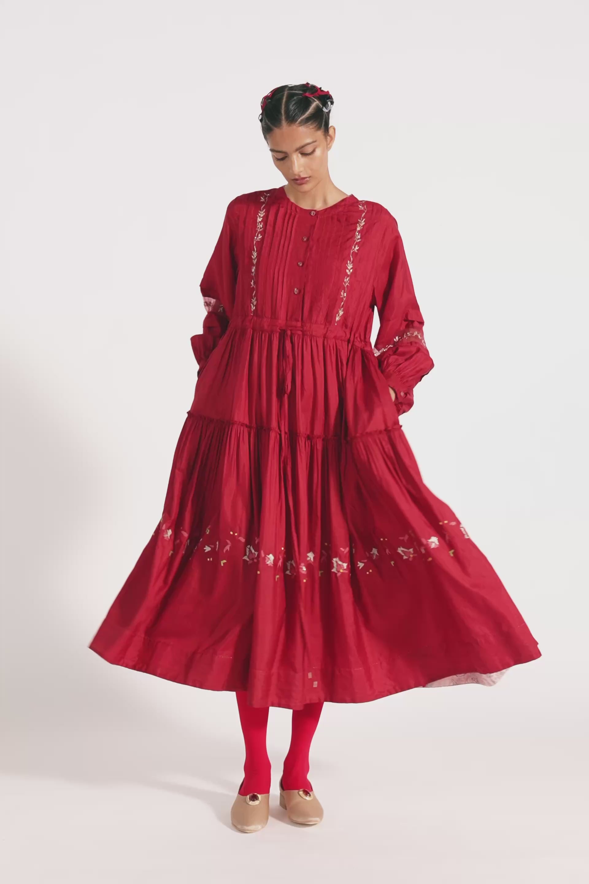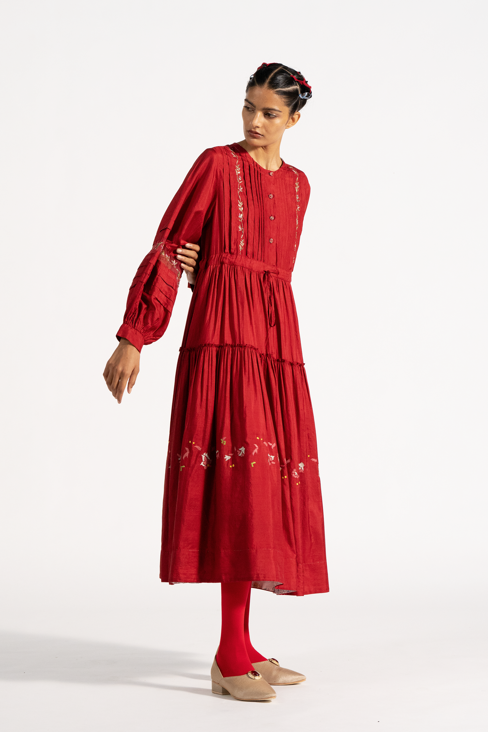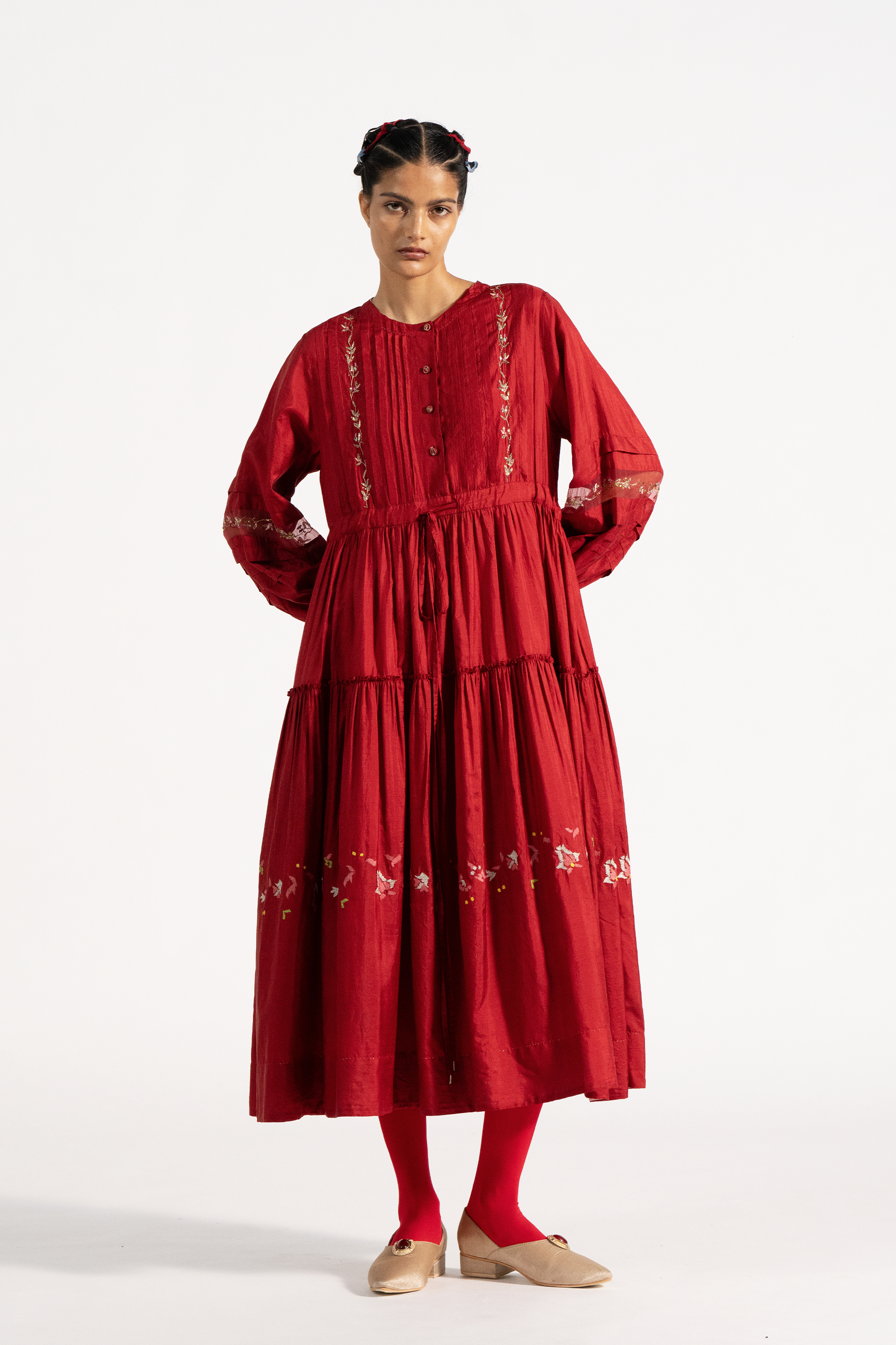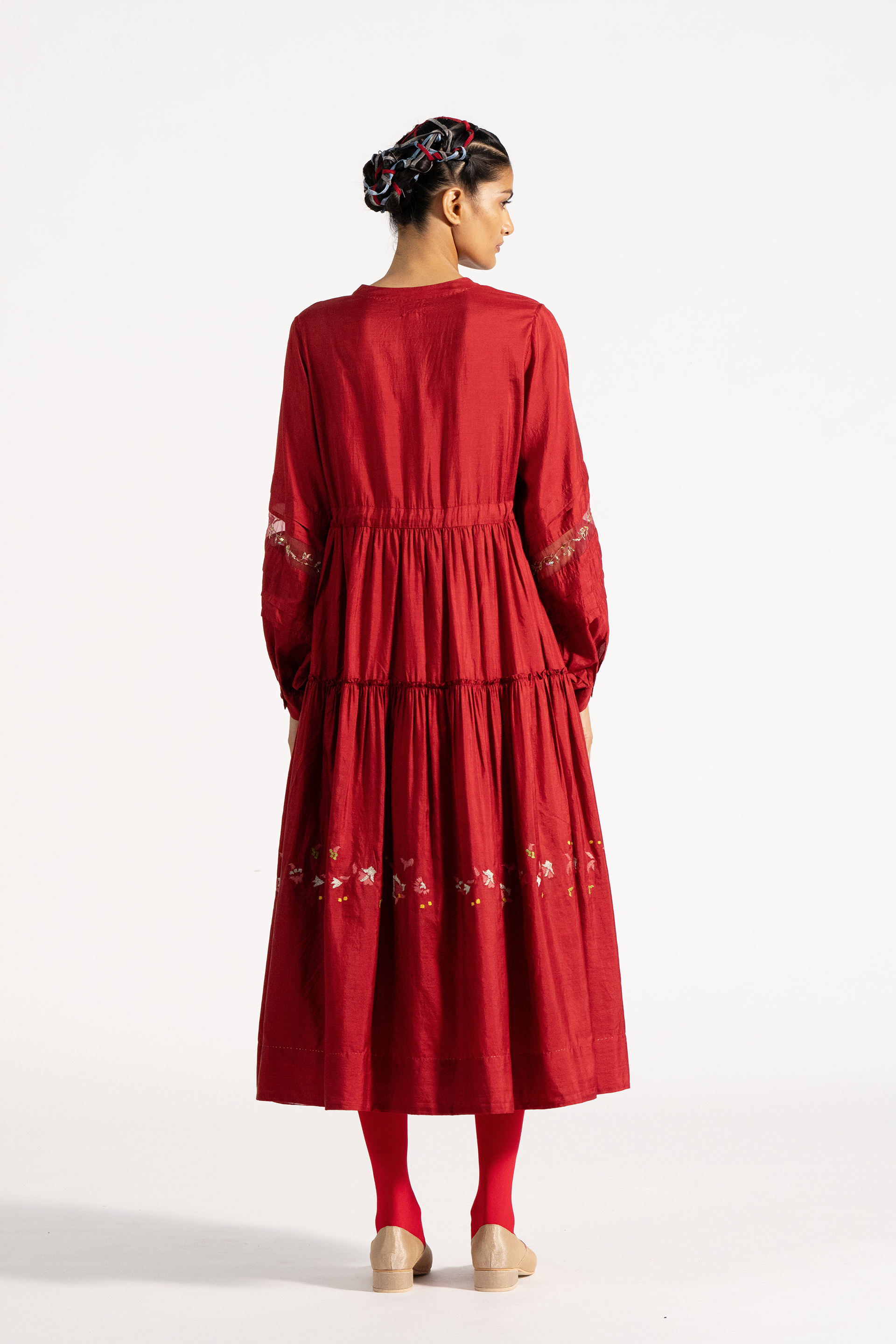 Round neck with tie up detail dress in silk blend with multicolor embroidery detail on sleeve, front and hem.